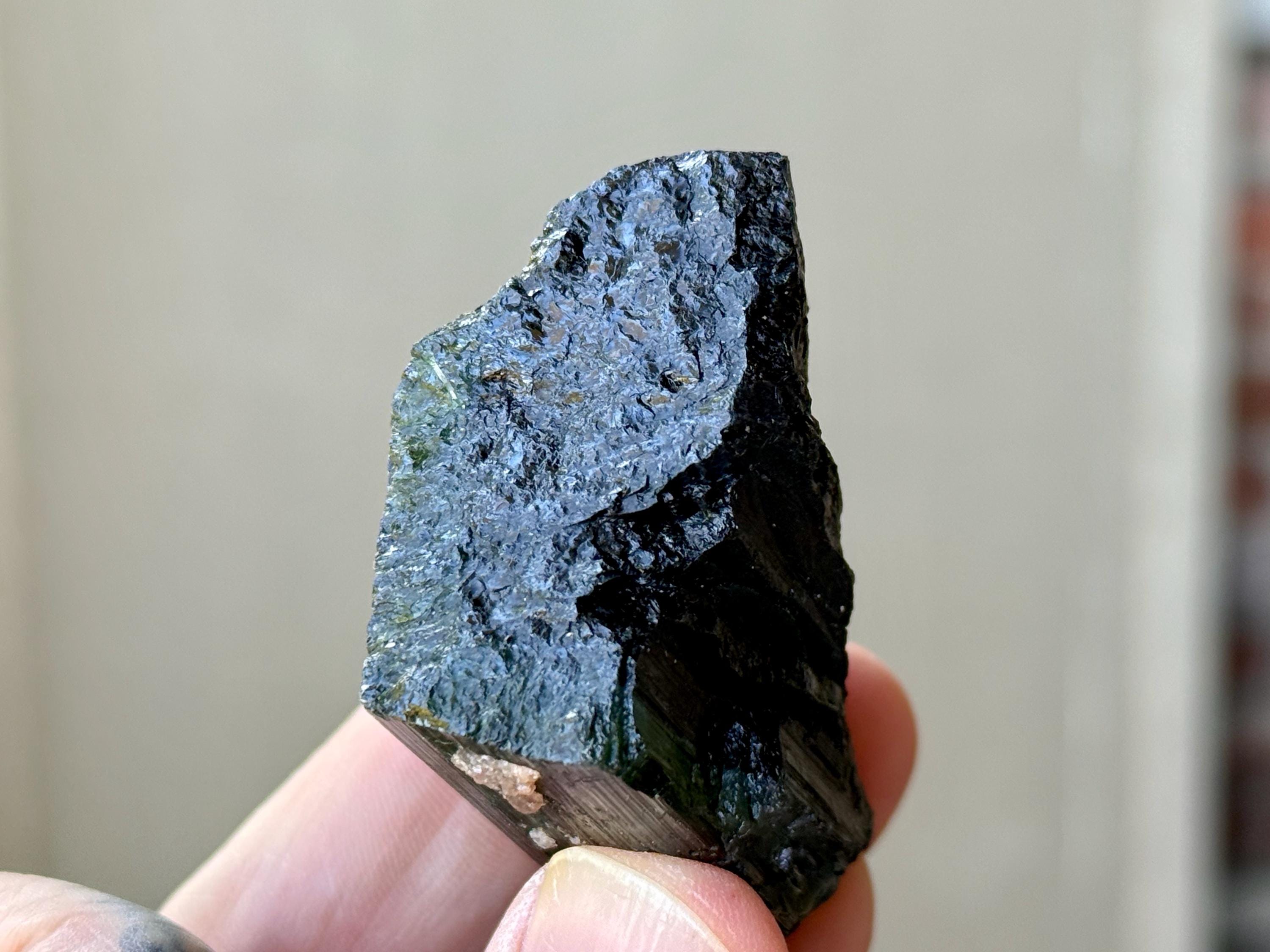 This natural, dark Green Tourmaline crystal comes from a recent find in Coronel Murta, Minas Gerais, Brazil.