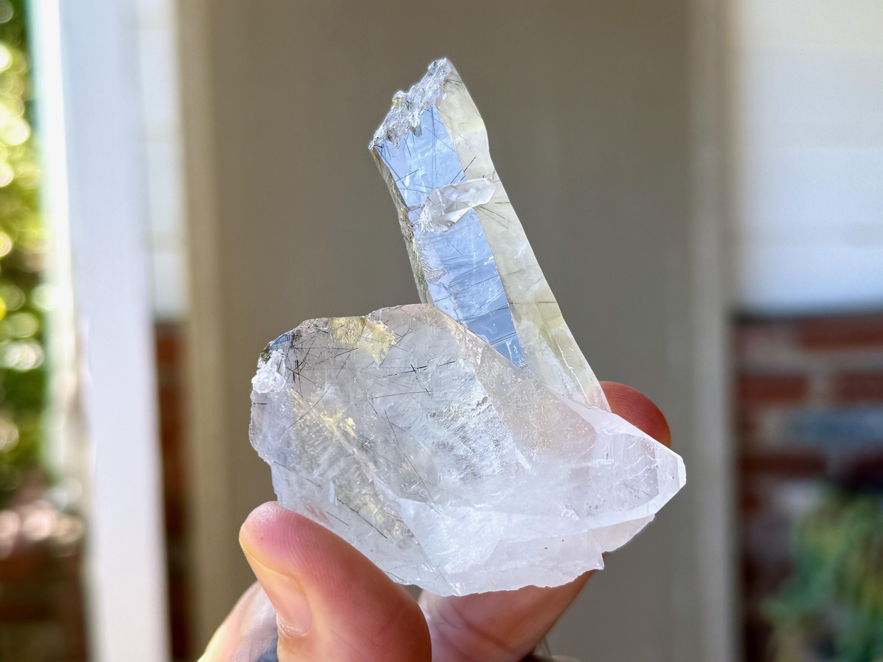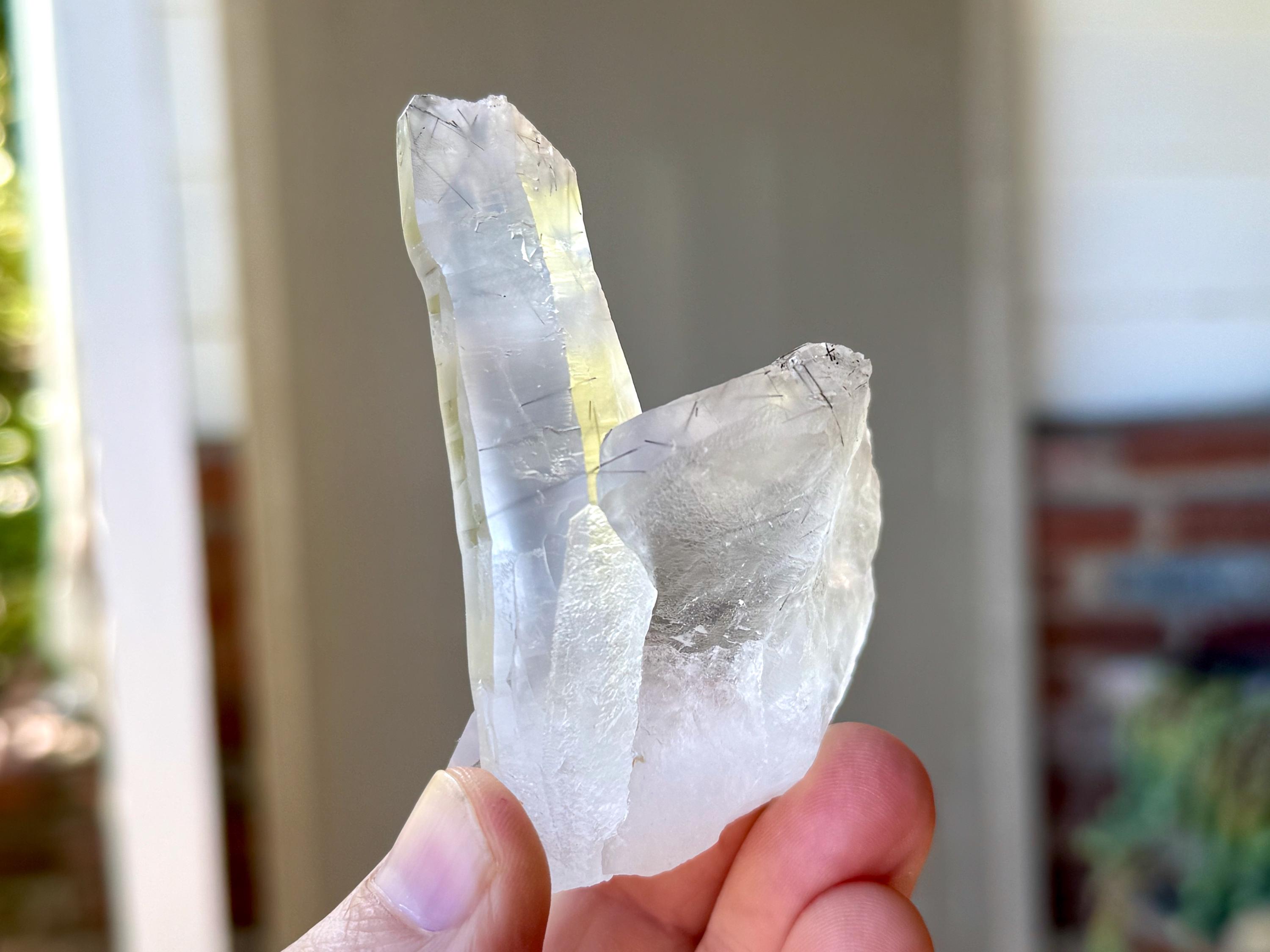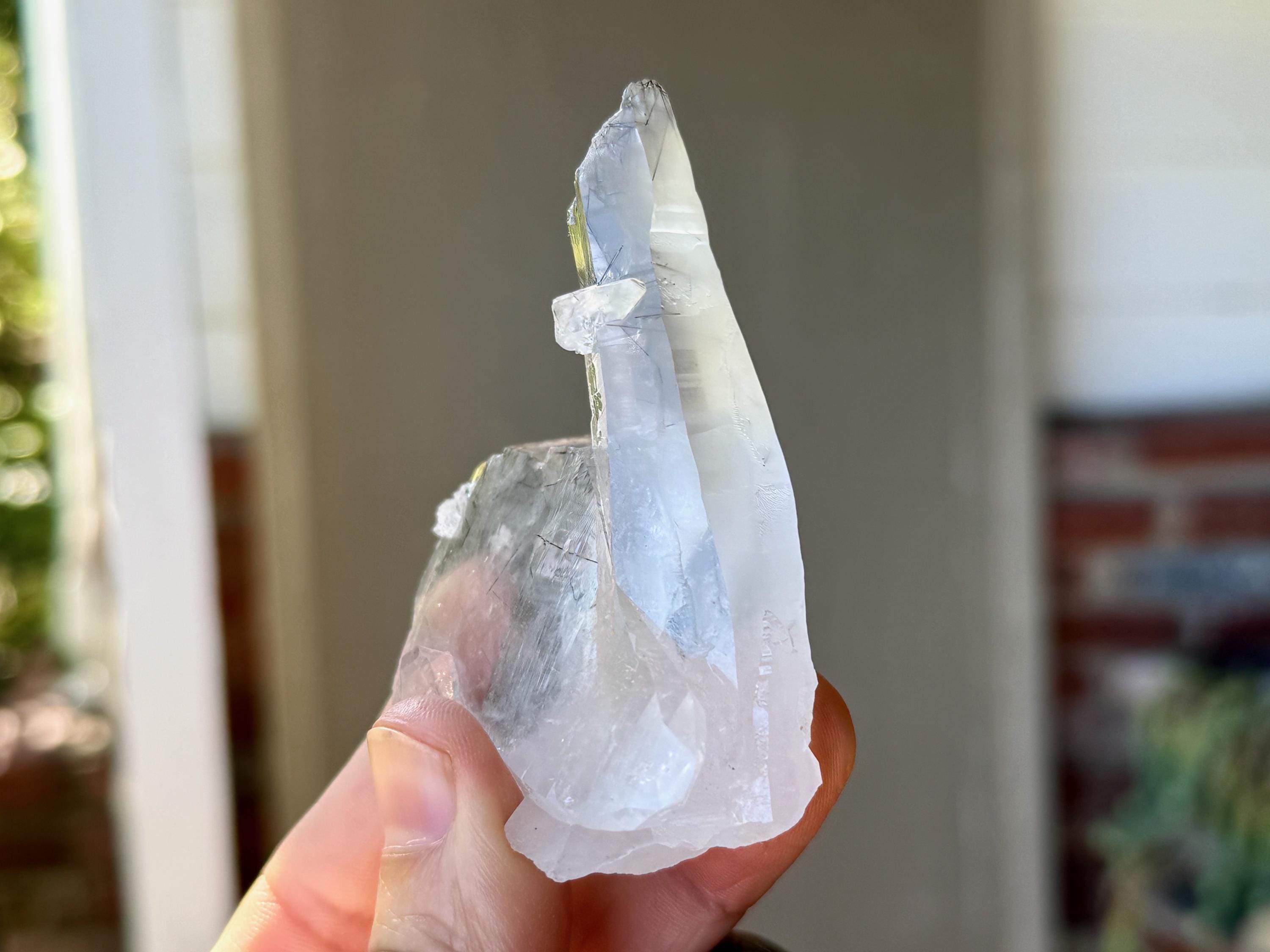 A very unique formation to this water-clear Laser Quartz crystal with a sprinkling of Black Tourmaline needles within. This crystal exhibits superb luster, as is characteristic of the crystals from this locale. The formation consists of an elongated crystal point that has a base embedded within a broad secondary crystal, making this a bit of a "twin" formation.