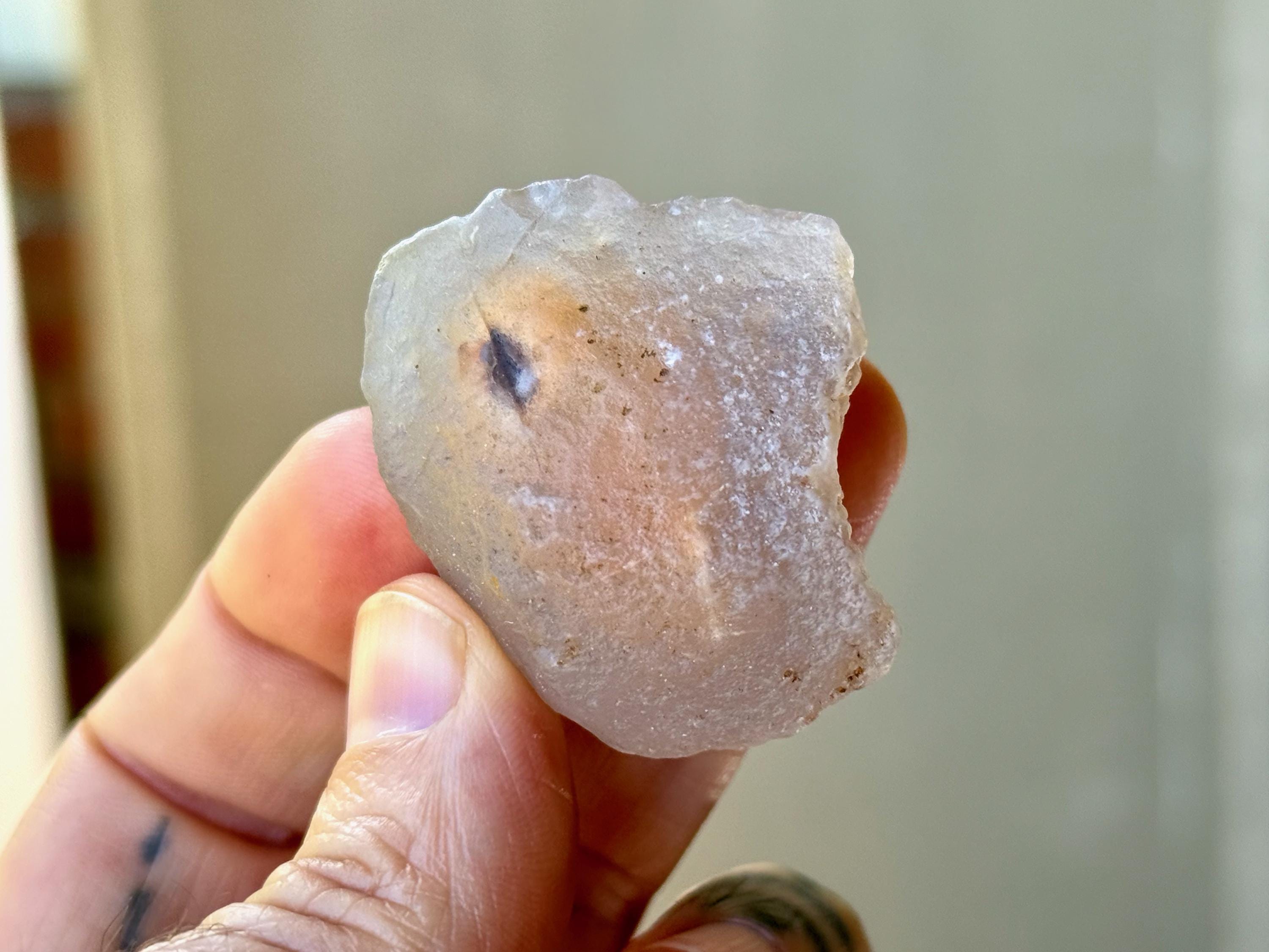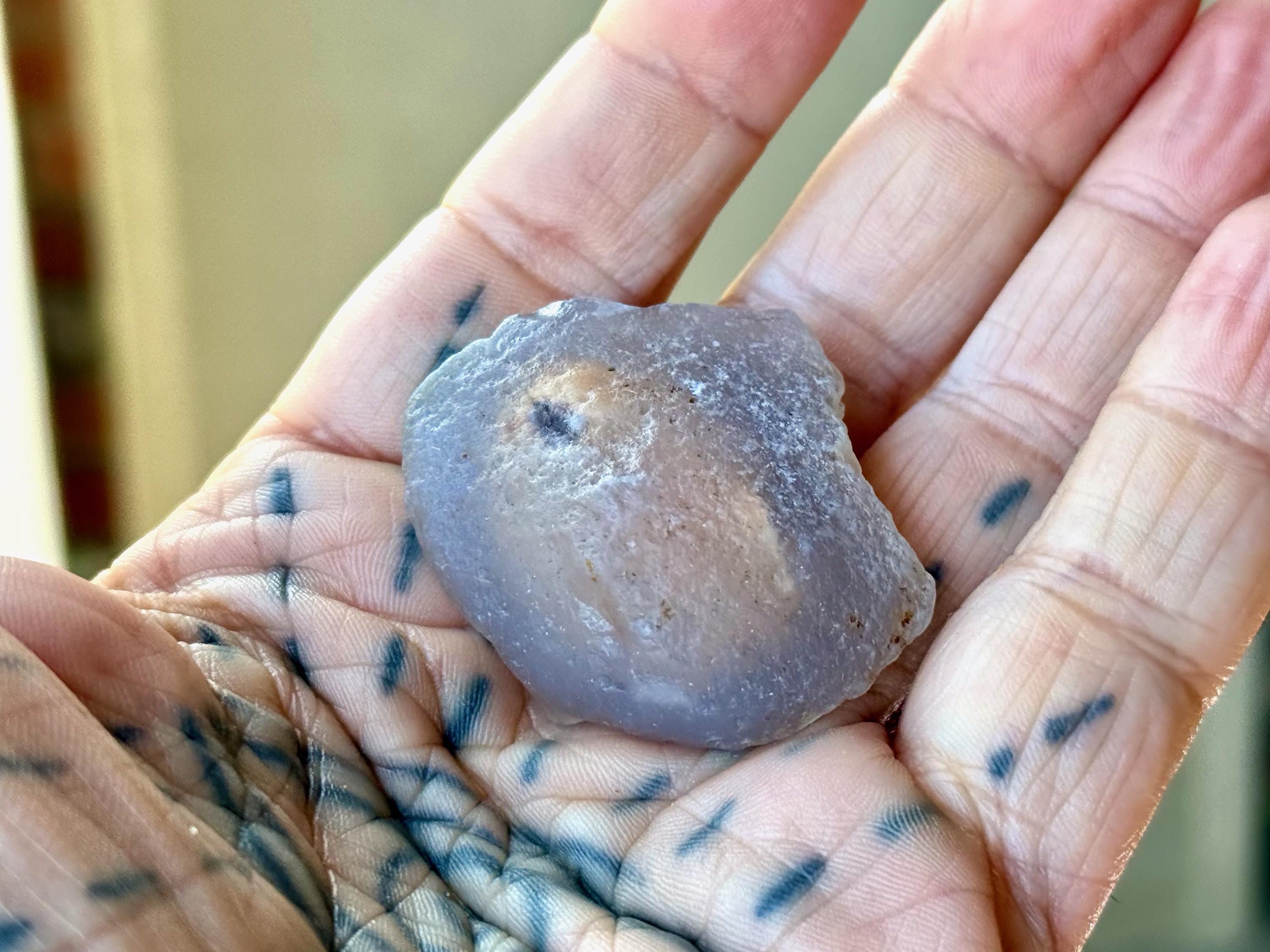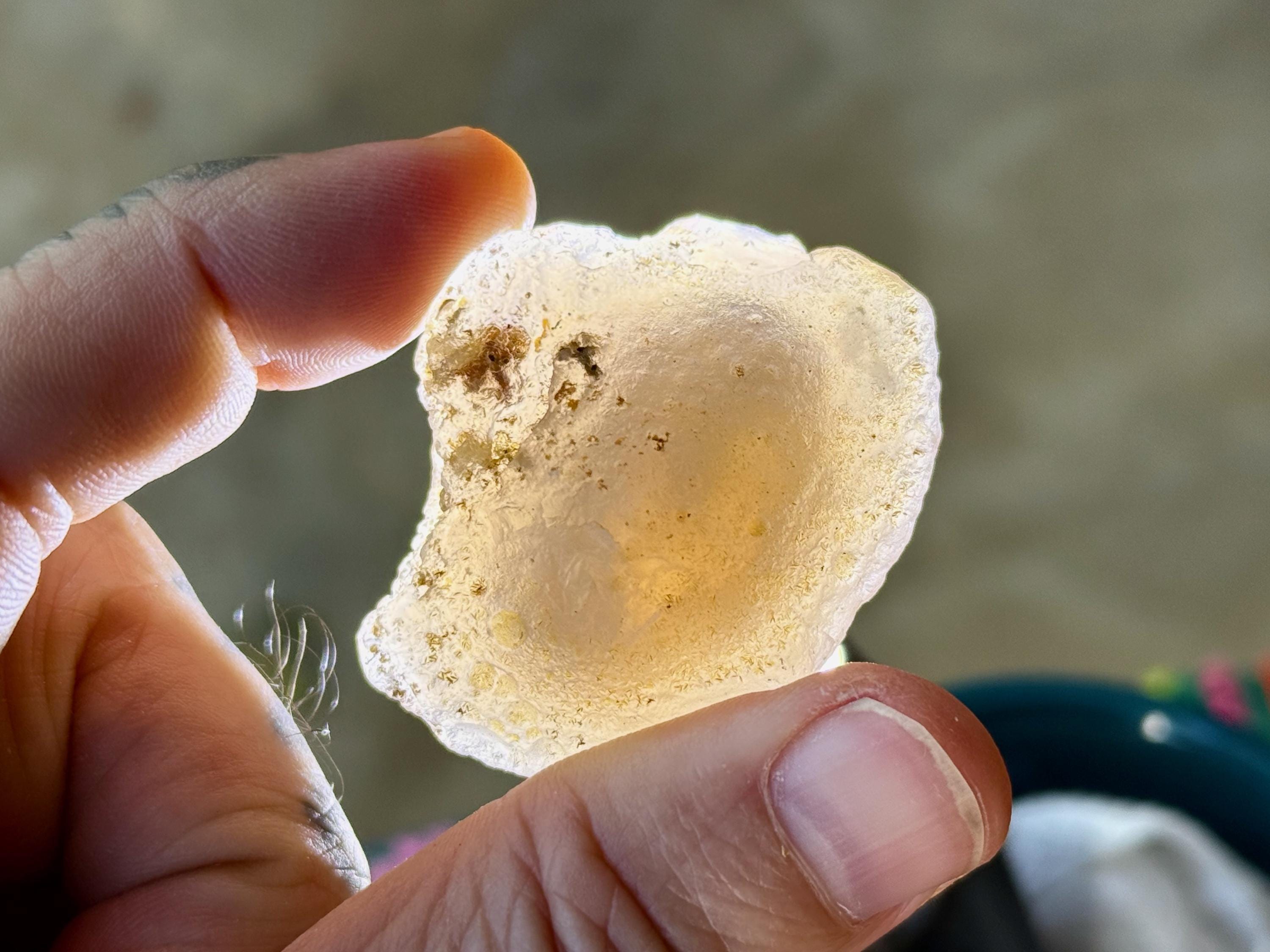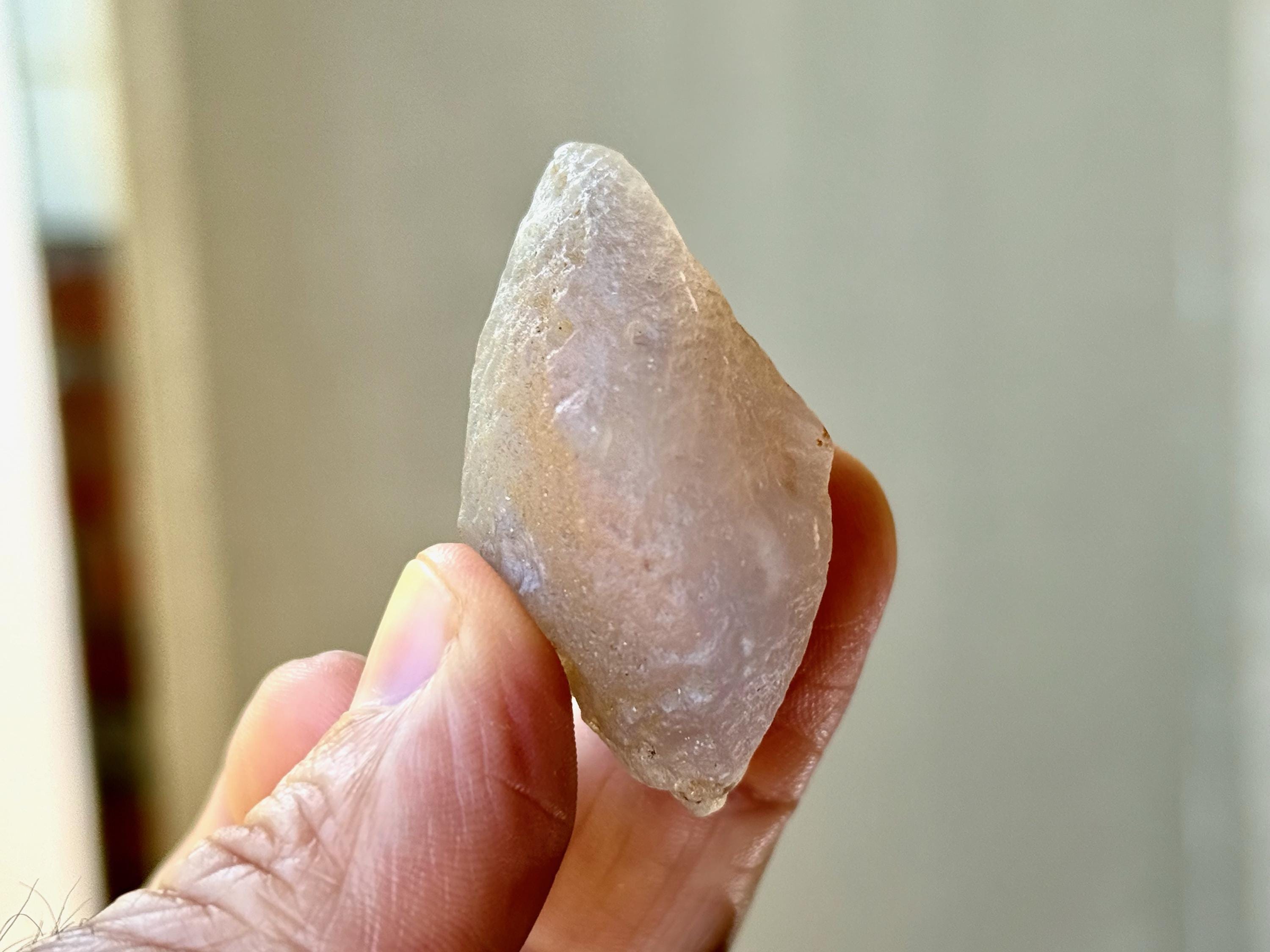 When backlit, as in Photos 1, 3-4, we can see how nice the translucency is. And when we hold it up to the light and play with it a bit (sometimes you gotta give it a tap), we can see the "running sand" moving within the piece. The video shows this, and it will be even more easy to see in person.