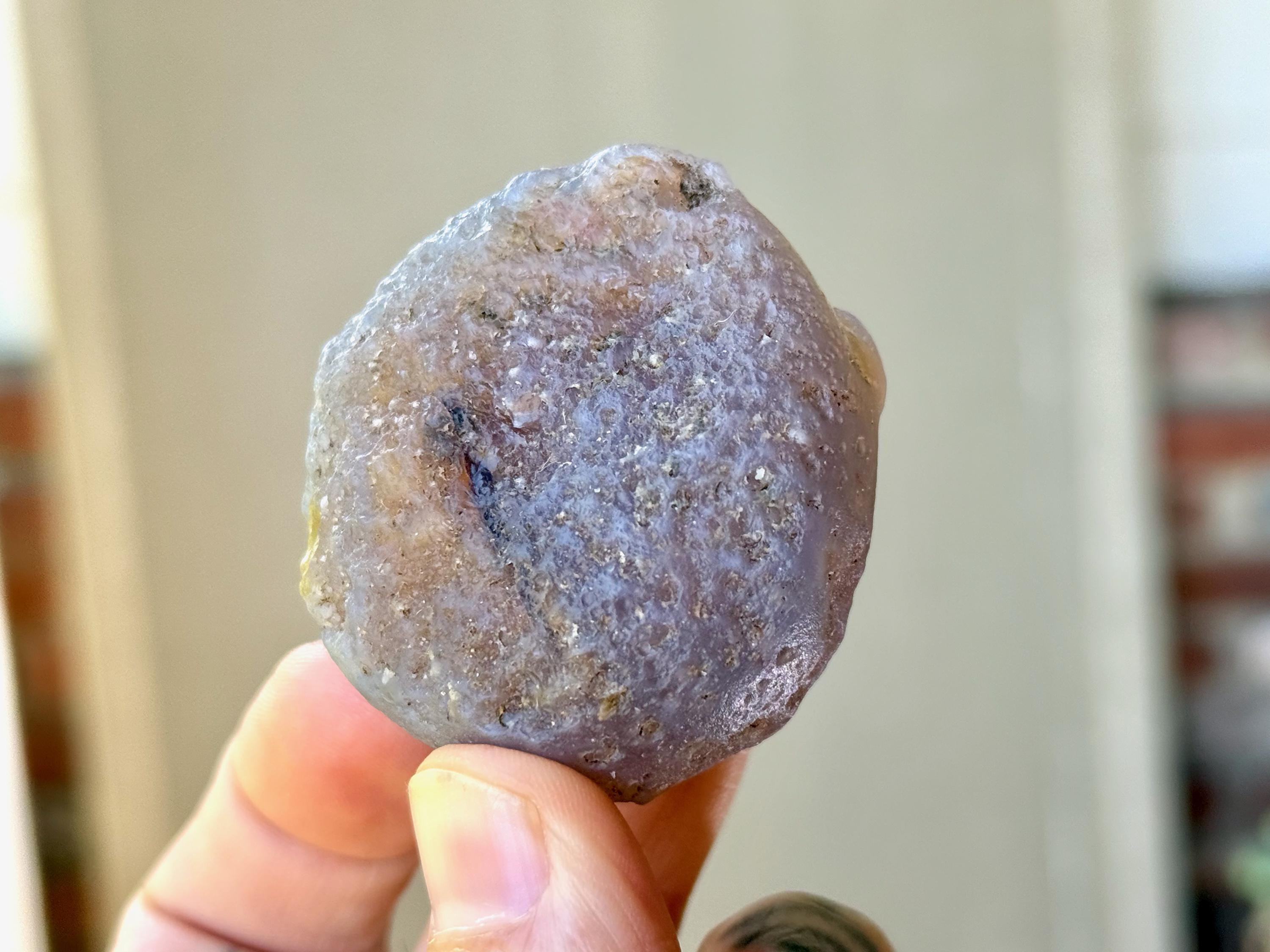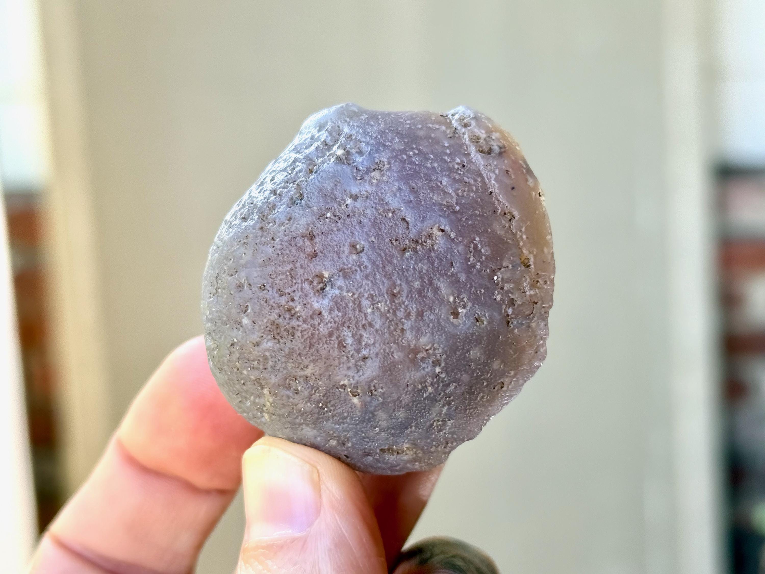 One of the largest Running Sand Gobis from this collection, this crystal possesses a globular, slightly flattened formation with a beautiful purplish-gray color. When backlit, as in Photos 1, 3-4, we can see how nice the translucency is. And when we hold it up to the light and play with it a bit (sometimes you gotta give it a tap), we can see the "running sand" moving within the piece. The video shows this, and it will be even more easy to see in person.