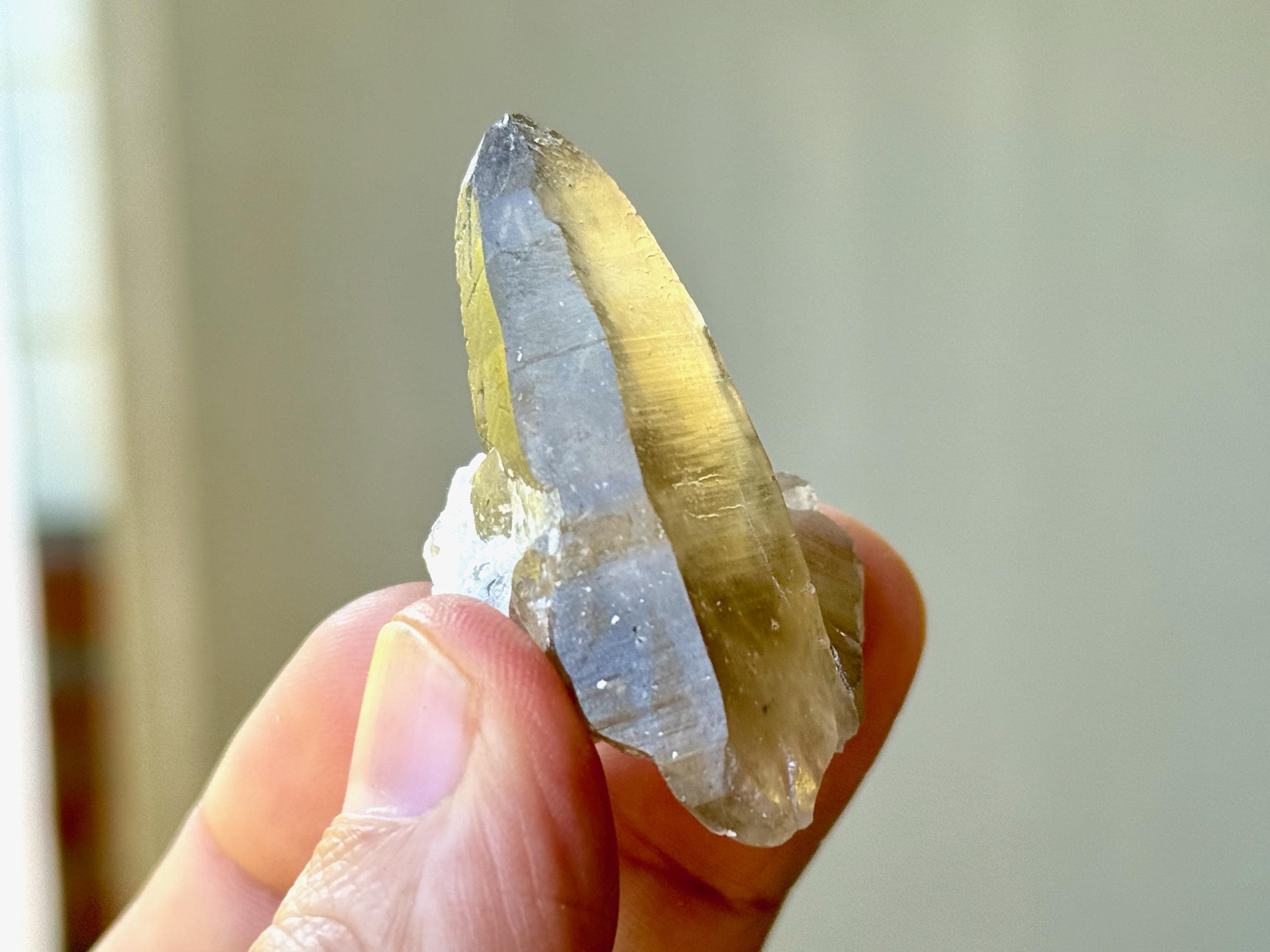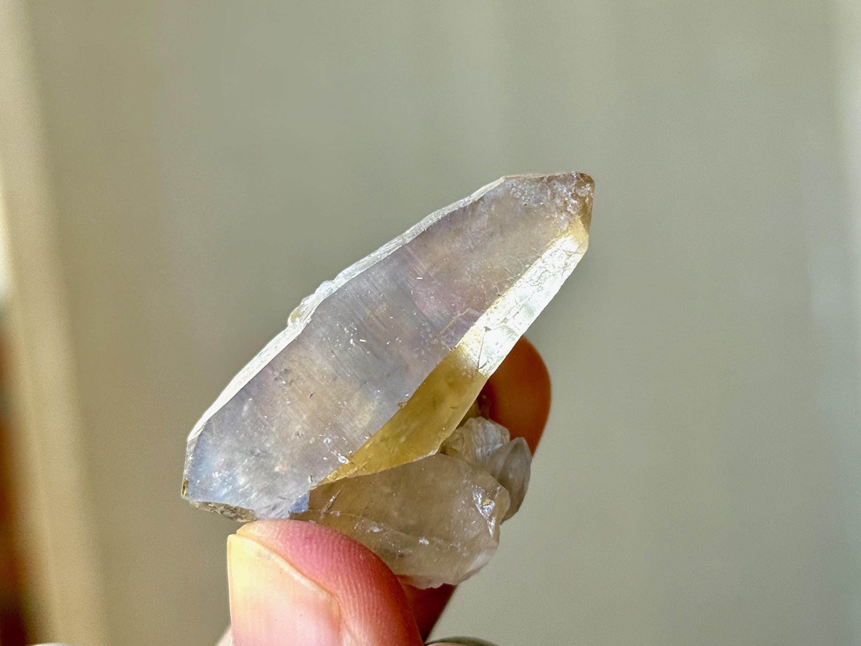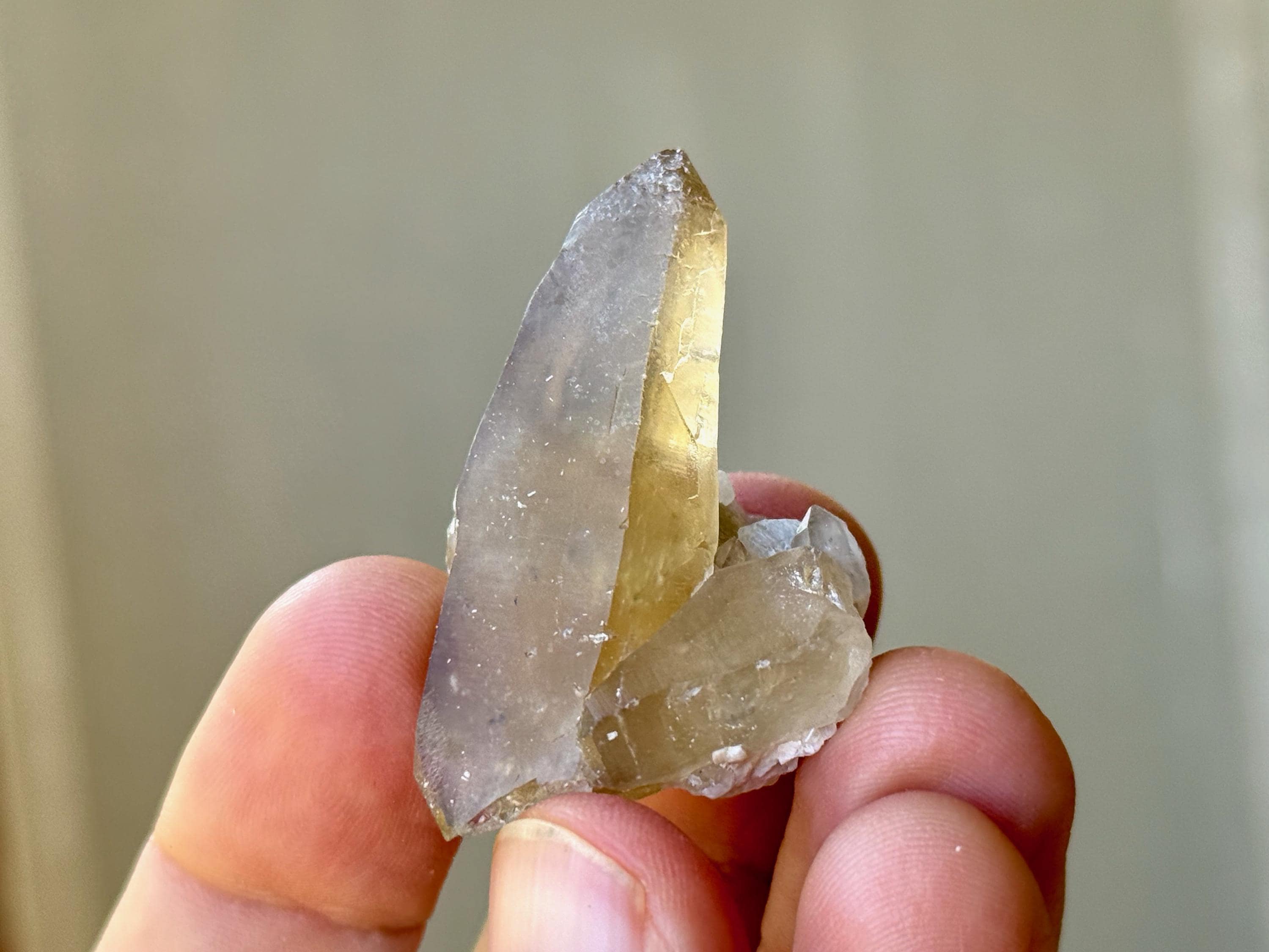 Gorgeous golden color to this lovely BG3 Citrine in a tapered point formation. At the base there's an inclusion of white Feldspar. Excellent termination.
