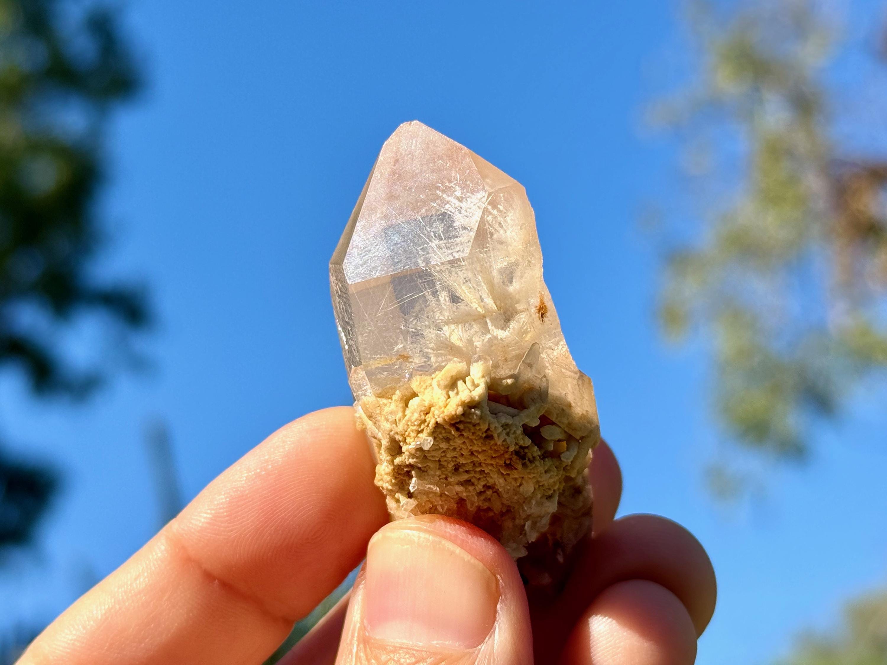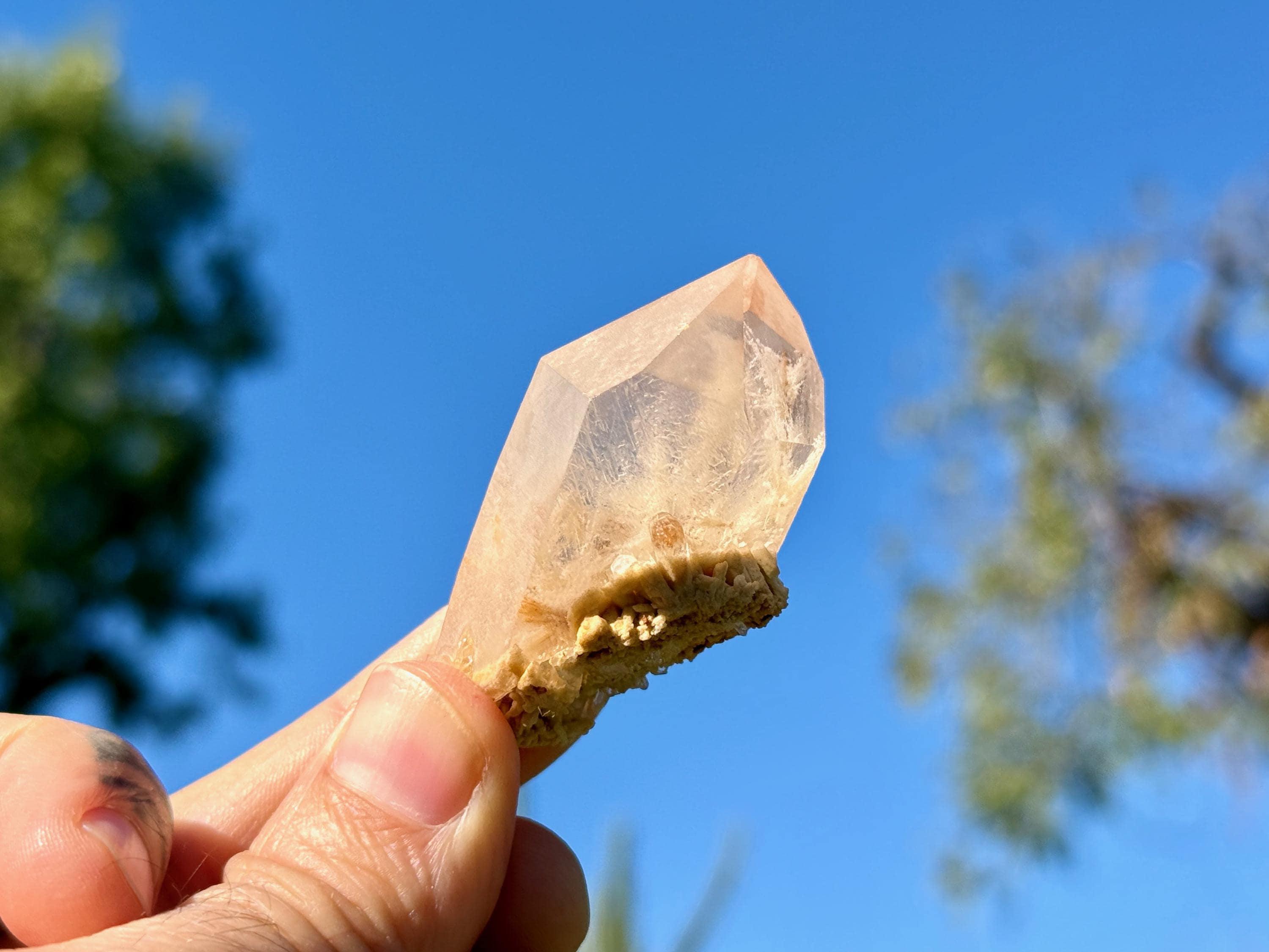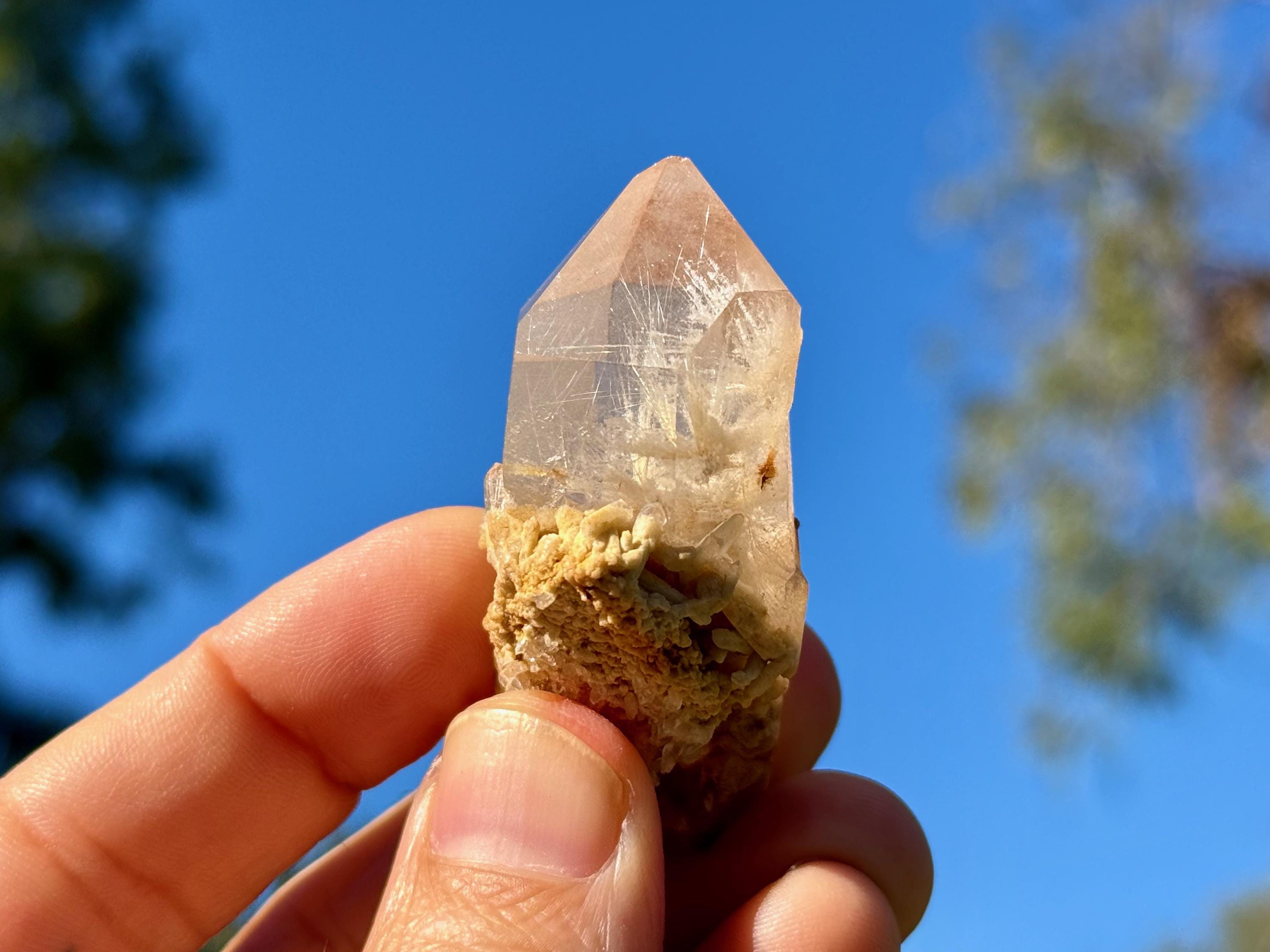 Half of this crystal has a bit of a matte "frost" on the exterior, but the back portion is completely crystal clear, allowing us to peer inside and enjoy all the inclusions within. In direct, natural sunlight, the Silver Rutile inclusions here really sparkle (Photos 3-7). And on the base we can see these same inclusions presented on the exterior.