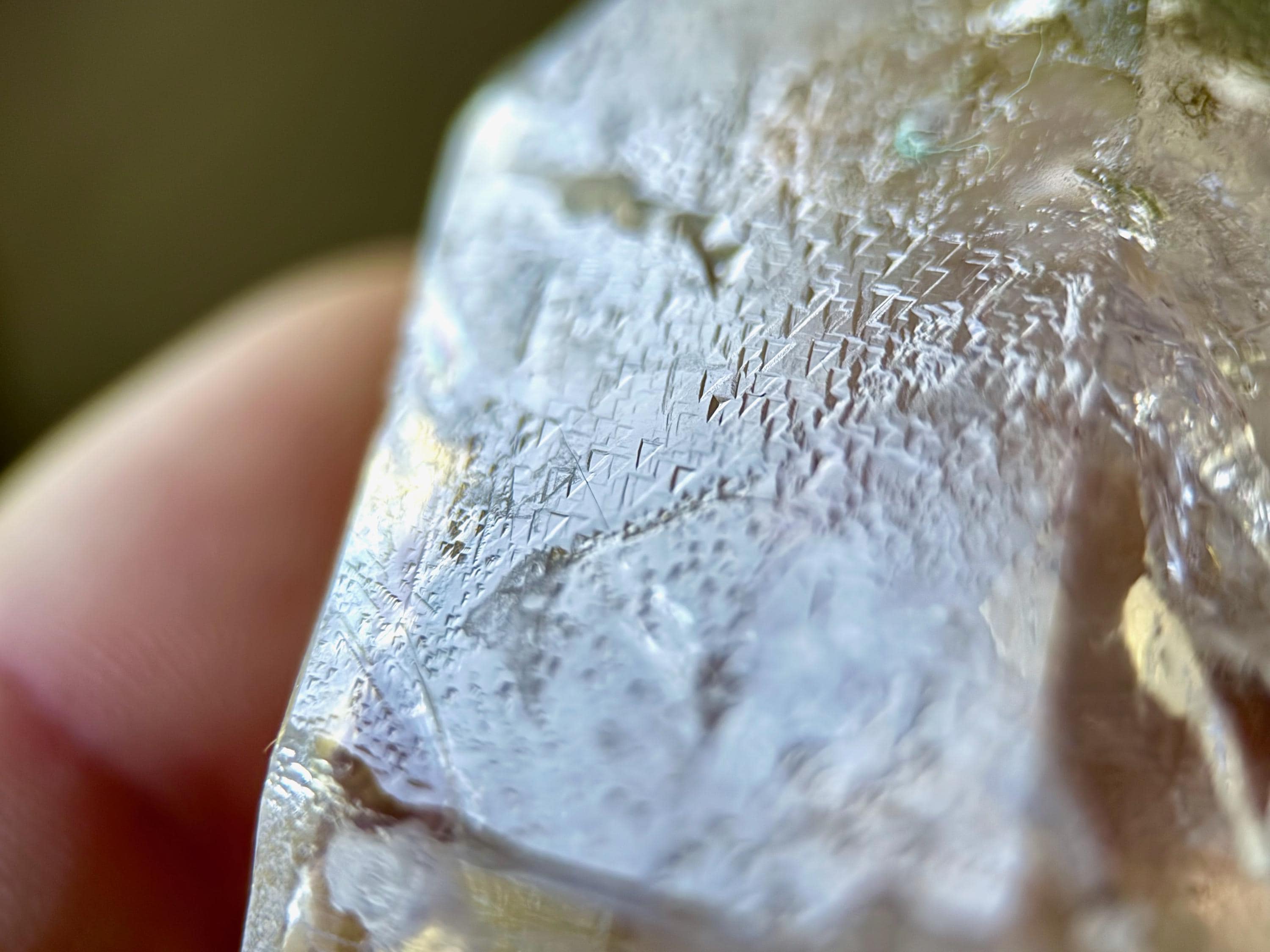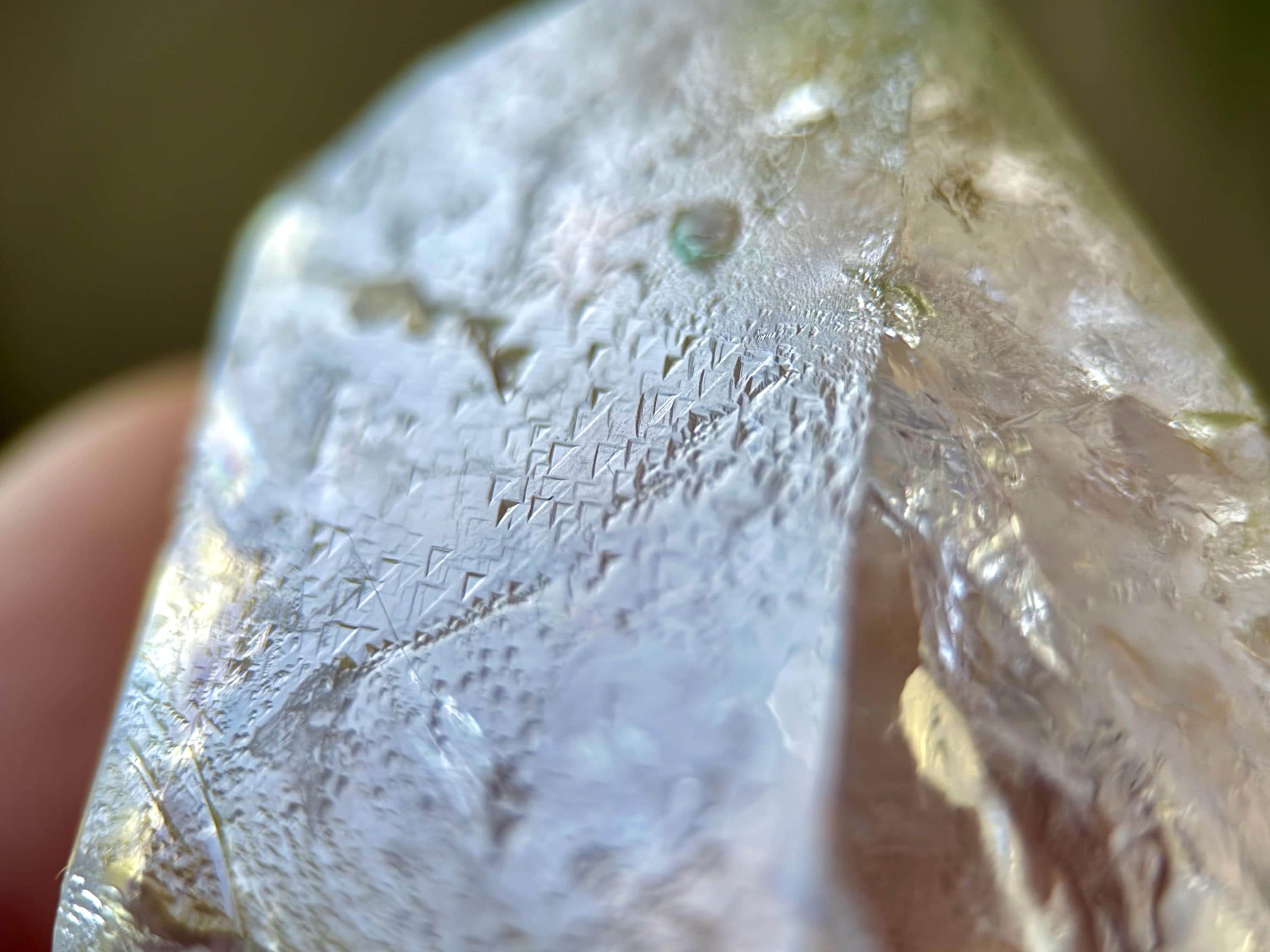 Of course what is most special about this piece is the multitude of trigons on its main facets. These imprints are mild and quite small, and while many can be seen with the naked eye, taking a jeweler's loupe or magnifying glass to them will completely reveal their beauty and clarity. We've included several photos taken with a macro lens to show them up close (Photos 2-3, 6-8).