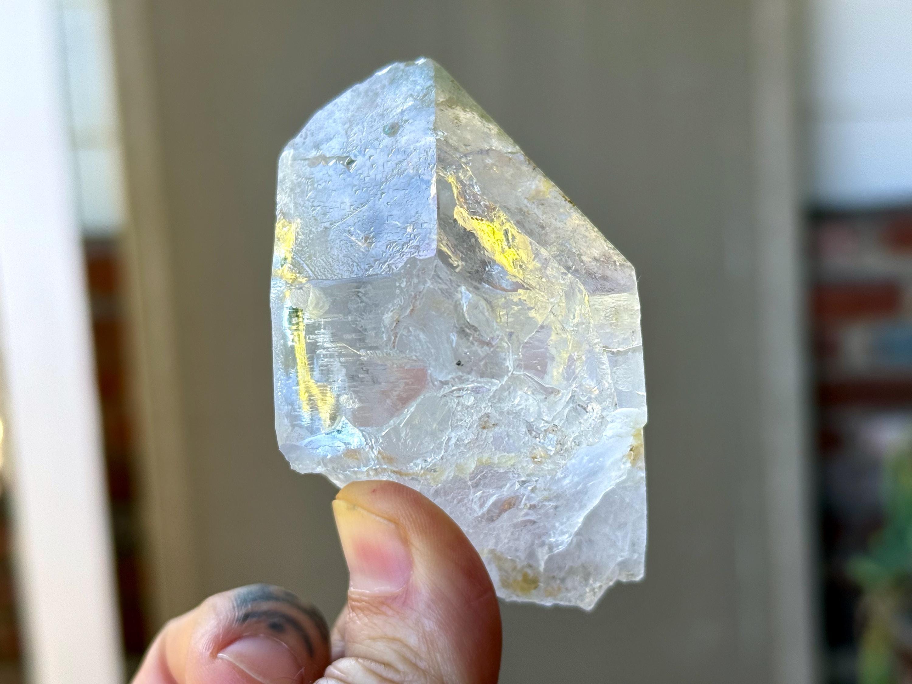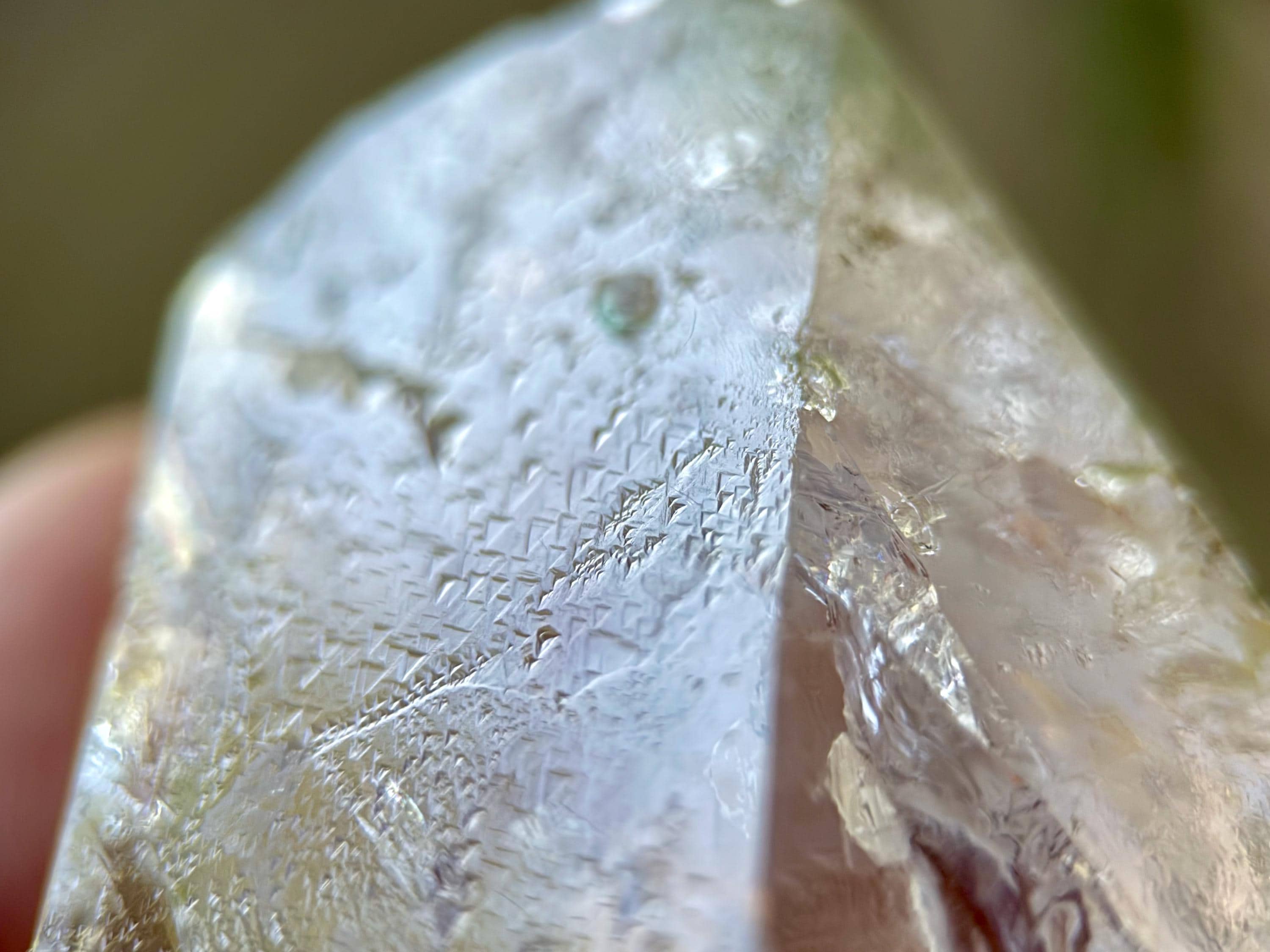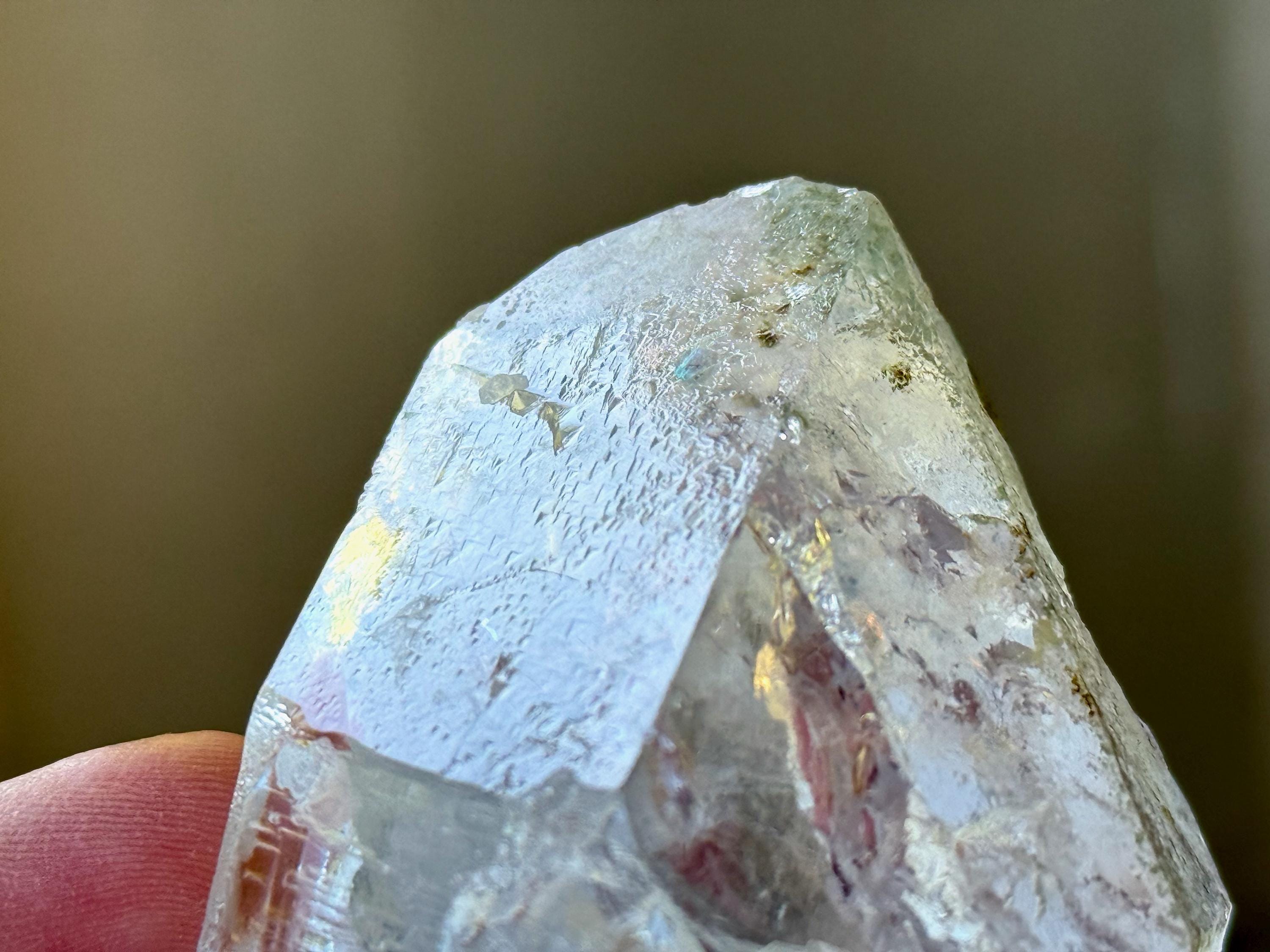 Trigonic Quartz refers to crystals that have "trigons" or upside down triangles deeply etched into the face of the crystal. They are similar to Record Keepers, except Record Keepers are upright triangles and trigons are pointing downward.