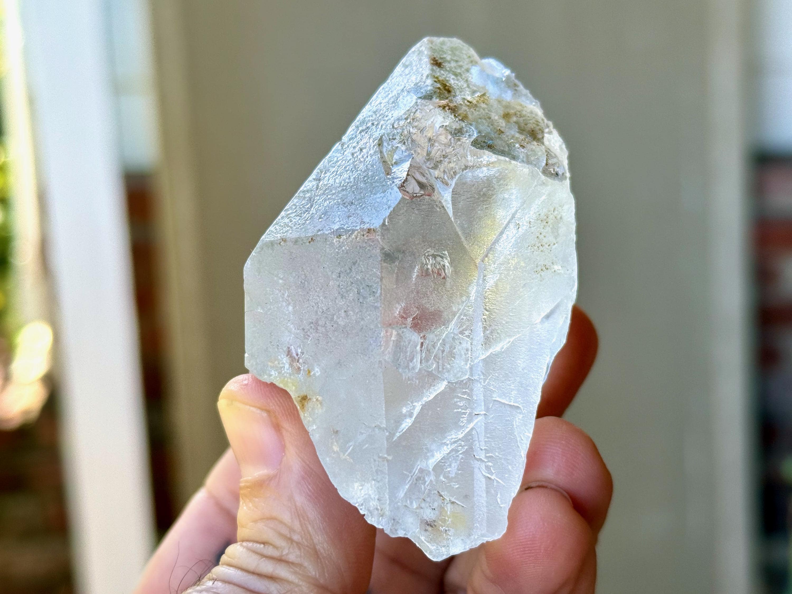 Excellent clarity and superb luster to this handsome Trigonic Dissolution Quartz crystal. This piece features a prominent main facet area with the slightly smoothed and rounded edges that are characteristic of these hydrothermally etched pieces.
