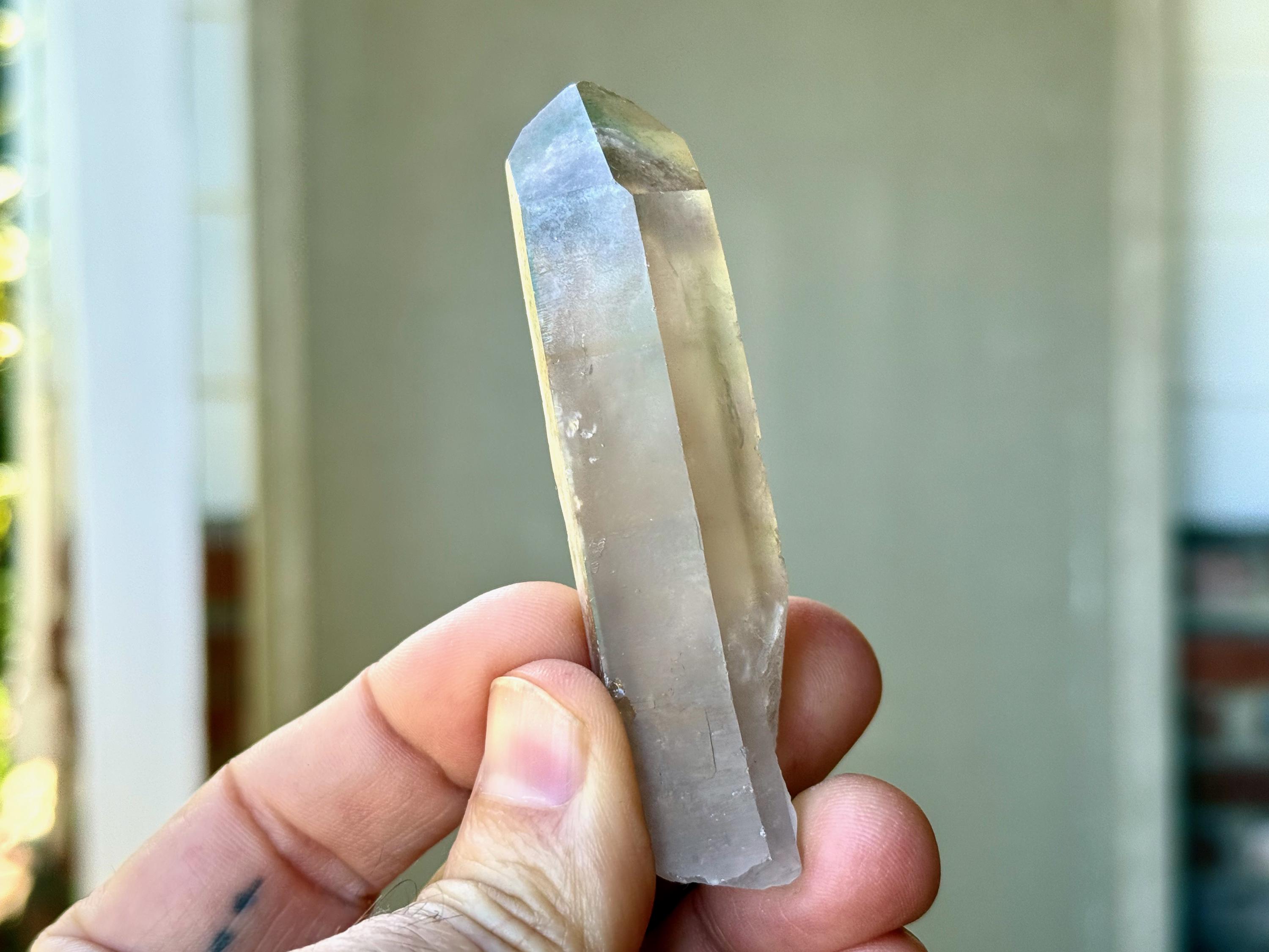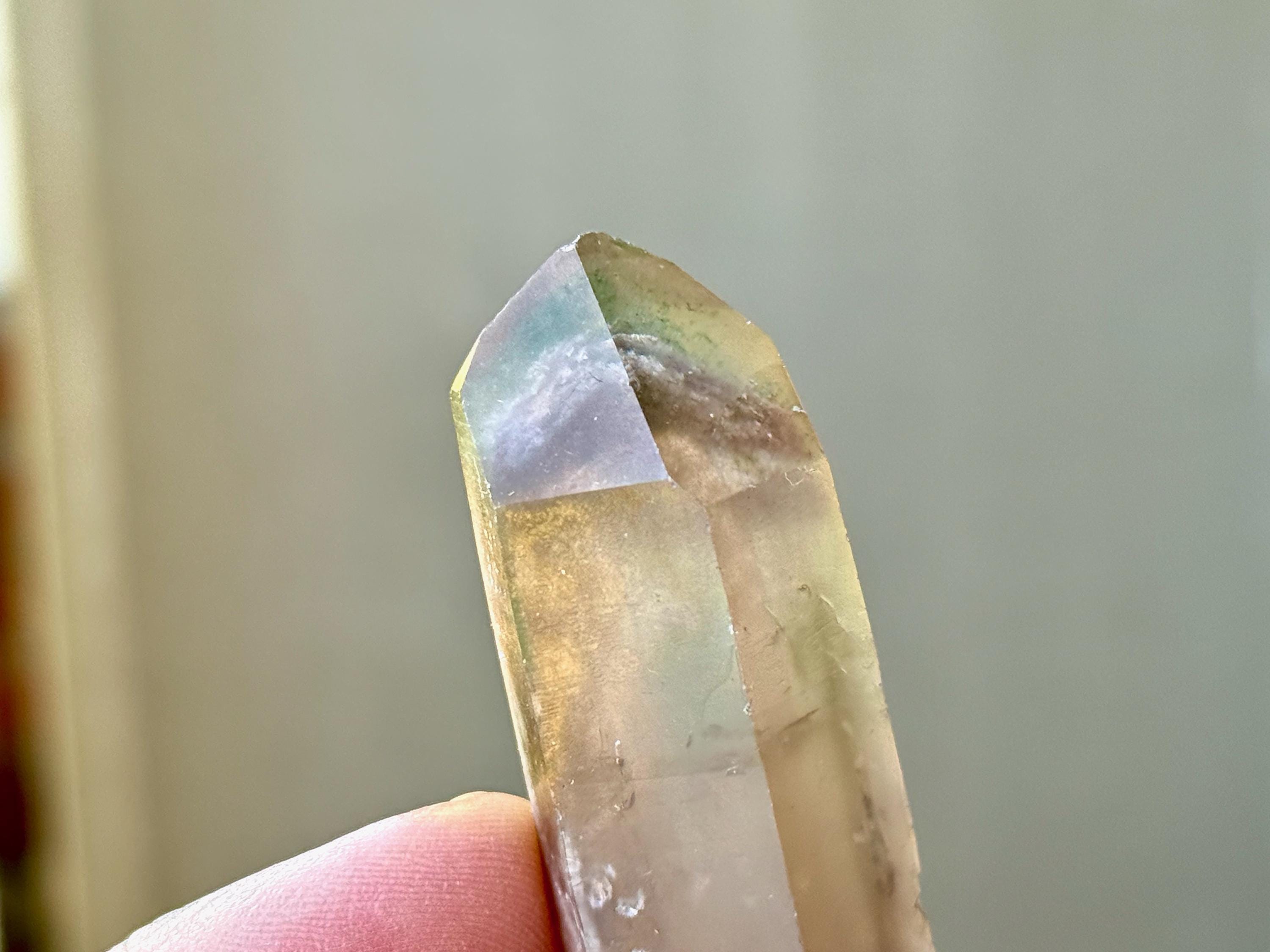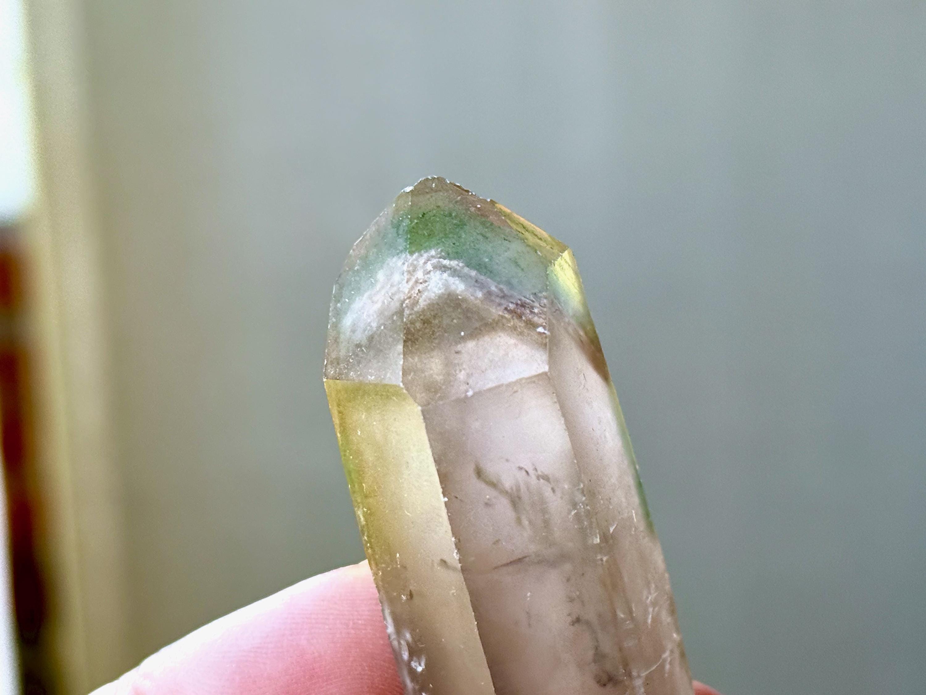 Elegant, elongated formation to this mildly Smoky Quartz crystal with excellent clarity and vibrant inclusions of both Pink Lodolite and Green Chlorite in the tip! On the backside, we can see more of that light pink Lodolite frosted on the exterior.