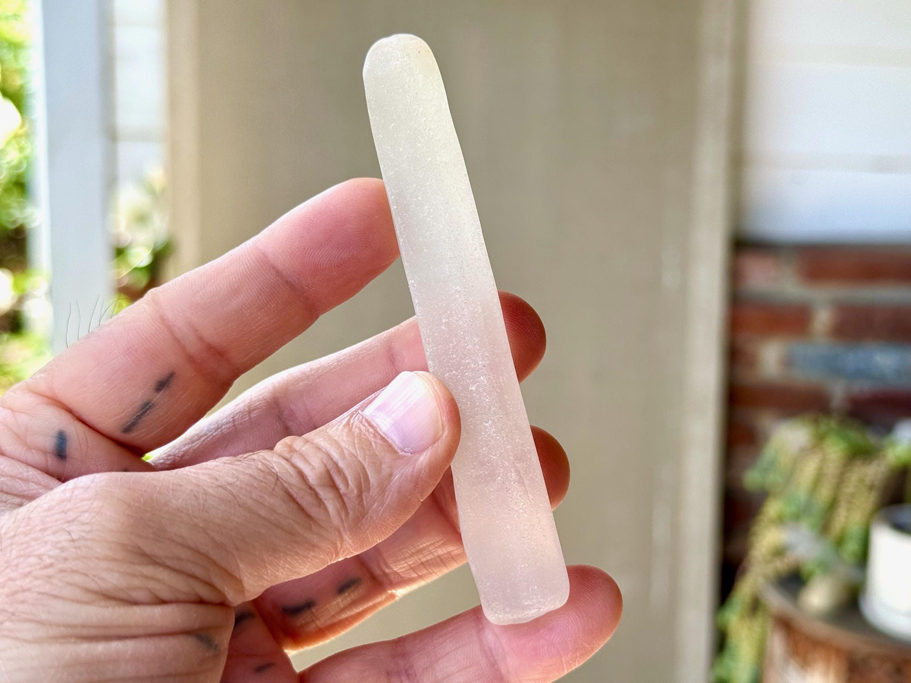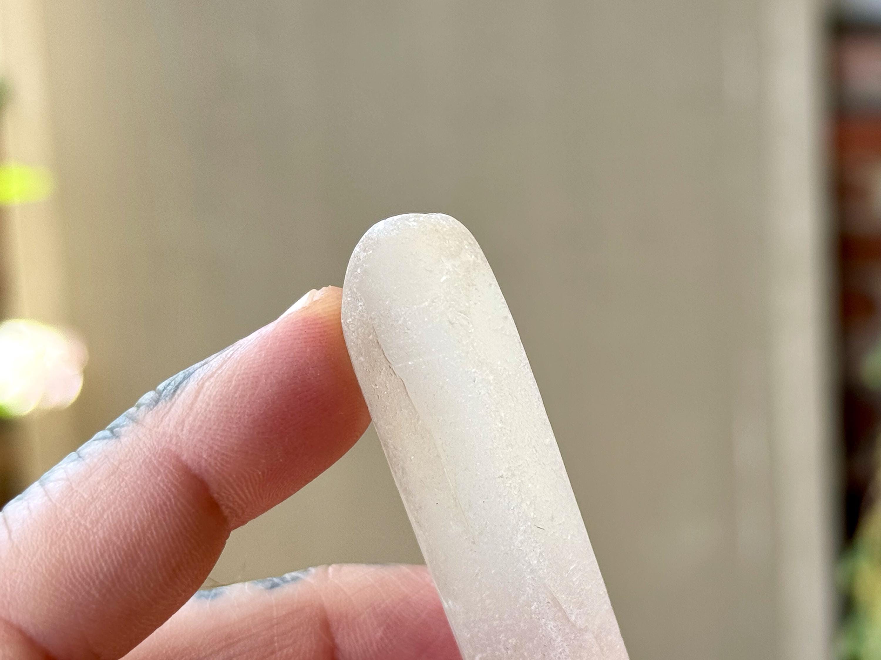 Ethereal, frosted beauty to this elongated Seaglass Quartz crystal that is round and smooth all over! When backlit, as in Photos 3-4, we can see how it lights up with a ghostly glow!