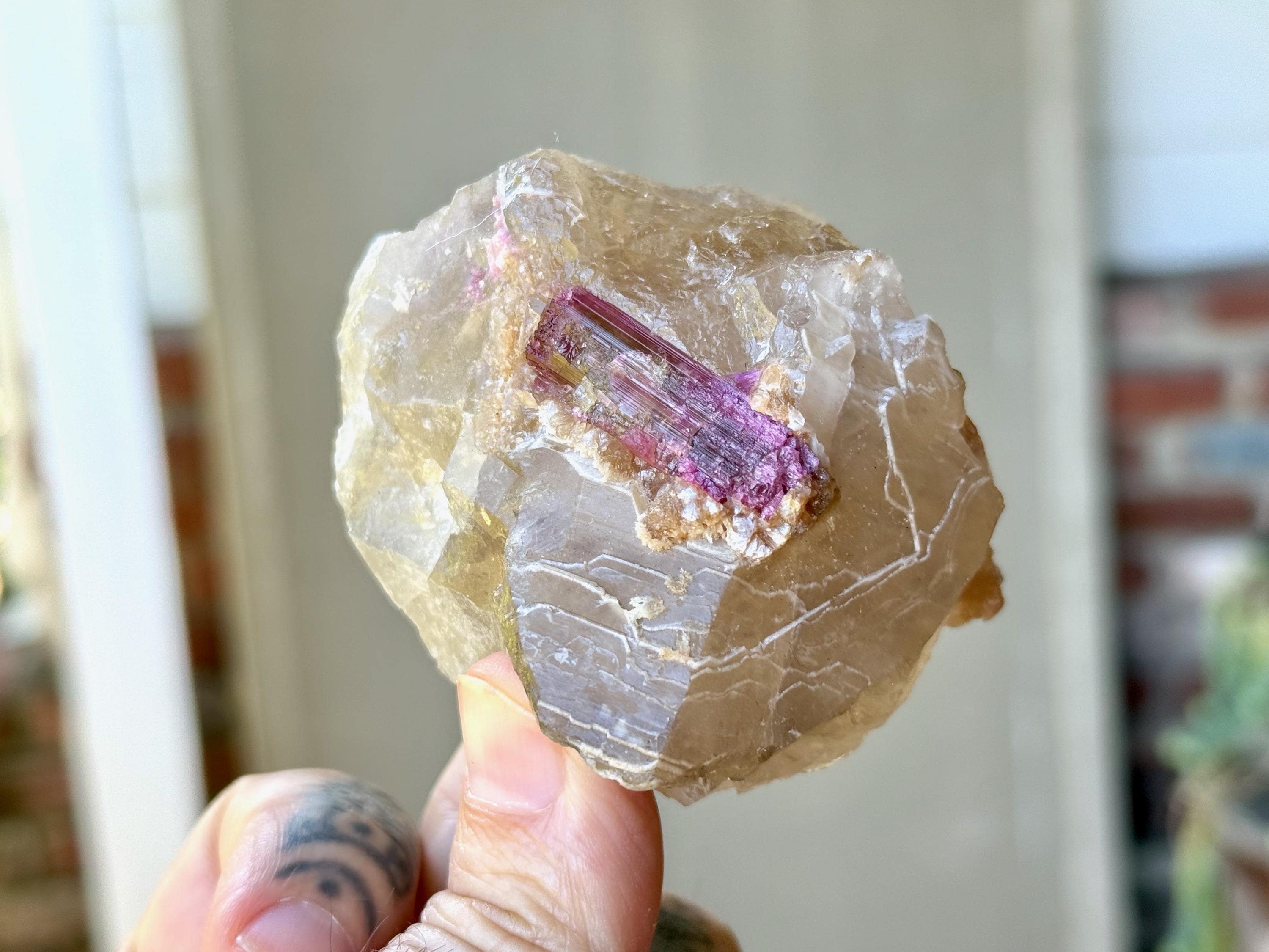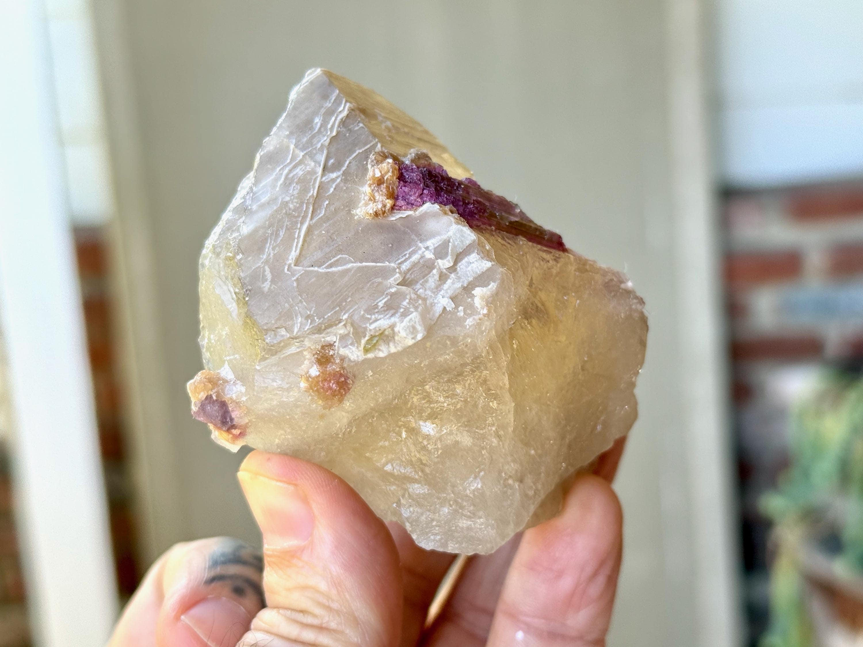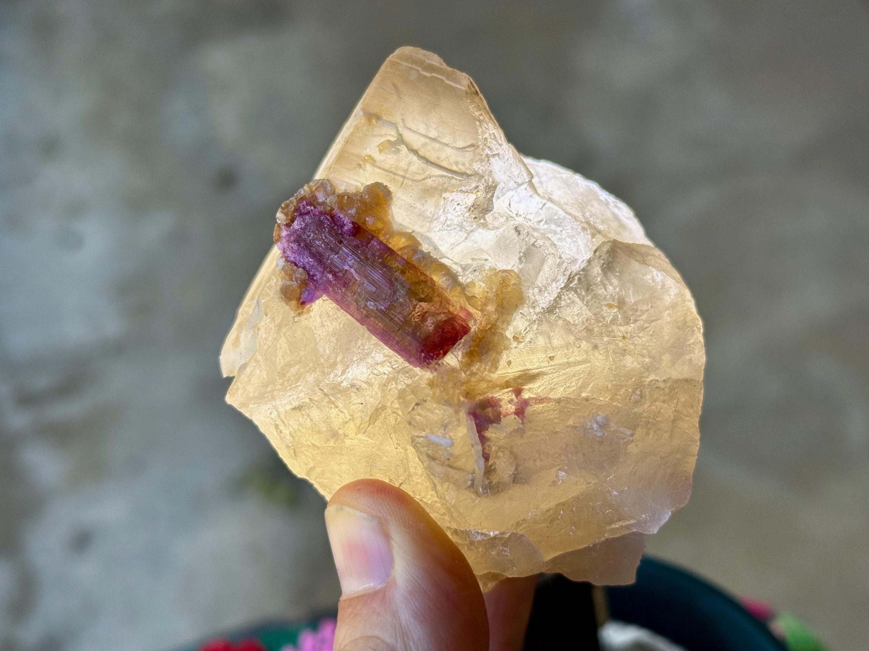 The perfect combination of energies to this chunky, natural Citrine with Pink Tourmaline inclusions. The Citrine possesses a vibrant golden color, and the Pink Tourmaline is juicy and vividly hued as well. When backlit, the entire piece lights up beautifully (Photos 1, 4-6).