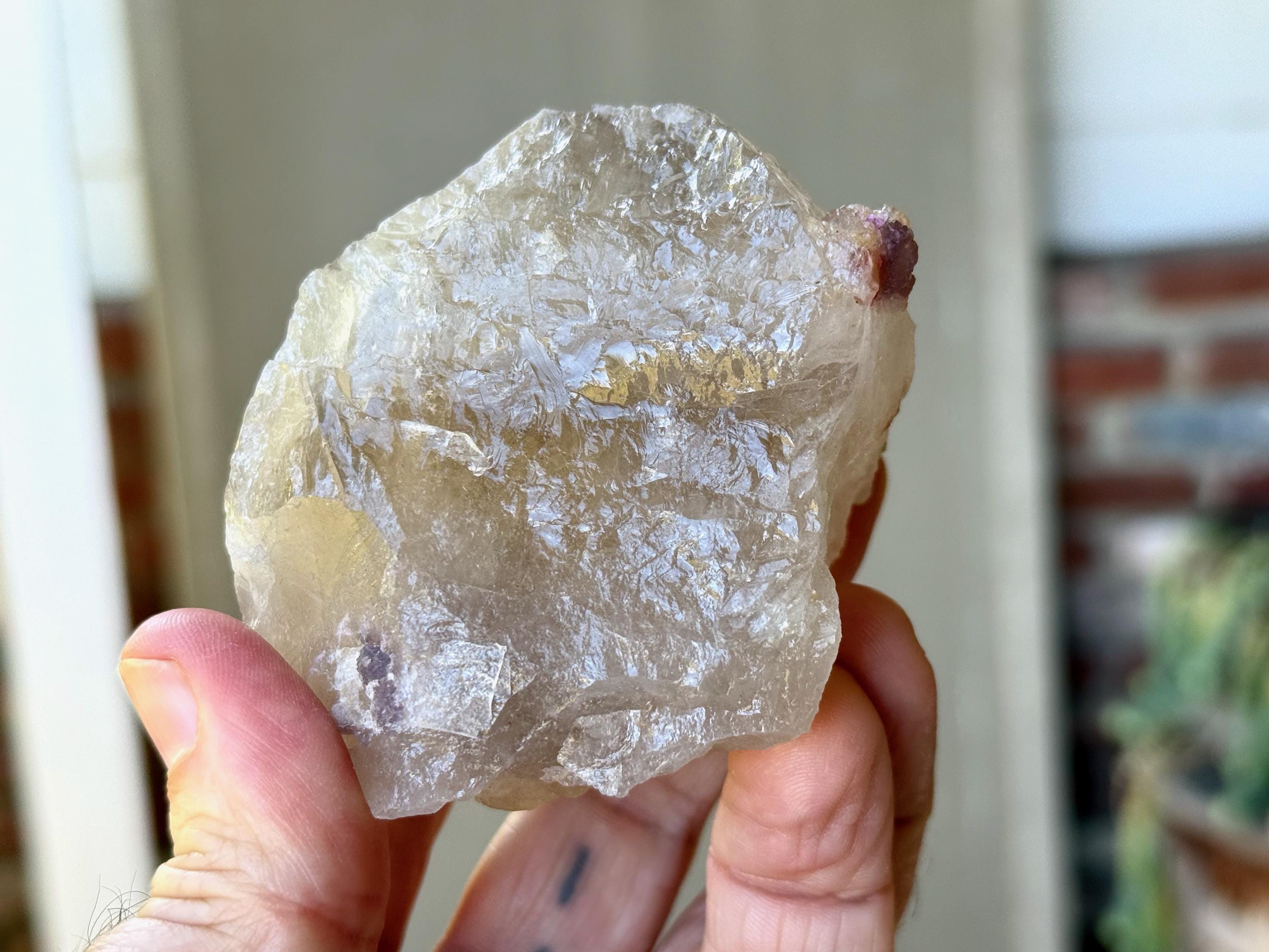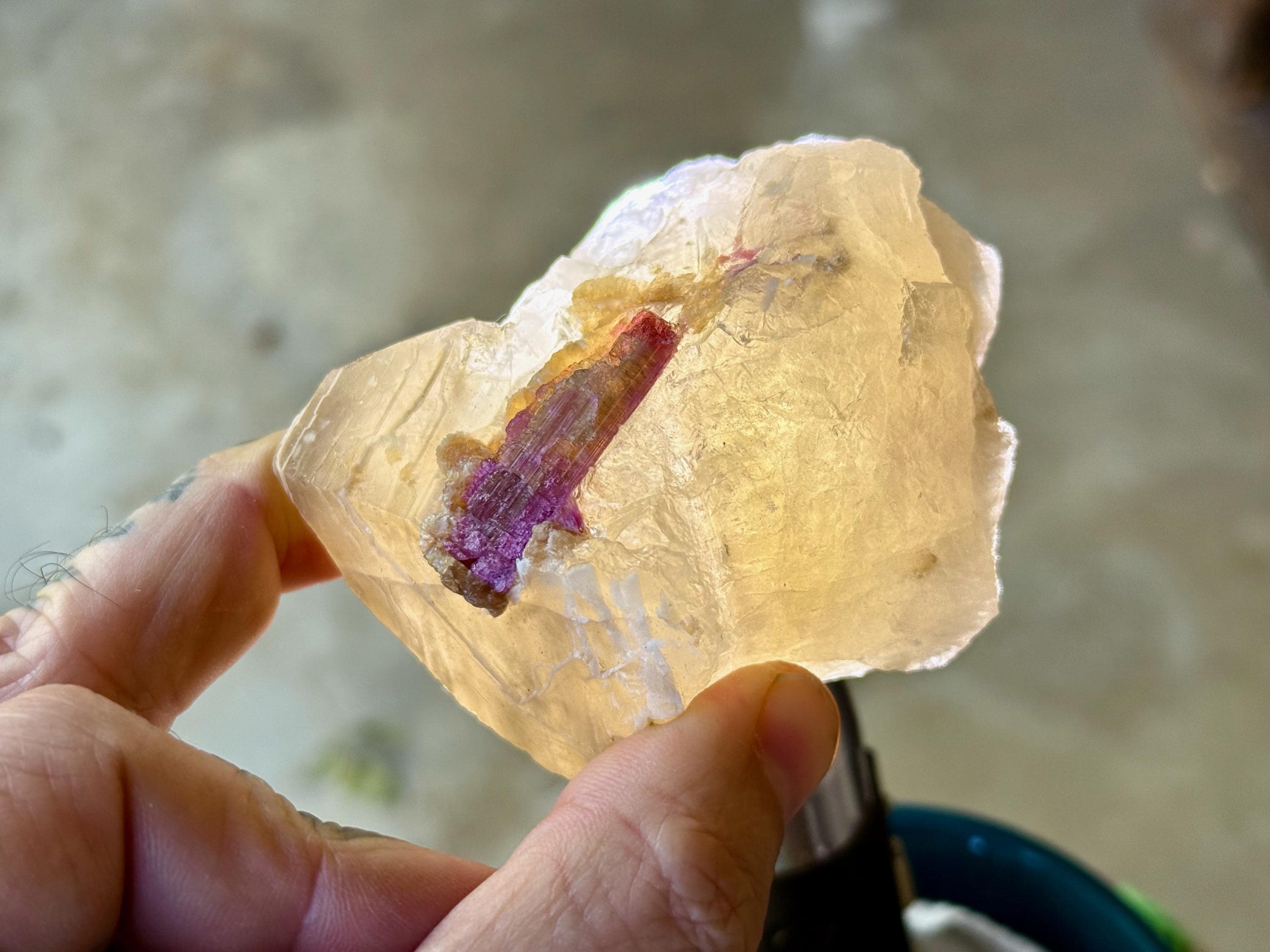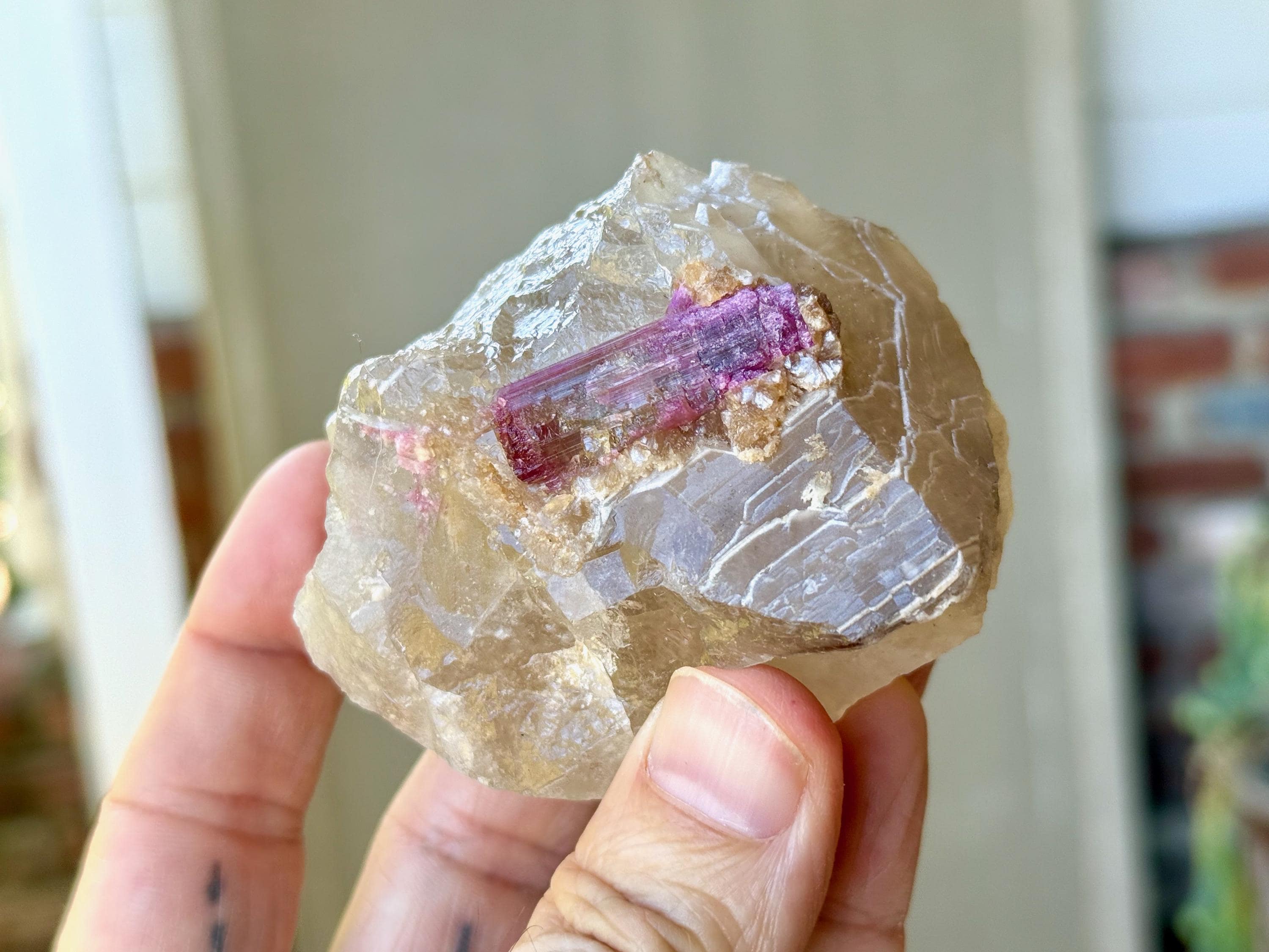 The perfect combination of energies to this chunky, natural Citrine with Pink Tourmaline inclusions. The Citrine possesses a vibrant golden color, and the Pink Tourmaline is juicy and vividly hued as well. When backlit, the entire piece lights up beautifully (Photos 1, 4-6).