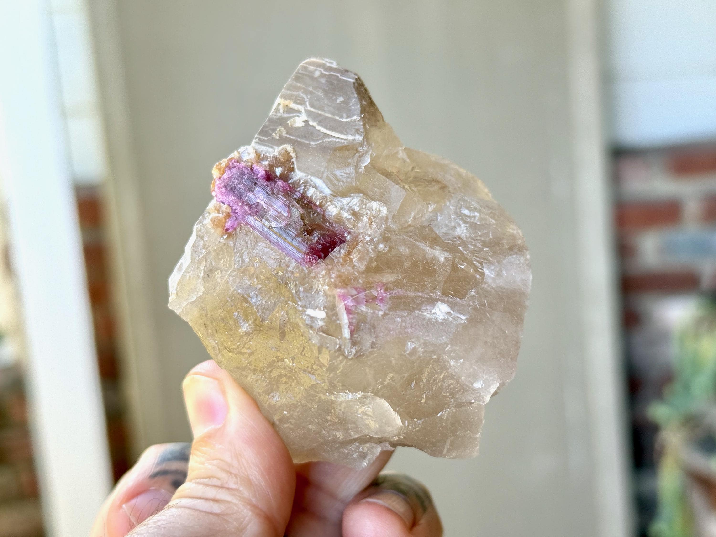 This natural Citrine with Pink Tourmaline comes from a recent find in the area of Coronel Murta, Minas Gerais, Brazil. Pink Tourmaline is a wonderful Heart Chakra crystal, healing wounds of the heart and in doing so cleansing the entire energy body of destructive feelings and old wounds accumulated over time.