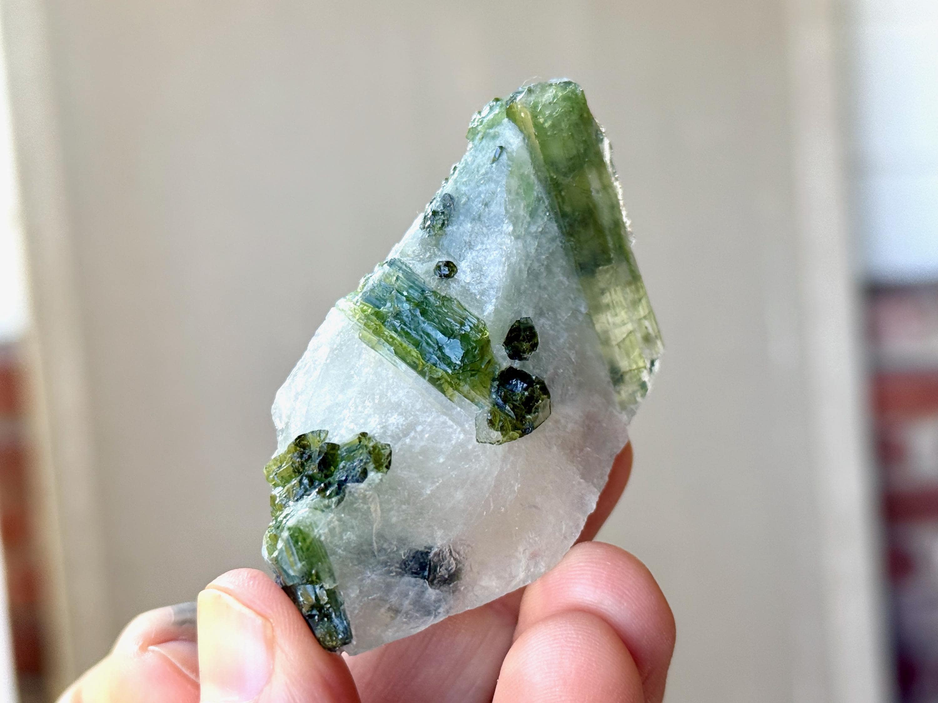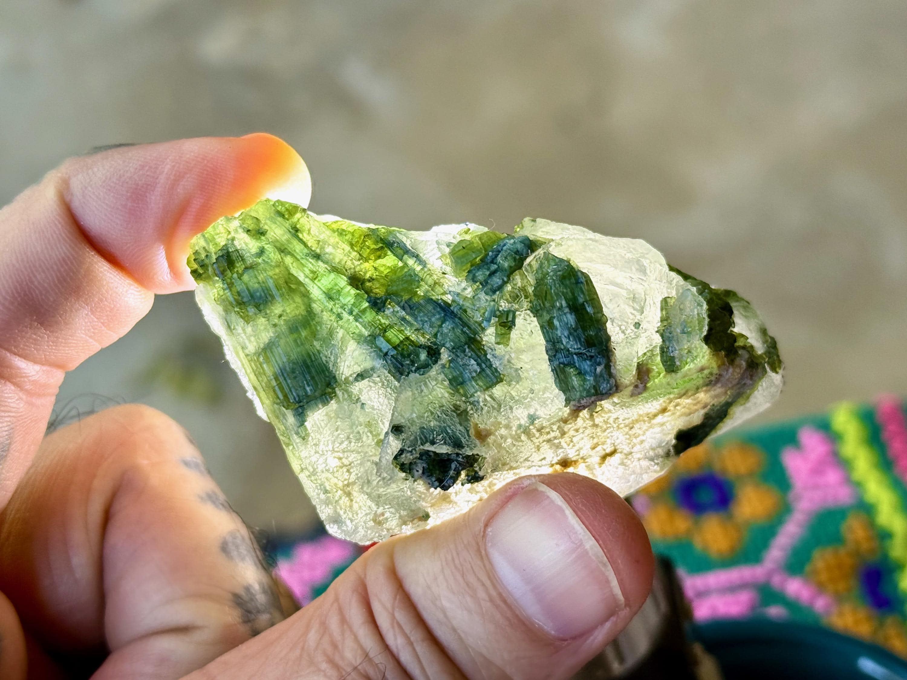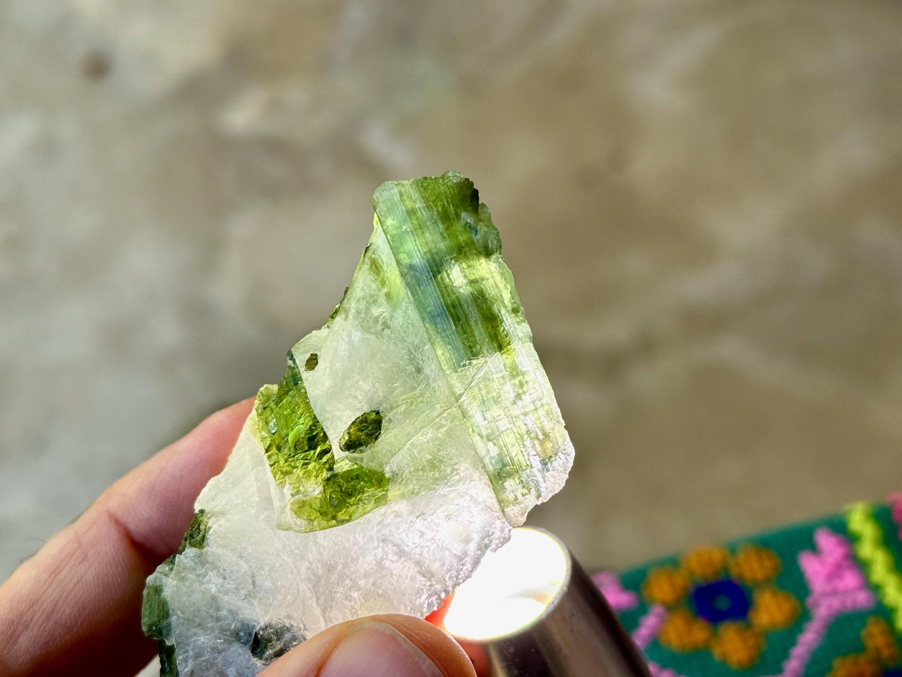 Green Tourmaline purifies and strengthens, allowing one to energetically carry greater amounts of Life Force (Prana Energy). As more energy is carried within the physical body, higher degrees of consciousness can be maintained. It is a wonderful protection stone, deal for sealing holes in the aura that leave one vulnerable to negativity.