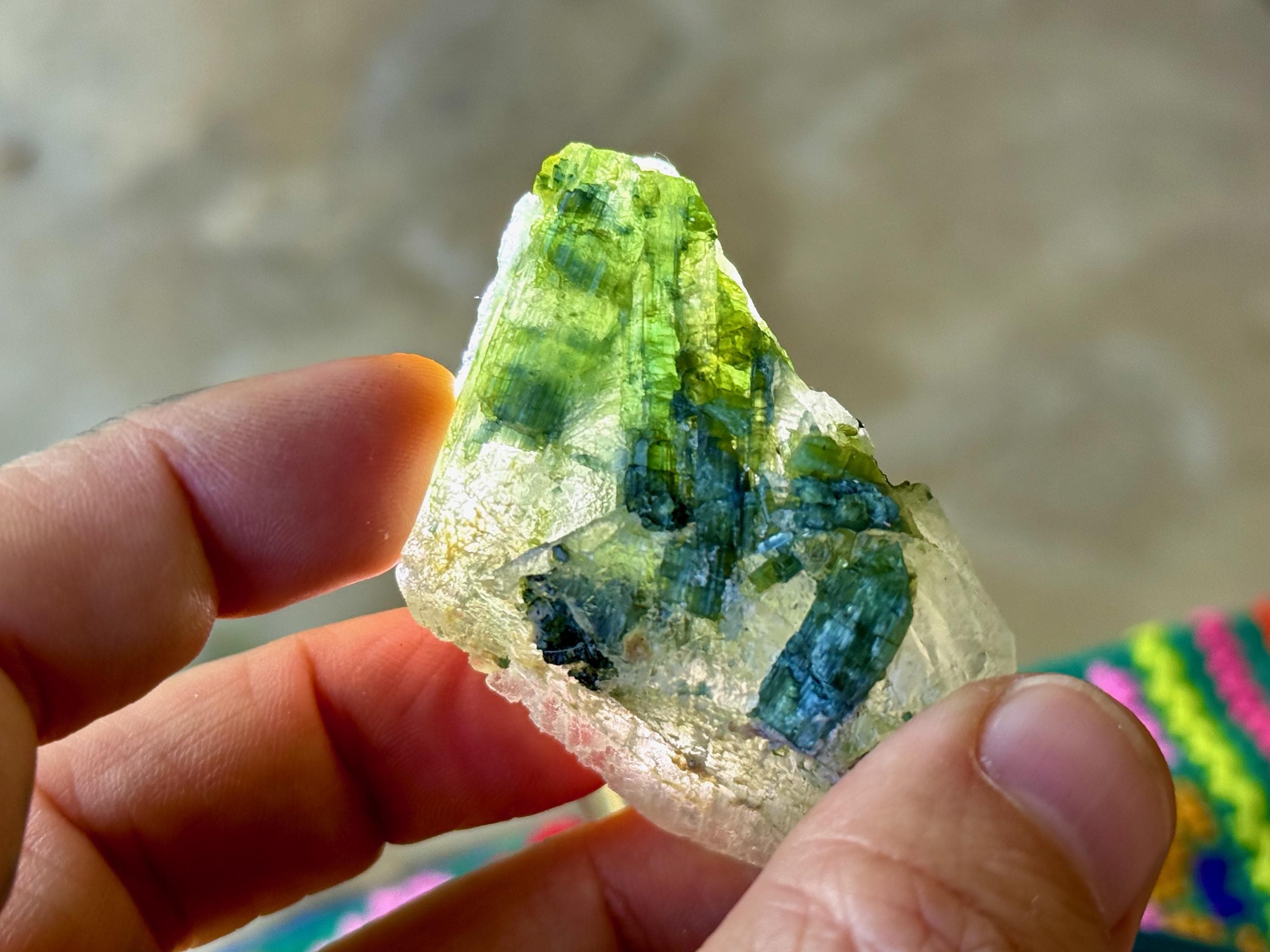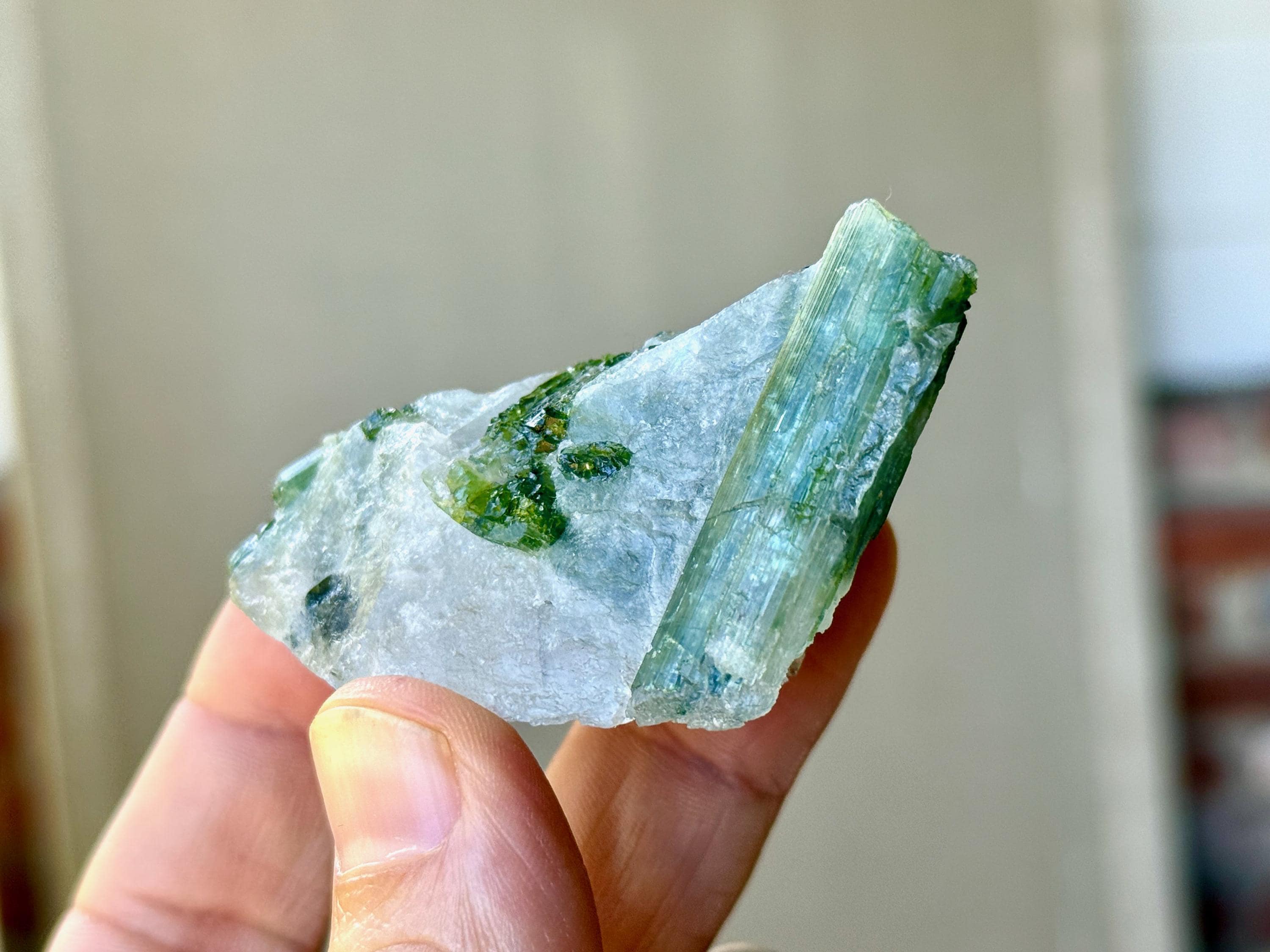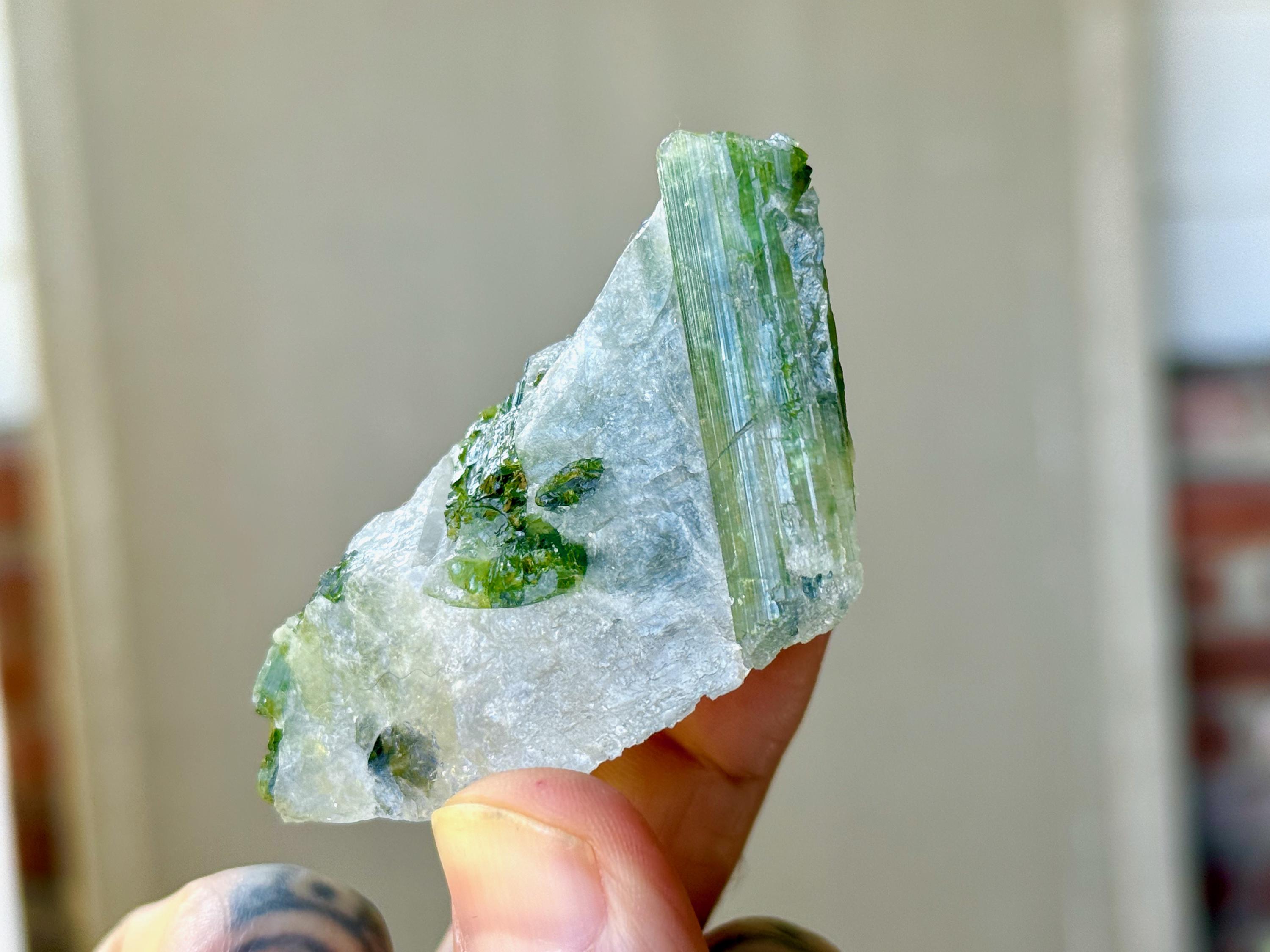 This natural Green Tourmaline Quartz crystal comes from a recent find in Coronel Murta, Minas Gerais, Brazil.