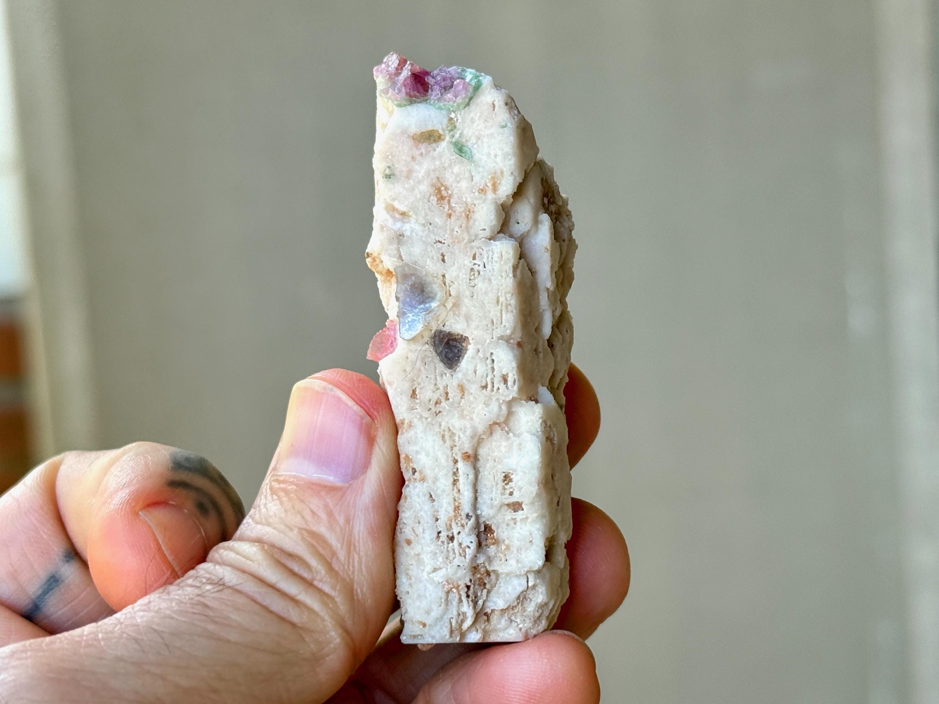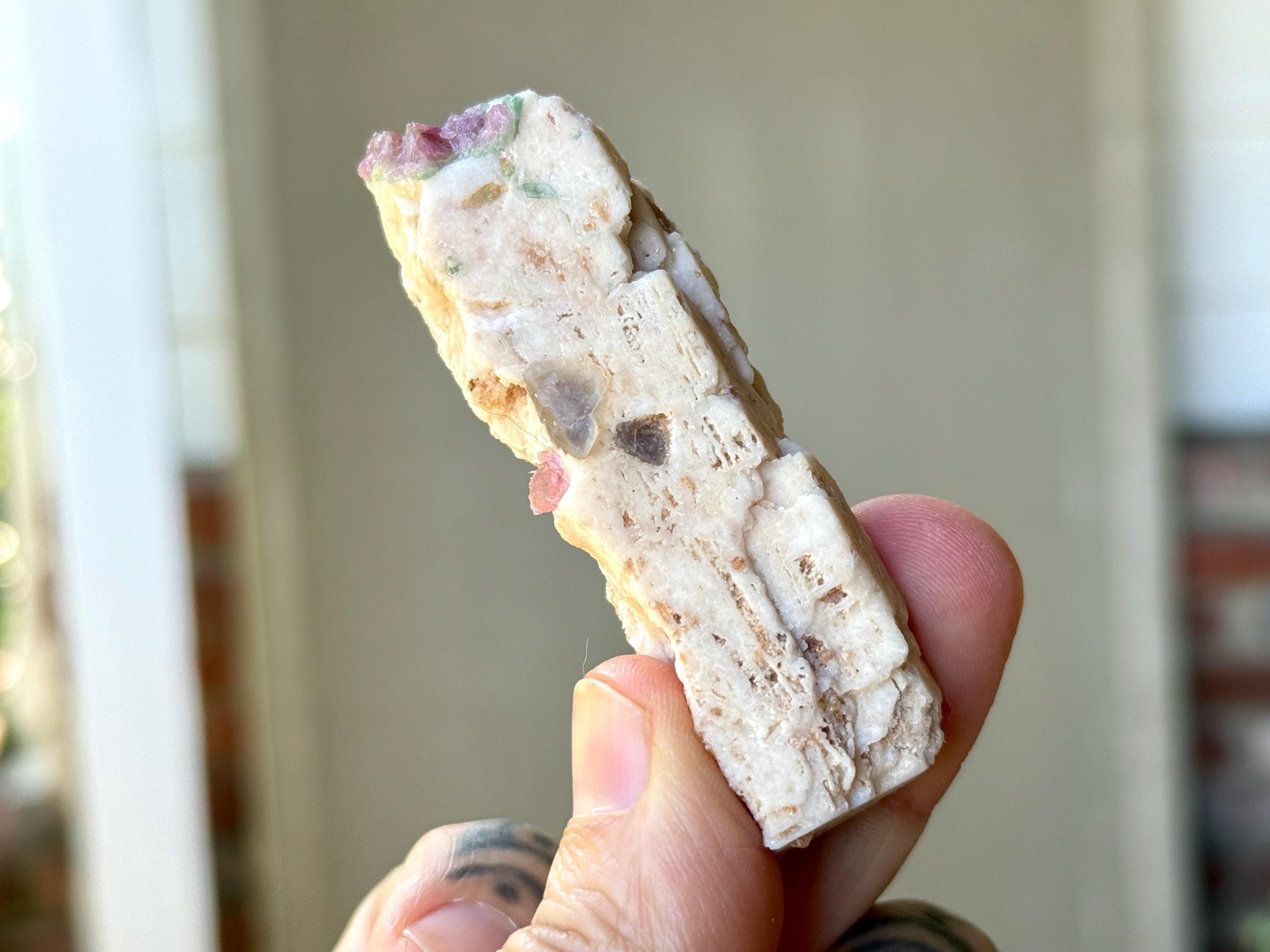 A wonderful combination of colors, textures and healing energies in this beautiful Unicorn Stone! This piece features an elongated Feldspar crystal as the primary matrix, which is embedded with Pink Tourmaline at the top. We also see some hints of Mica and/or Lepidolite. A wonderful energetic piece.