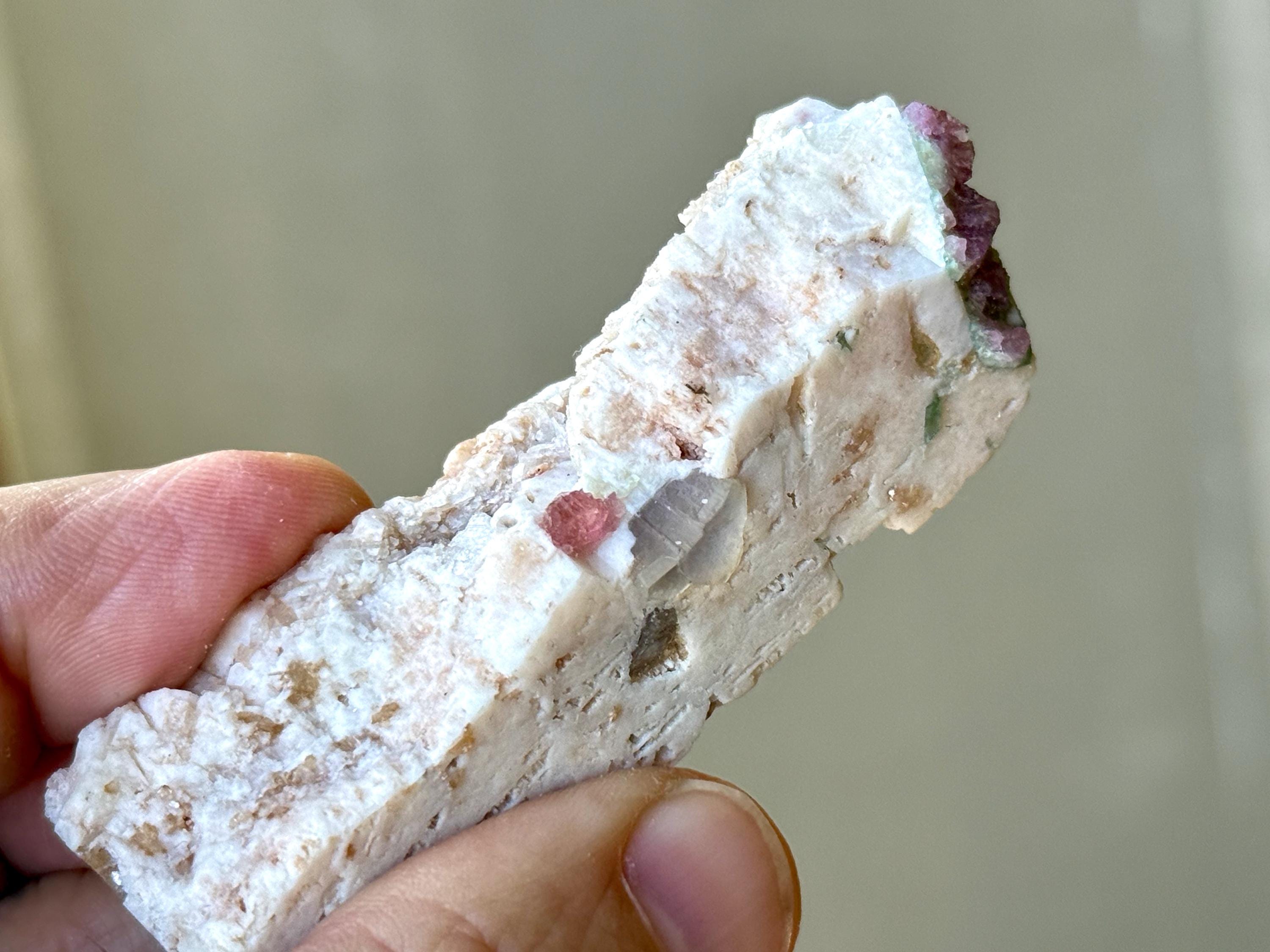 The crystals from this find include unique combinations of Quartz, Citrine, Lepidolite, Cleavelandite, Albite and Feldspar, with vividly colored Tourmalines in lovely hues of green, pink, purple and blue. Crystals with combinations of these minerals are sometimes referred to as "Unicorn Stones."