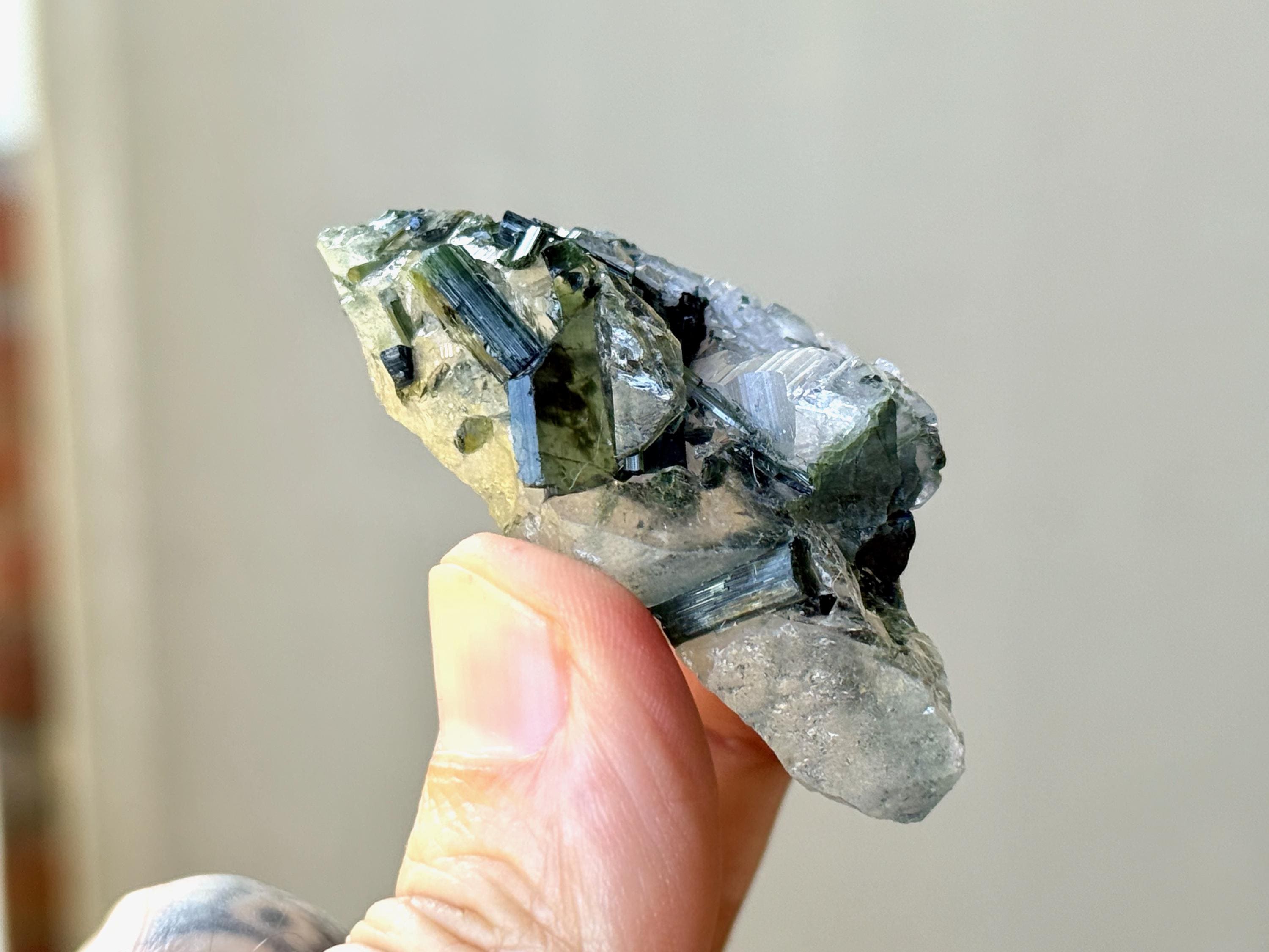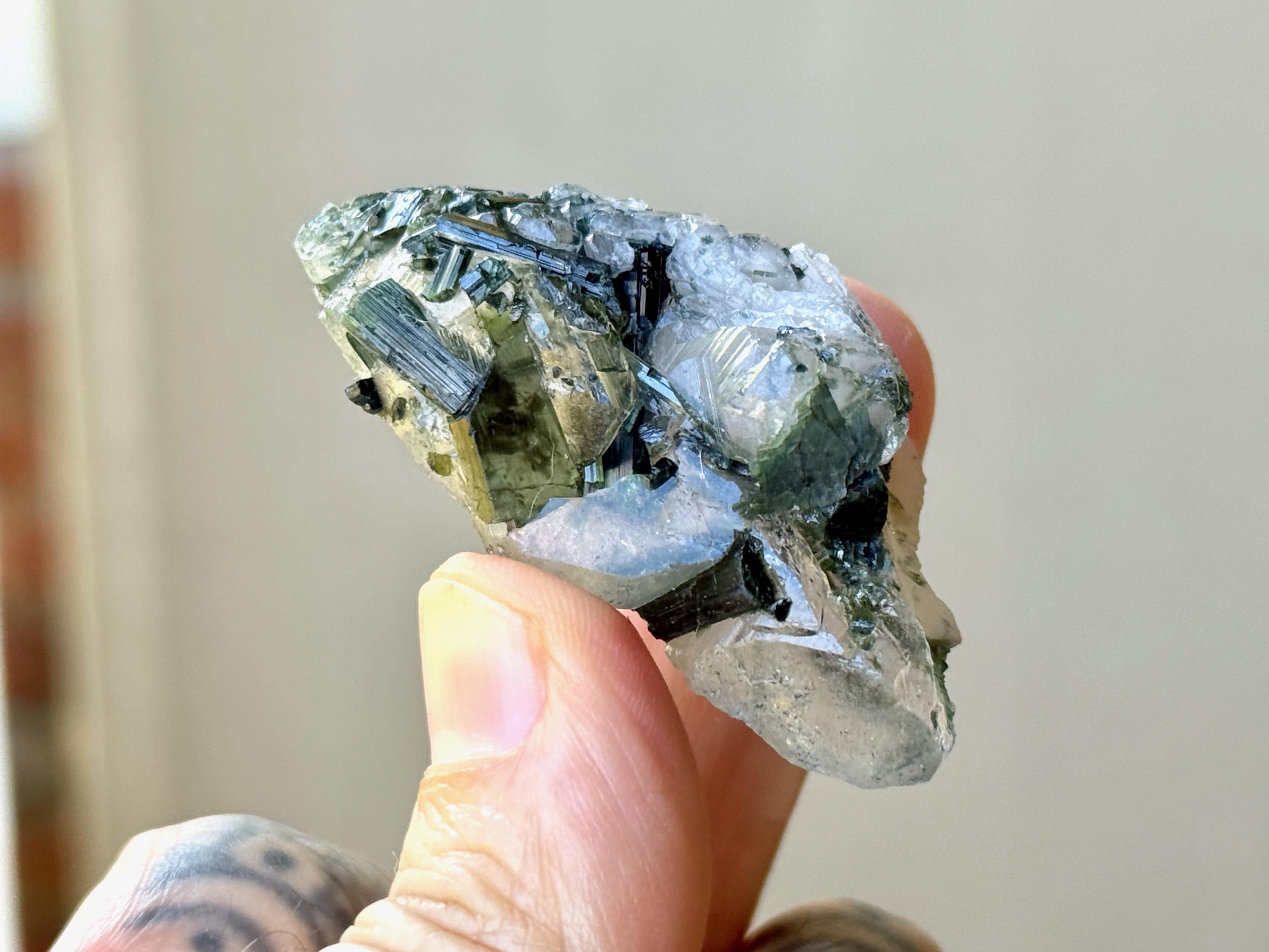 Superb color and luster to this sweet nugget of a Quartz crystal with Blue Green Tourmaline inclusions! In natural light, we can appreciate the beauty of this piece, with its darkly lustrous Green Tourmaline inclusions. However, when backlit, as in Photos 1, 3-5, we can see just how gemmy and colorful these inclusions are, and we can also see that some of these Tourmaline inclusions are bicolor, with blue bodies and green tips!