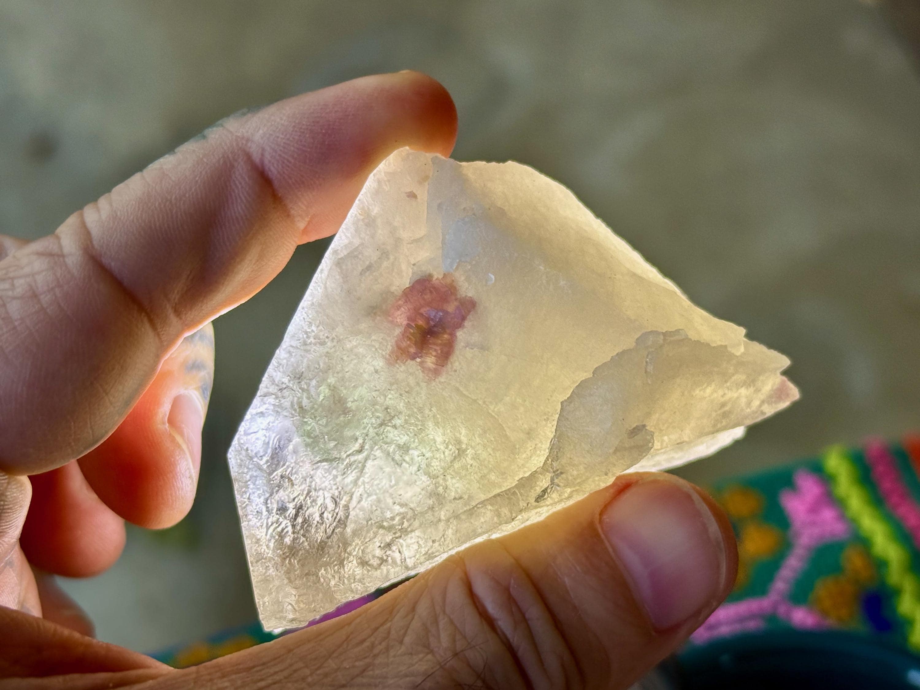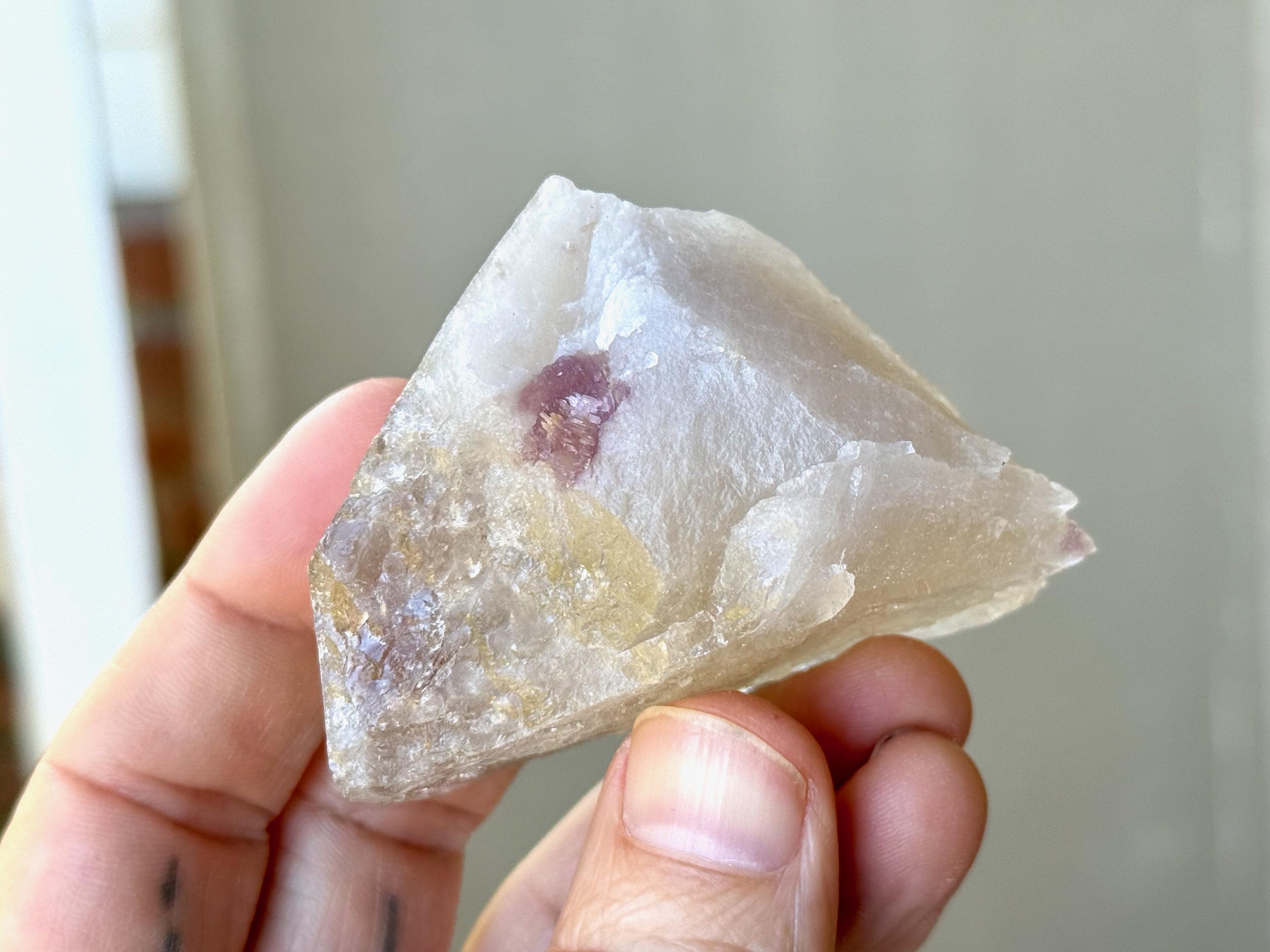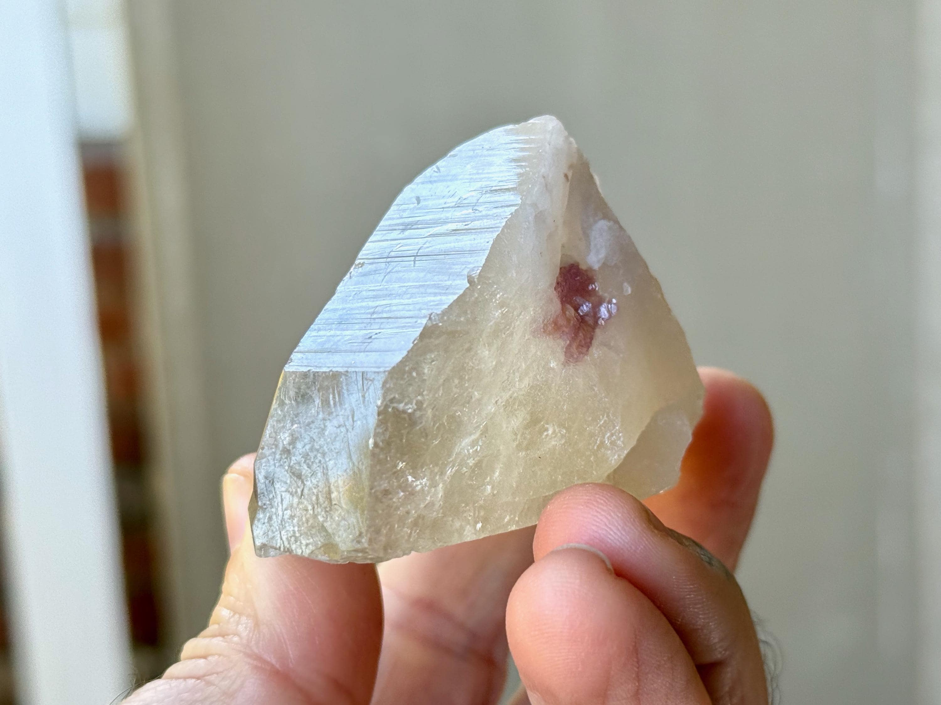 This crystal has a broad and flat base that allows it to sit nicely, as pictured, and this flat portion is actually self-healed (Photo 7). On the opposite side there's a small inclusion of pinkish-purple Lepidolite. This is a non-traditional formation with some partially healed contact areas, but it is entirely intact. Very beautiful!