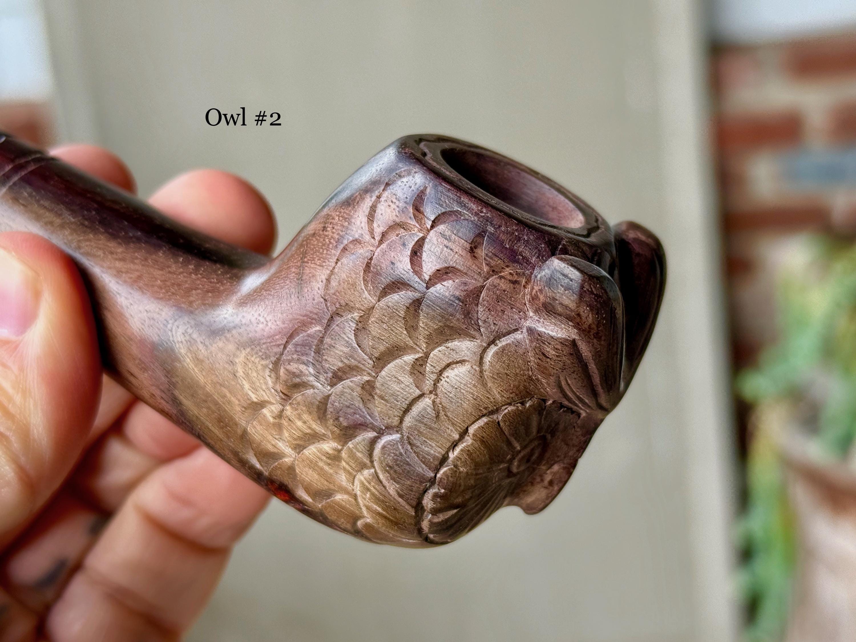 There are TWO similar pipes available, both carved from solid pieces of natural, dark tropical hardwood. Simply select your preference from the dropdown menu. You will receive the ACTUAL pipe you select.