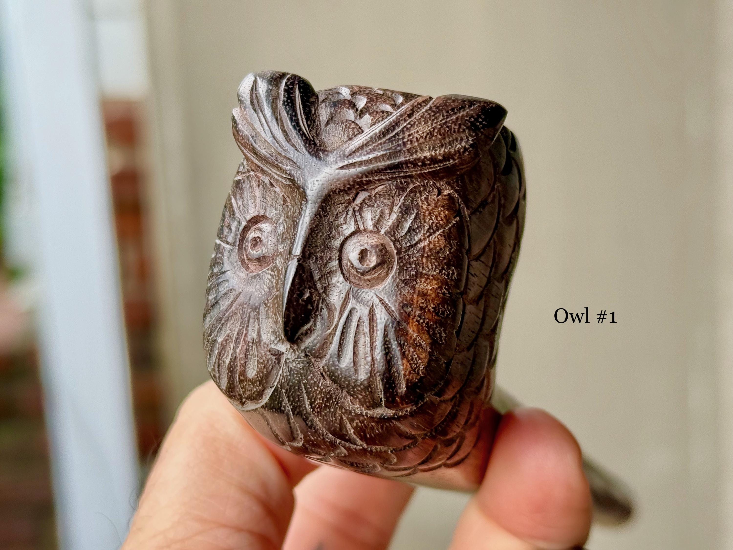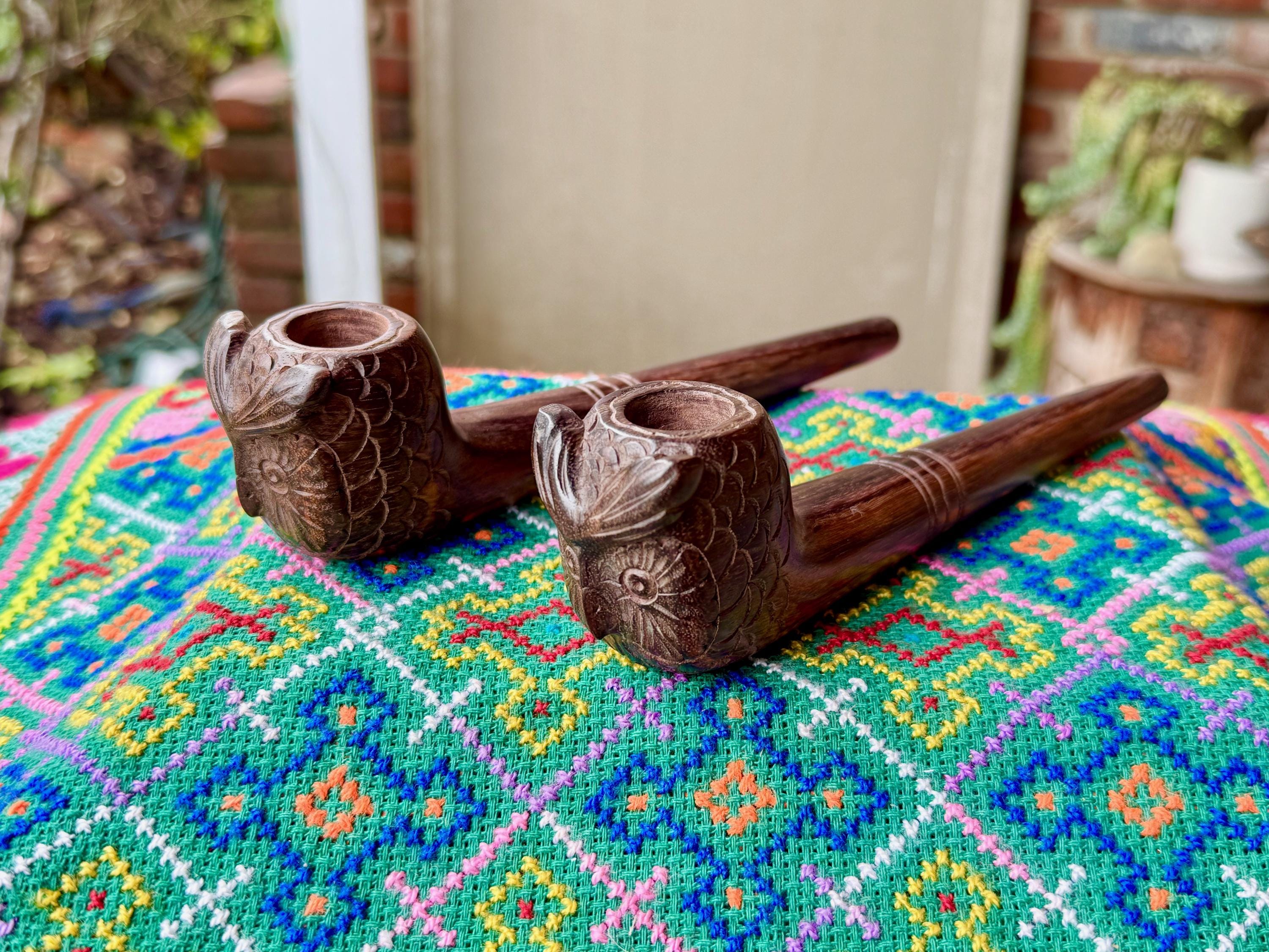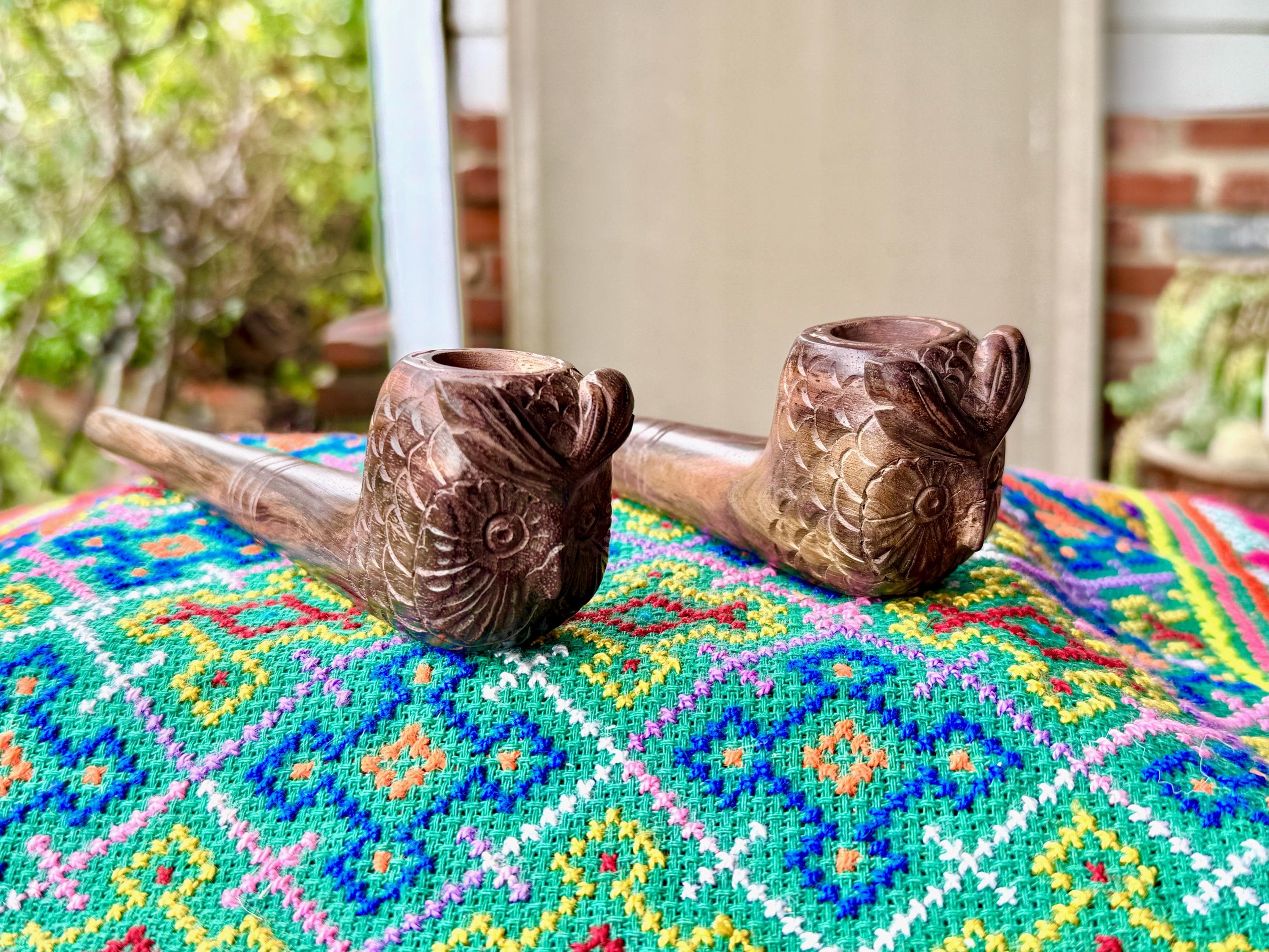 These exquisite Shamanic Owl pipes for tobacco and mapacho were hand carved from natural tropical hardwood by our artisans. These pipes are intended for, but not limited to, use in shamanic healing ceremonies or other energy healing applications. Each is numbered, simply select your preference from the dropdown menu.