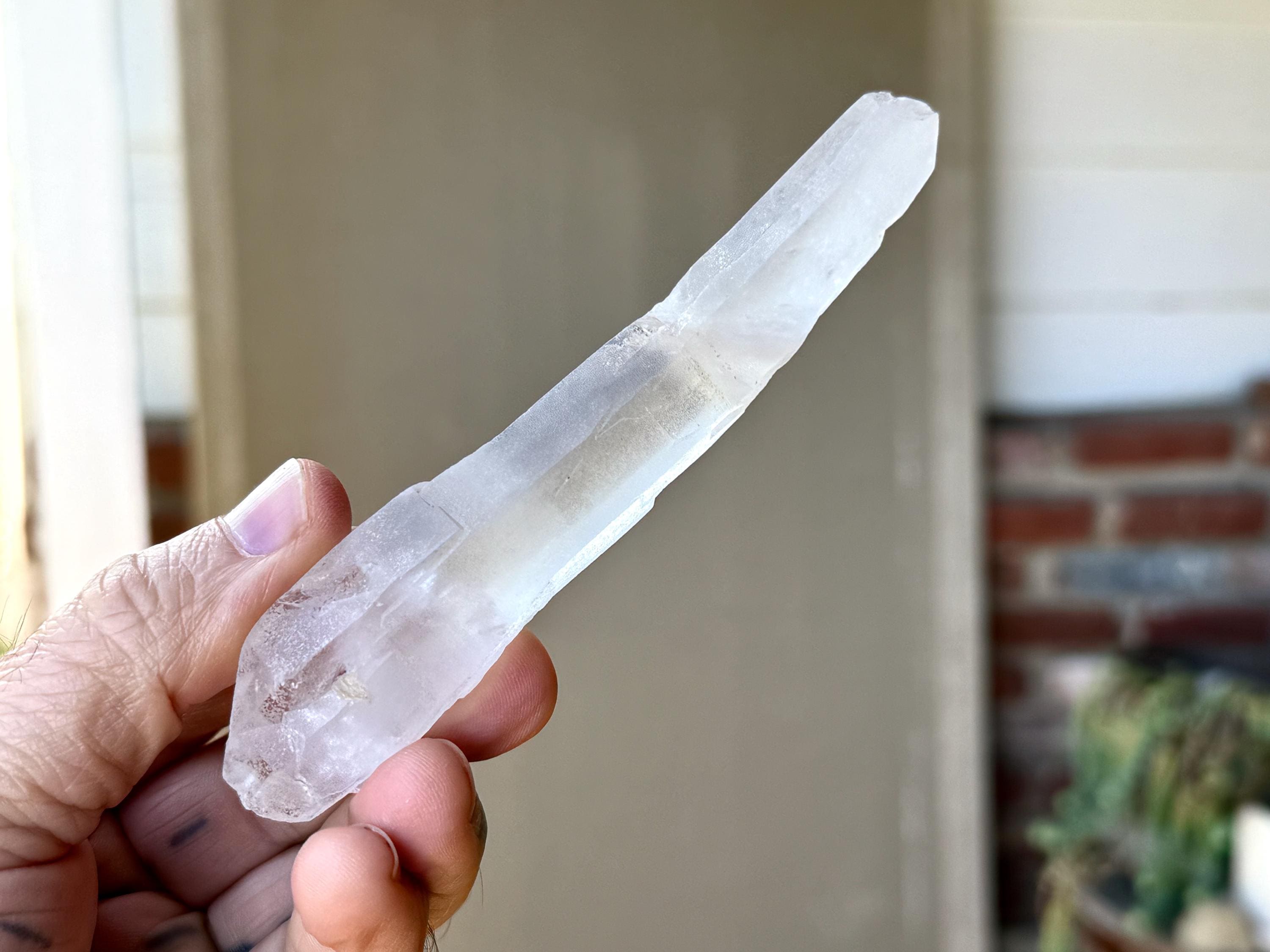 Ethereal beauty to this elongated Laser Quartz crystal with a mild "frosted" complexion. This crystal features a unique, self healed curvature, which shows where it fractured in the pocket of the Earth and managed to heal itself over millions of years. Curved crystals are among our favorite formations, due to their rarity and powerful healing energies (see more on this below).