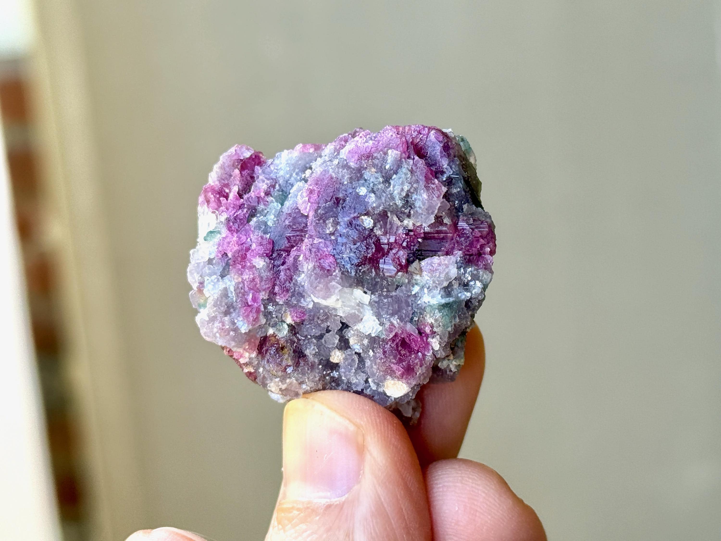 A colorful little snowball of a Unicorn Stone! This crystal possesses a matrix that is crystallized Purple Lepidolite. Embedded within are colorful inclusions of Teal Blue and Pink Tourmaline. A wonderful combination of colors and energies!