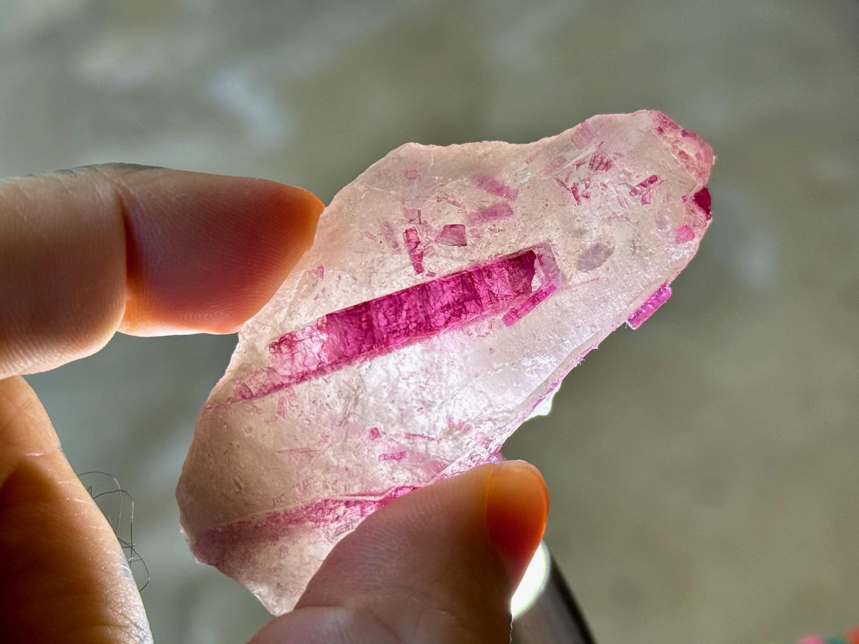 The perfect combination of energies to this broad and flat, natural Citrine with Pink Tourmaline inclusions. The Citrine possesses a muted golden color, and the Pink Tourmaline is juicy and vivid. When backlit, the entire piece lights up beautifully (Photos 1, 4).