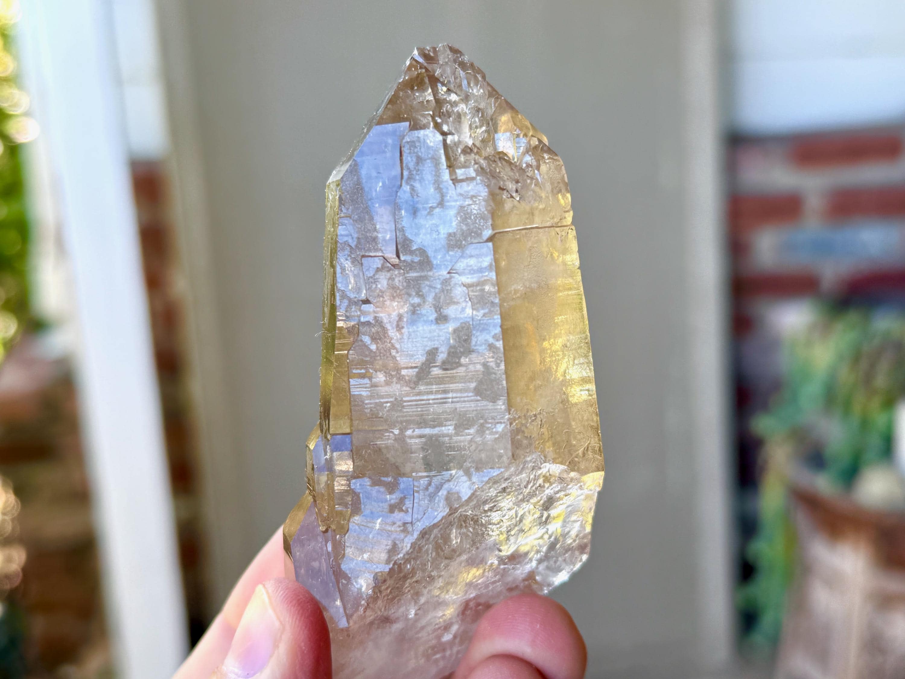 Superb clarity, brilliant luster and a tinge of smoky golden hue to this stunning Cathedral Quartz crystal. This piece possesses an array of cathedral textures and formations on its sides. The back main facet features a stunning, self-healed impression that is filled with triangular, Elestial formations (Photos 3 & 7)