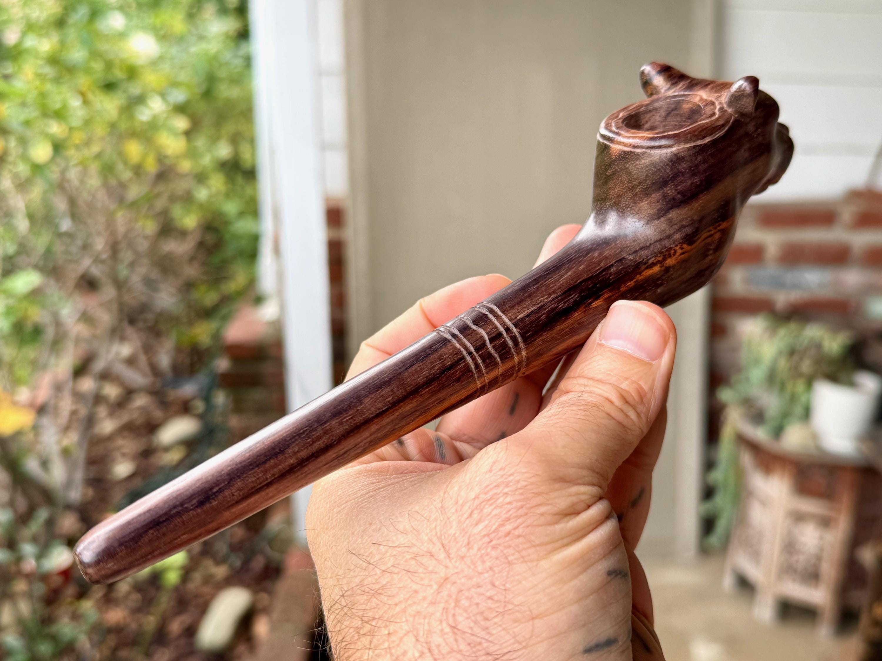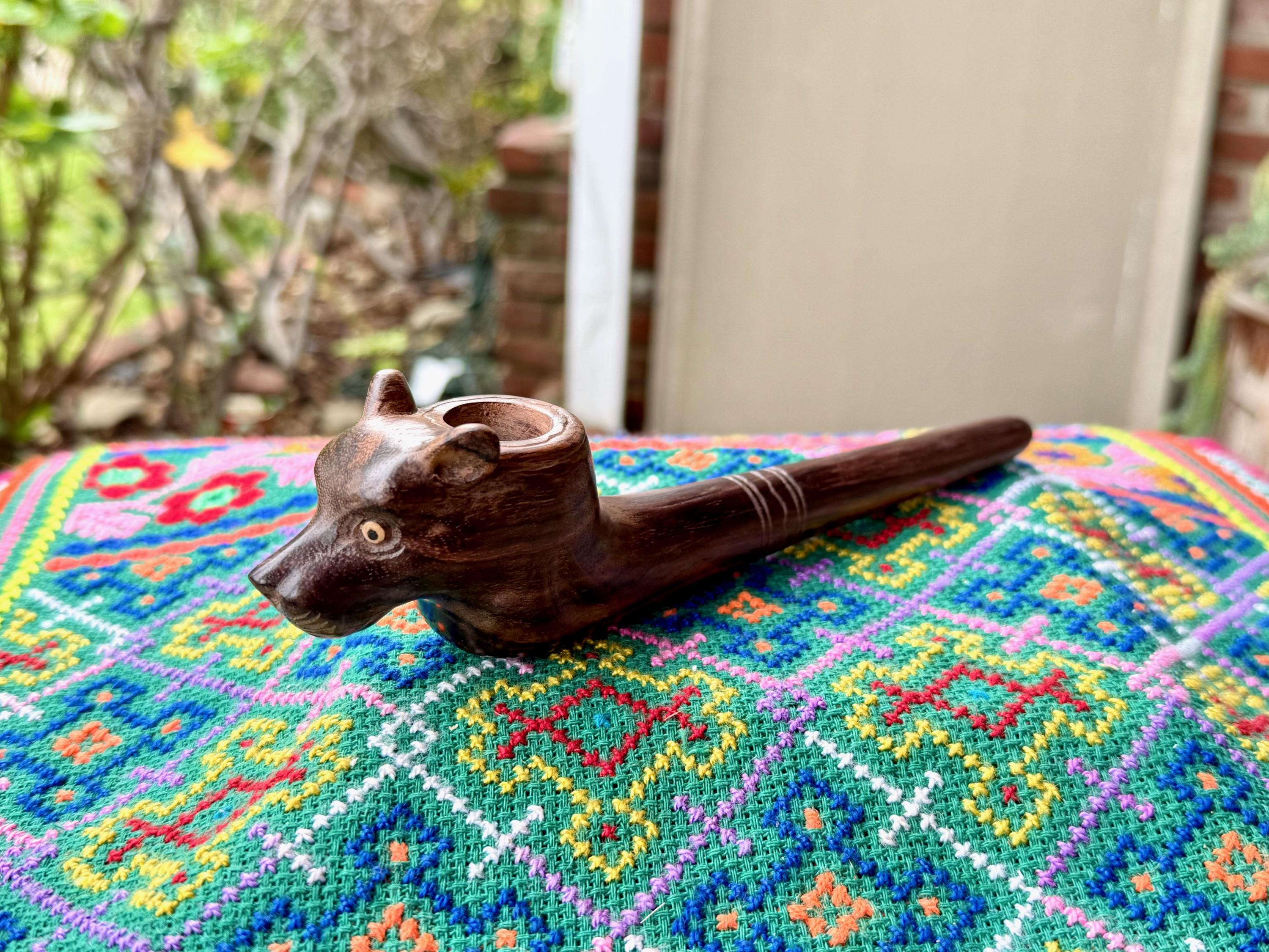 Elegant and powerful design to this beautiful pipe depicting the face of the majestic Jaguar carved into the bowl. We love his calm and protective expression, as well as the sleek simplicity of this design. This pipe was masterfully carved from a solid piece of natural, dark tropical hardwood. The grain and color is divine! An exceptional and powerful ceremonial tool.