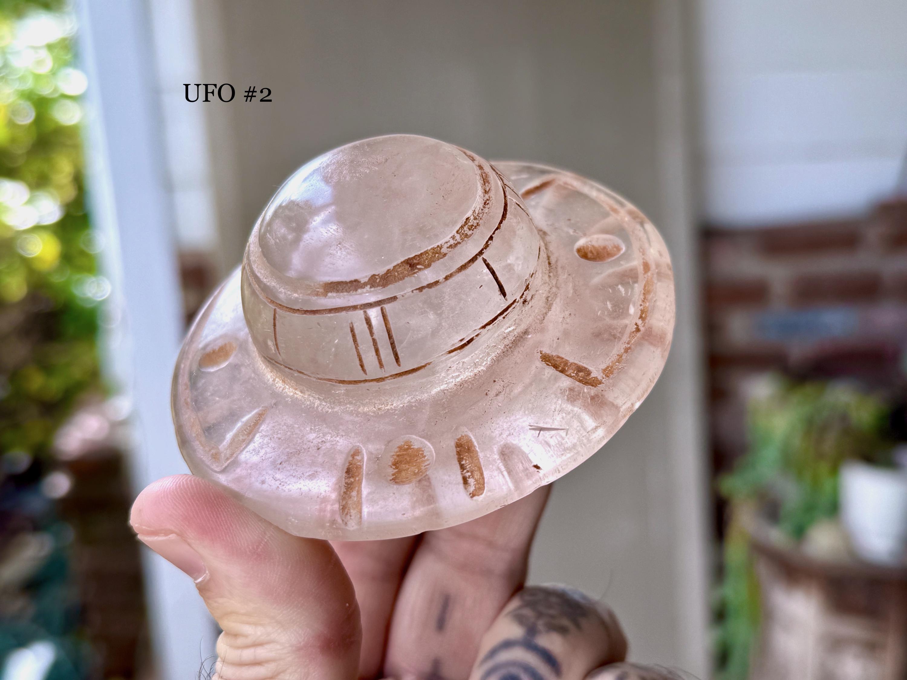 These cosmic Quartz Crystal UFOs were hand carved from native Peruvian Quartz by artist Ruben Layme in Peru's Sacred Valley. The Quartz from this area of Peru has a strong energetic quality, especially as the land has a rich history of extraterrestrial activity.