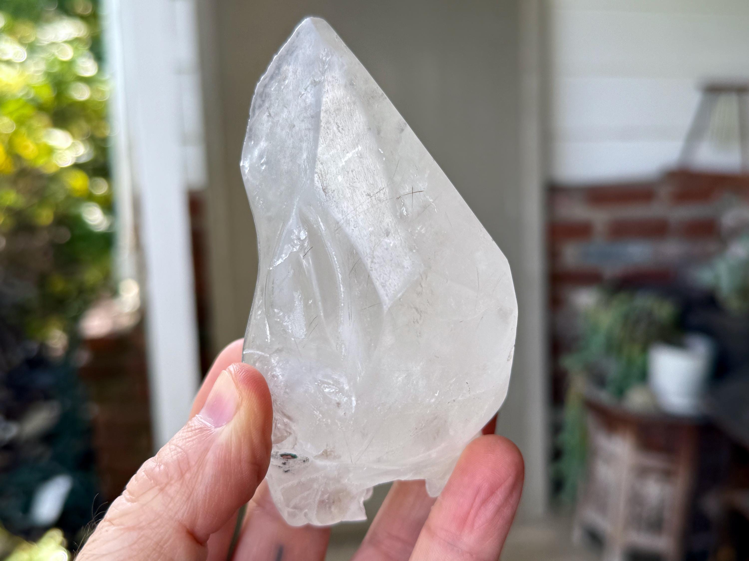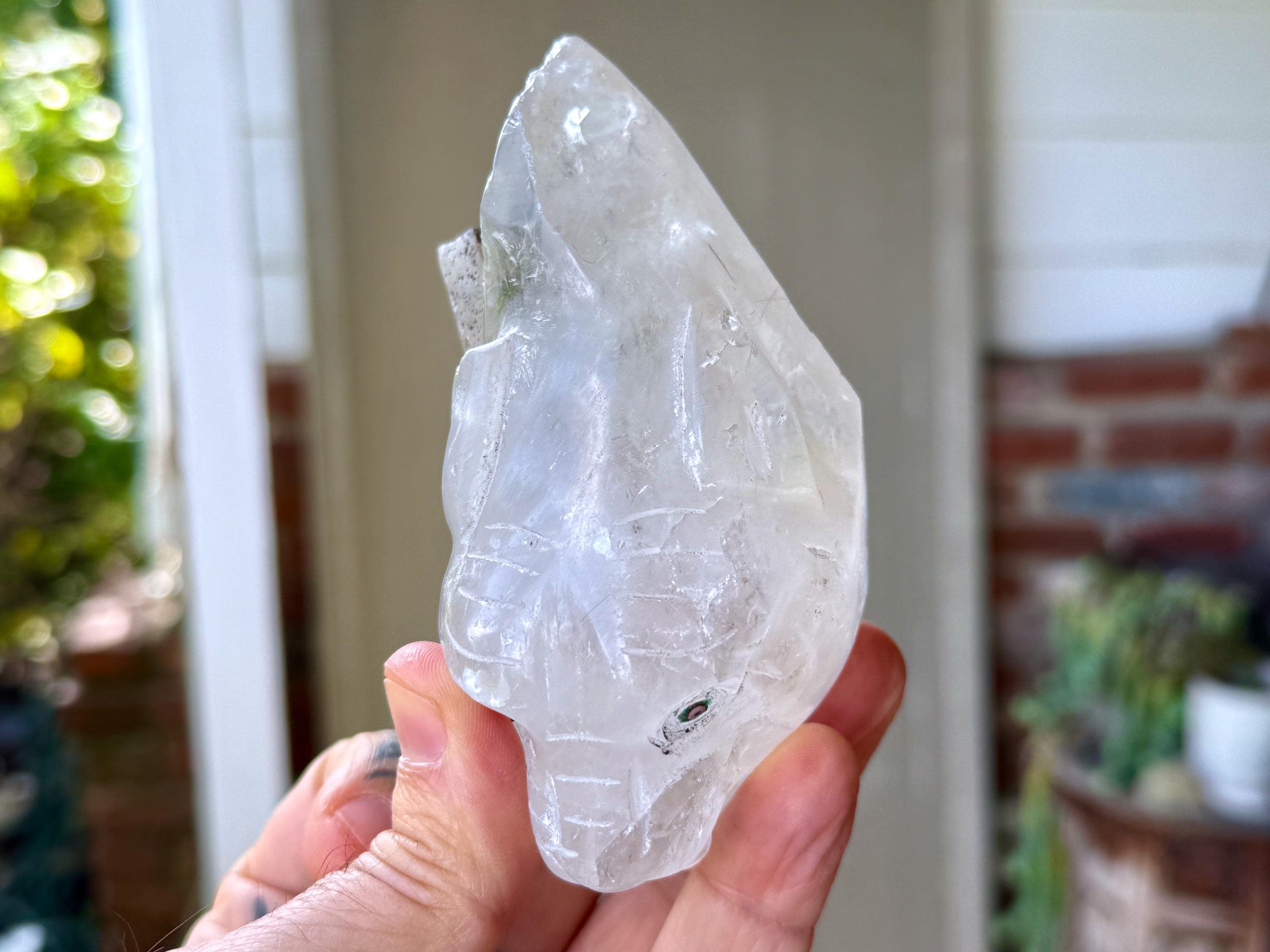 A fiercely protective expression to this Jaguar/Puma, carved into the base of this highly lustrous Quartz crystal point. When backlit, this piece lights up beautifully and we can see some mild strands of Golden Rutile within (Photos 3-5).