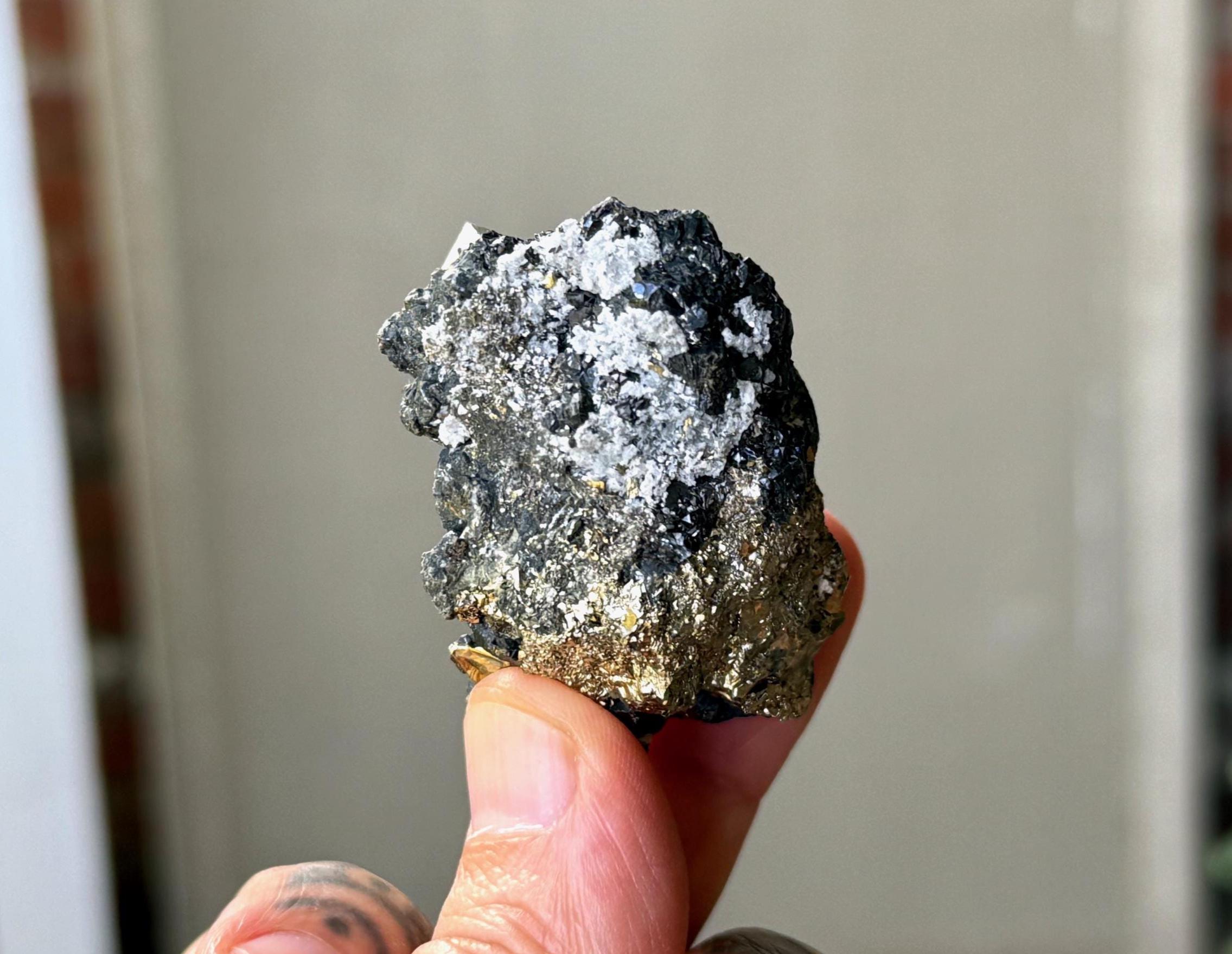 This exquisite, all natural Pyrite with Sphalerite comes from an old find in Huallanca District, Peru. Pyrite is one of the most powerful protection crystals, drawing energy from the Earth into the physical and auric bodies to create a powerful protective shield.