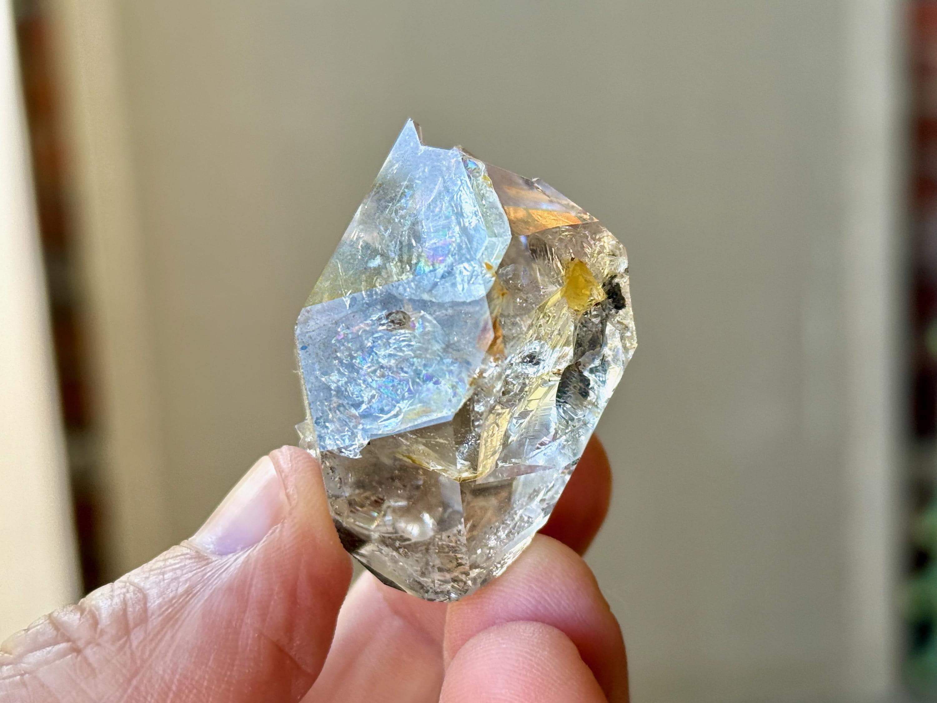 From our personal collection, this Herkimer Diamond possesses water-clear clarity, brilliant luster and a classic Double Terminated "diamond" formation. The clarity allows us to peer inside and enjoy the crystalline formations within, as well as the inclusions of black Anthraxolite and golden Hematite.