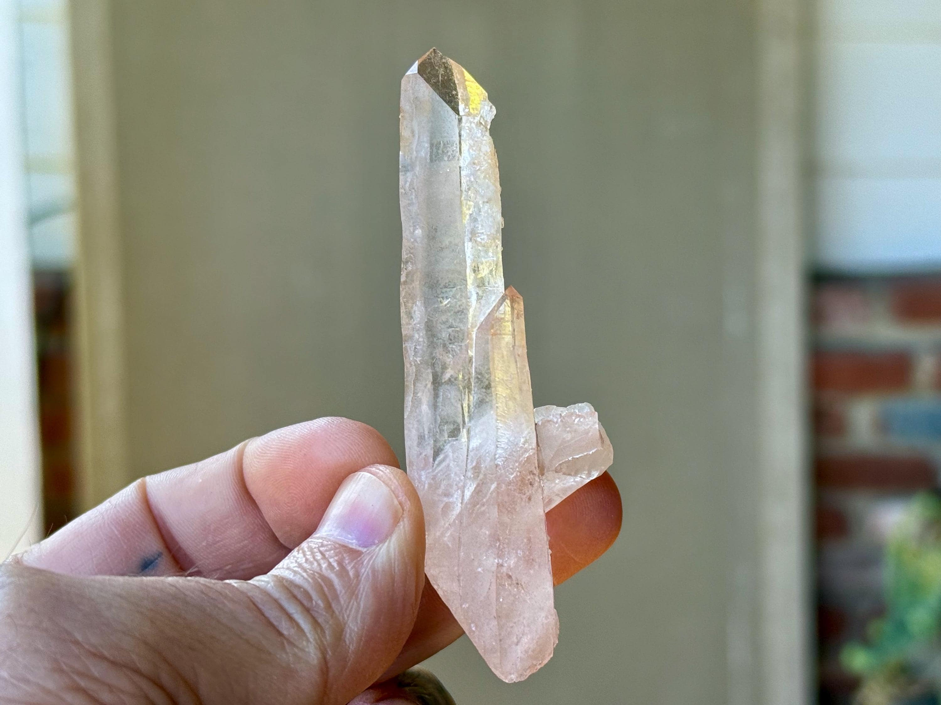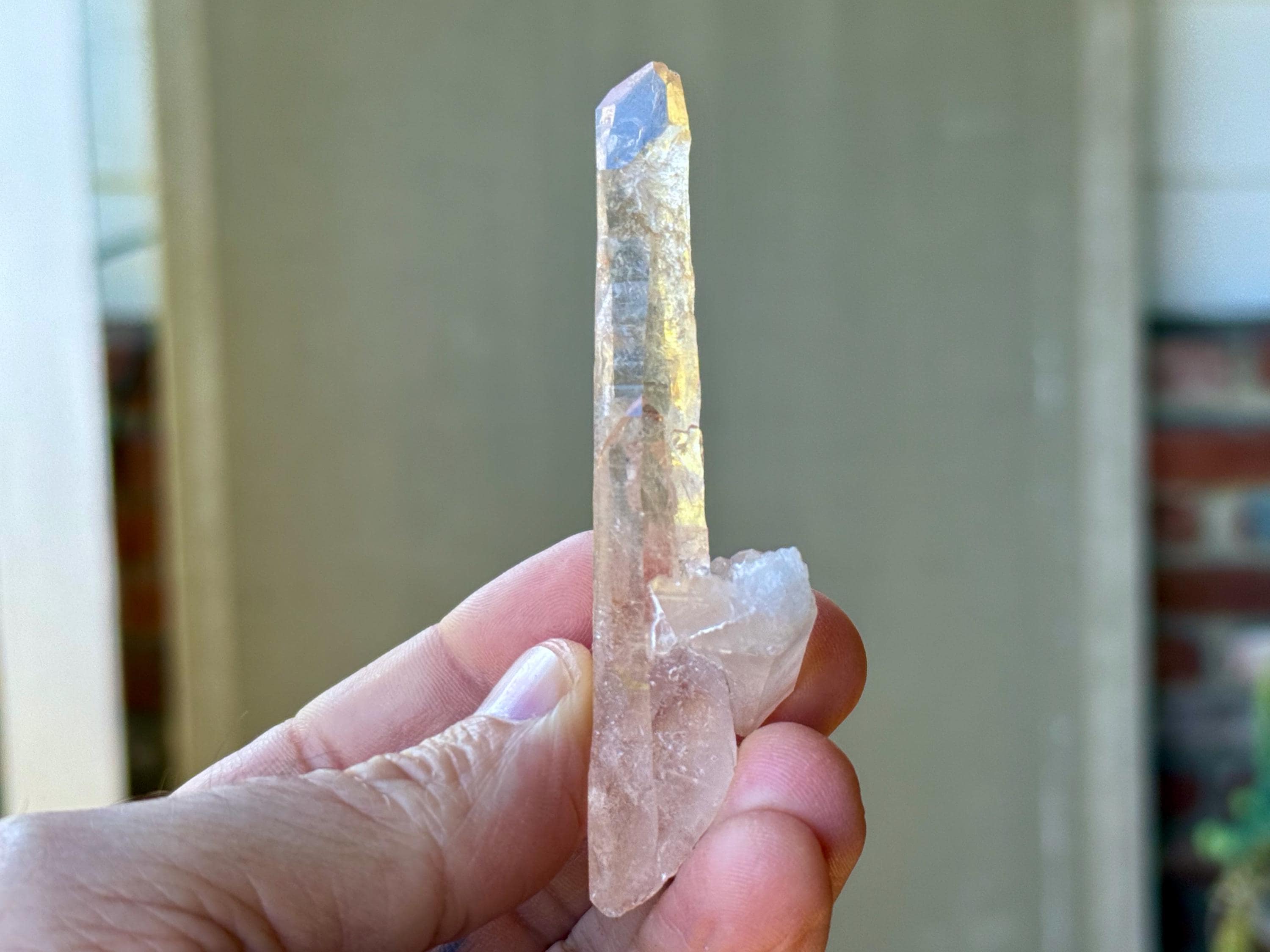 Gorgeous luster and water-clear clarity to this exceptional Pink Laser Quartz crystal with an elongated formation. Lovely etchings on the sides and an excellent termination.
