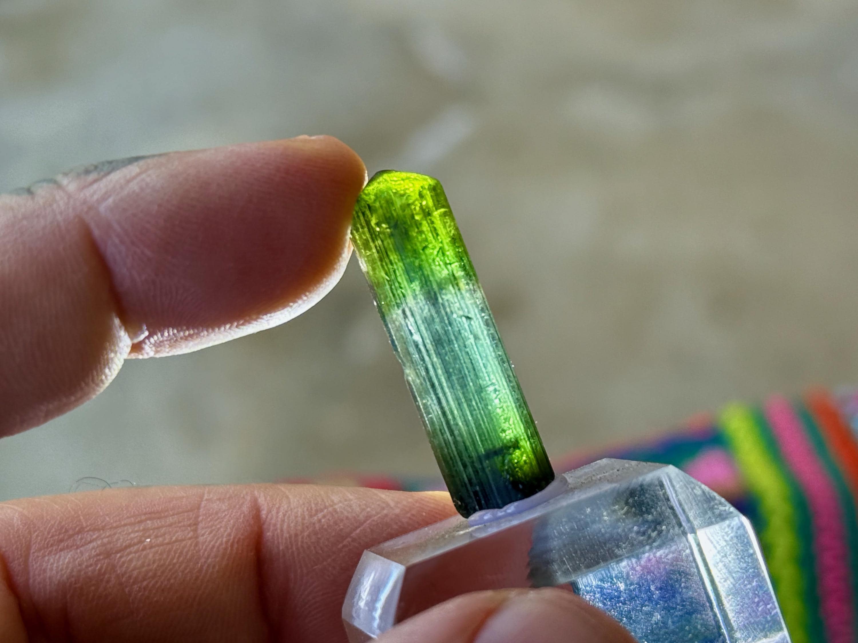 A superfine, all natural, bicolor Tourmaline from Cruzeiro, this crystal exhibits spectacular luster and stunning color!