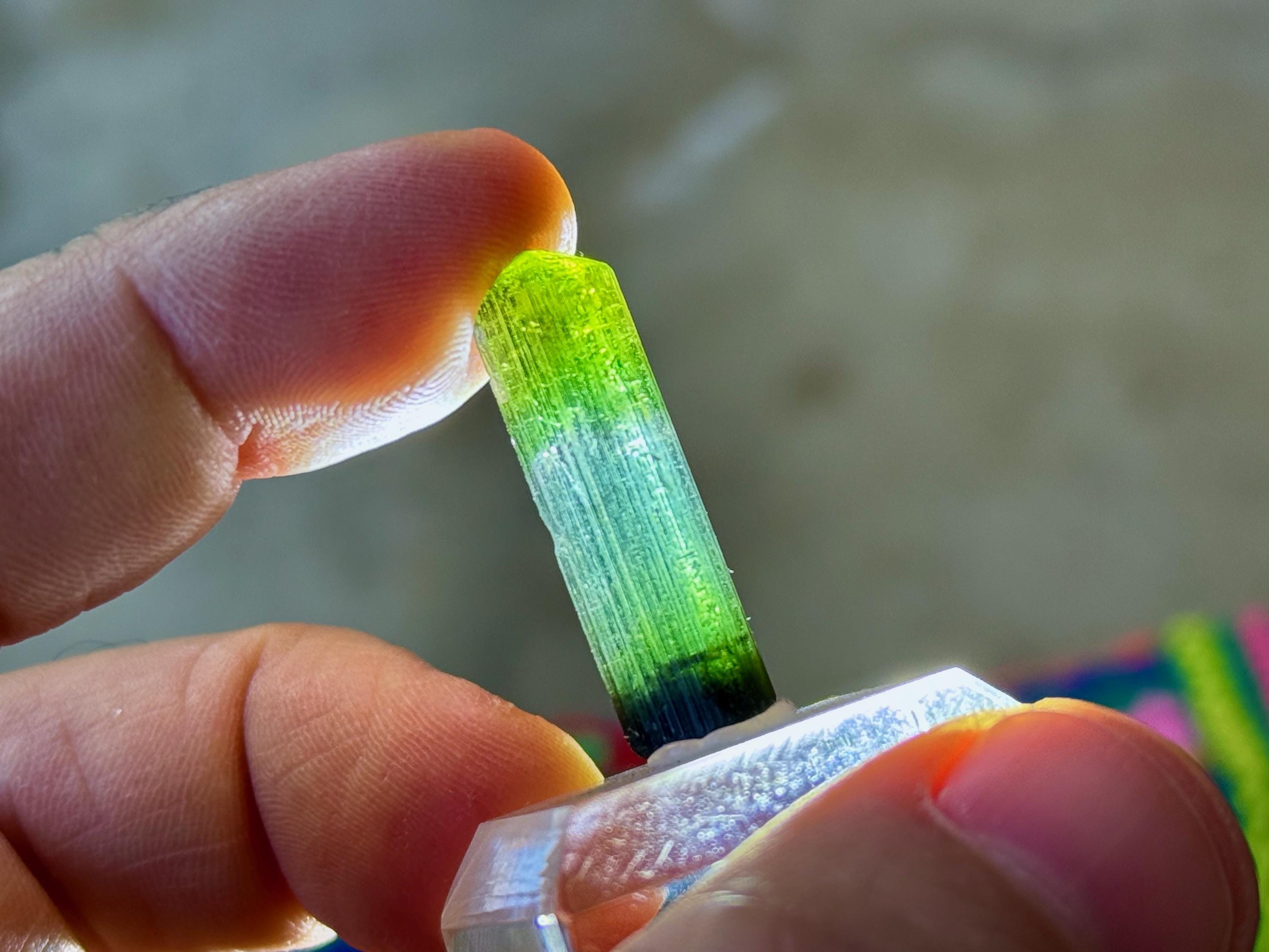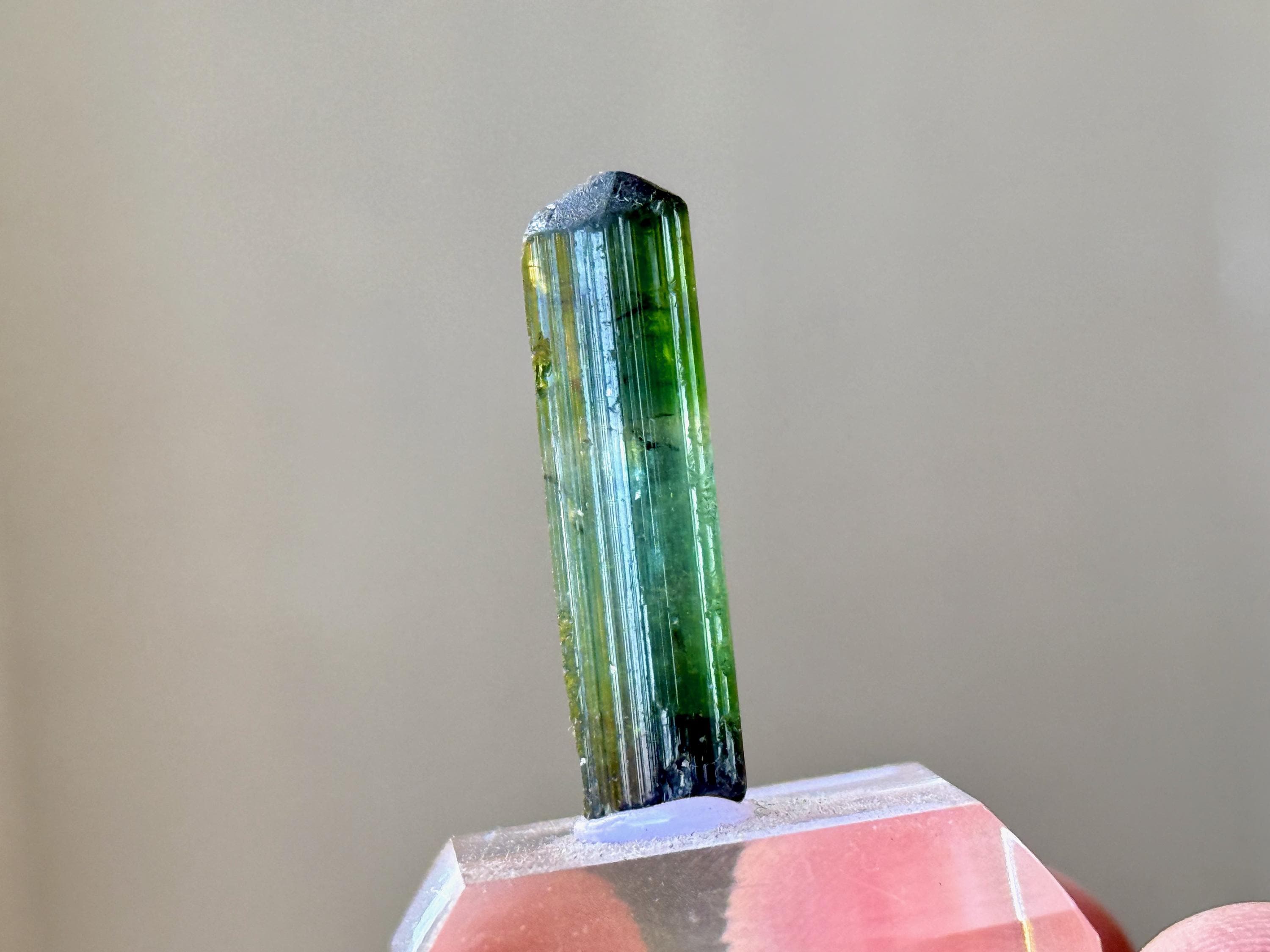 This Tourmaline crystal possesses a sky blue body with gradient green color at both the base and the cap. We have done our very best to capture the color faithfully, and these photos were taken in natural, partially shaded light with no manipulation.
