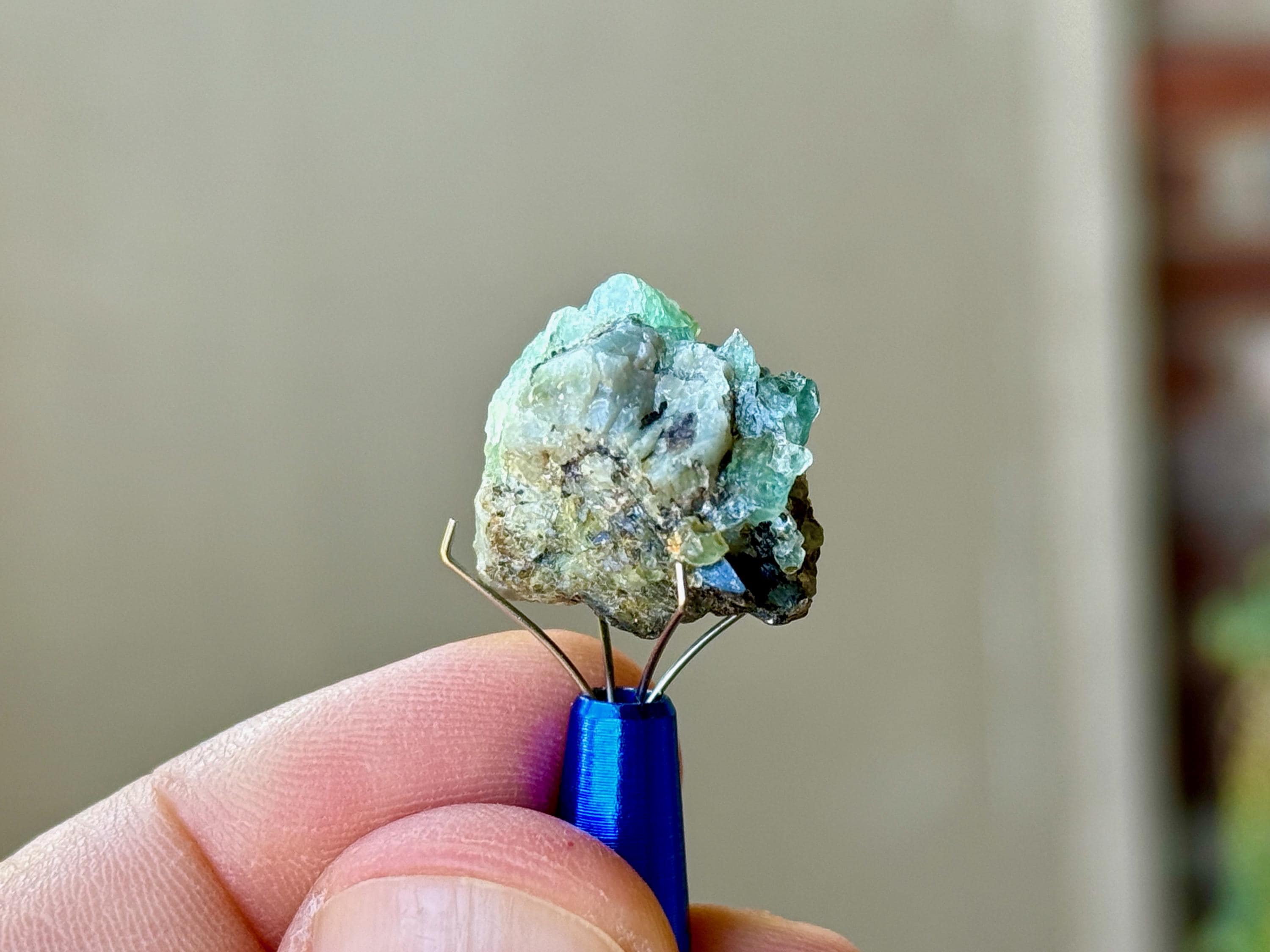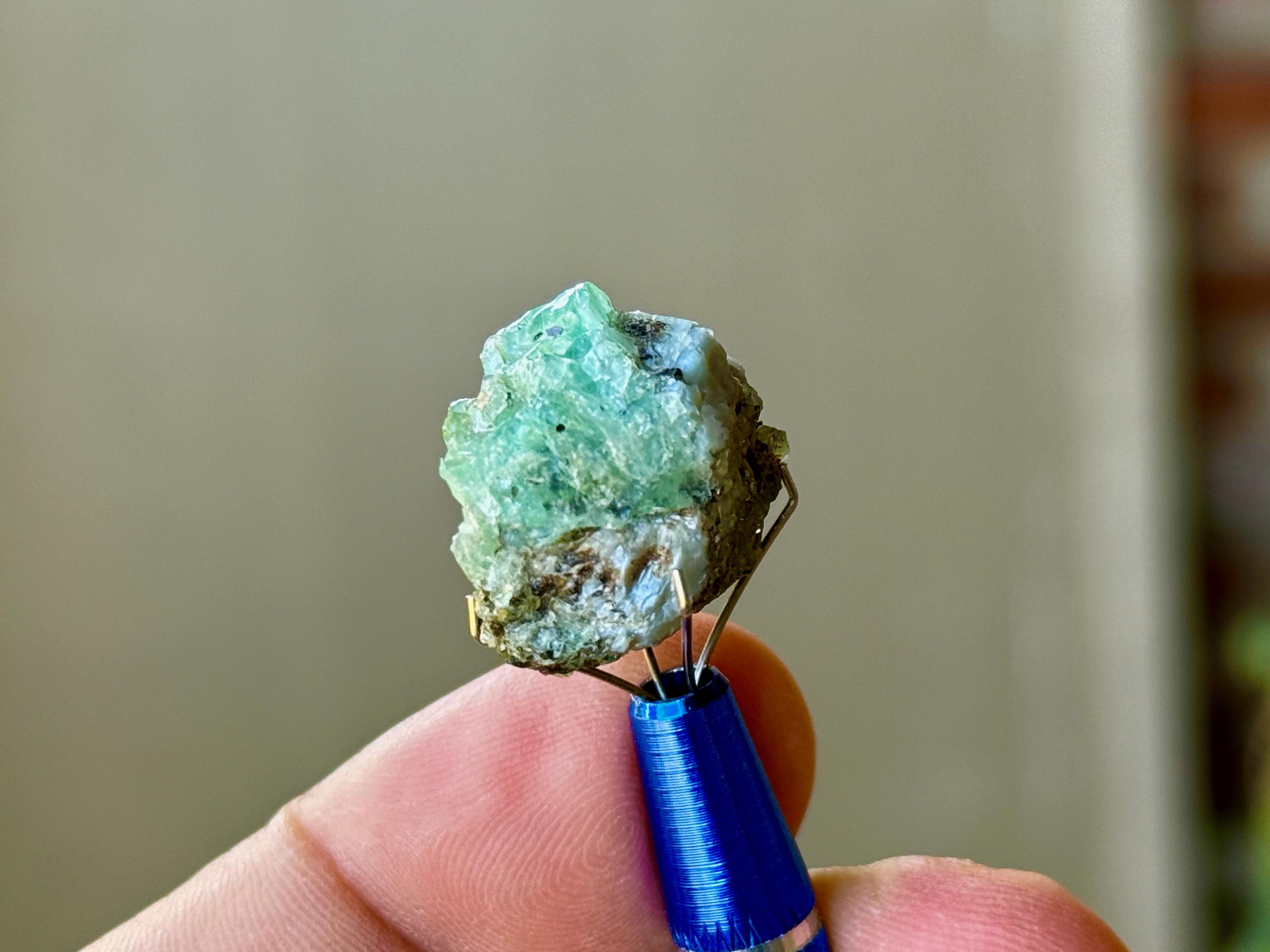 Gorgeous pale blue-green color to this sweet Emerald in a bit of a cluster formation. When backlit, this crystal will pass light around the edges (not so much in the base or center). Nicely terminated all around.