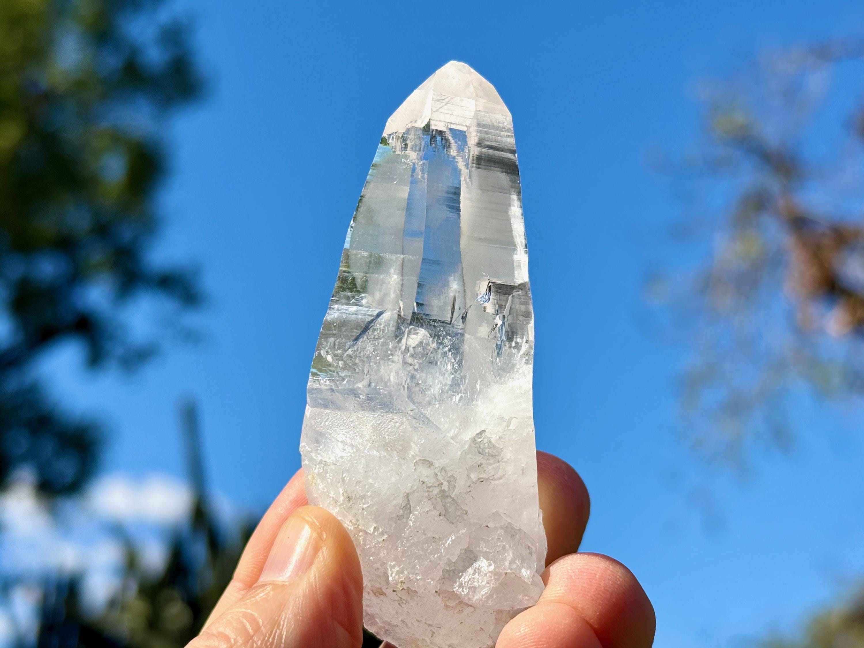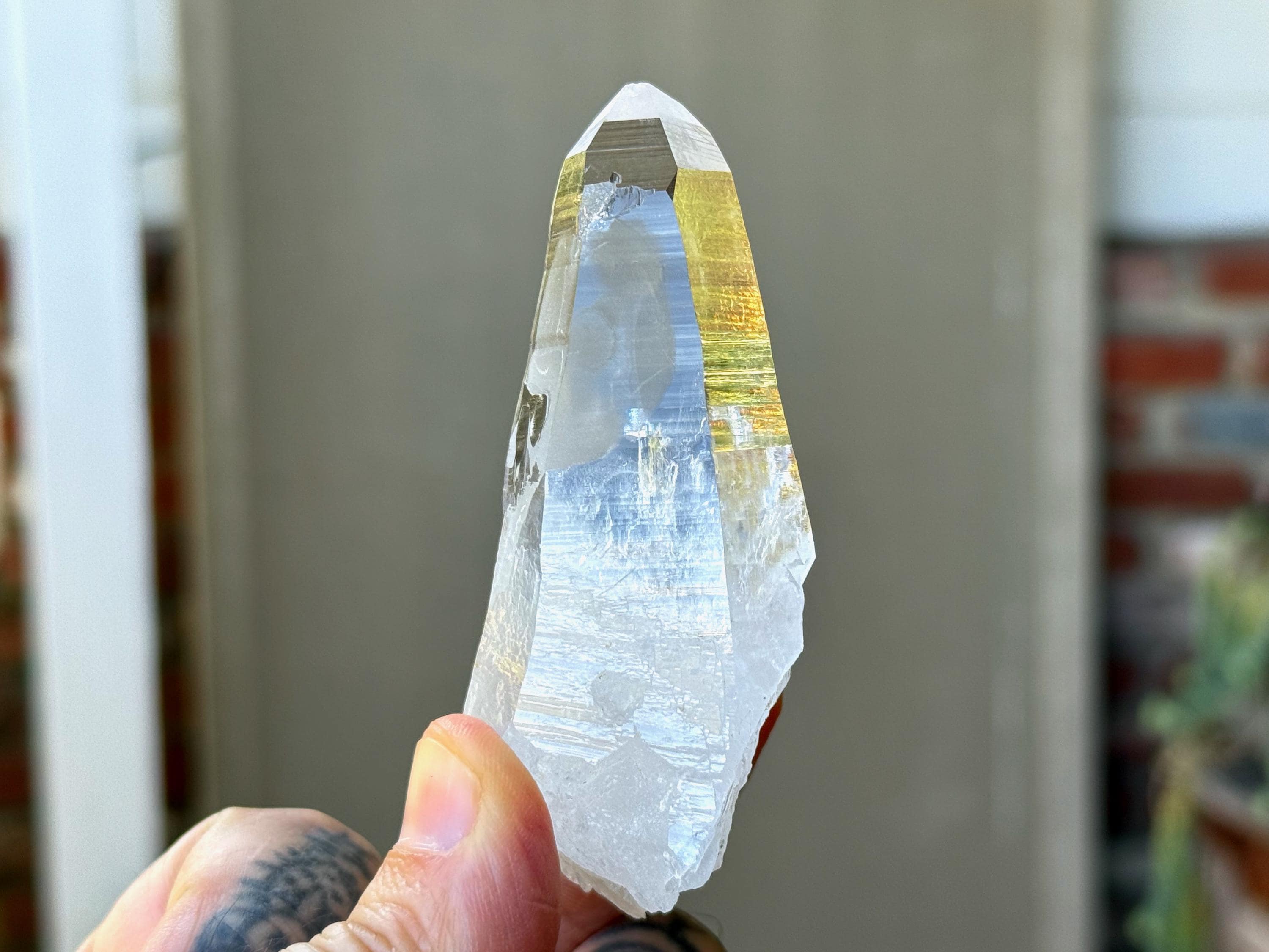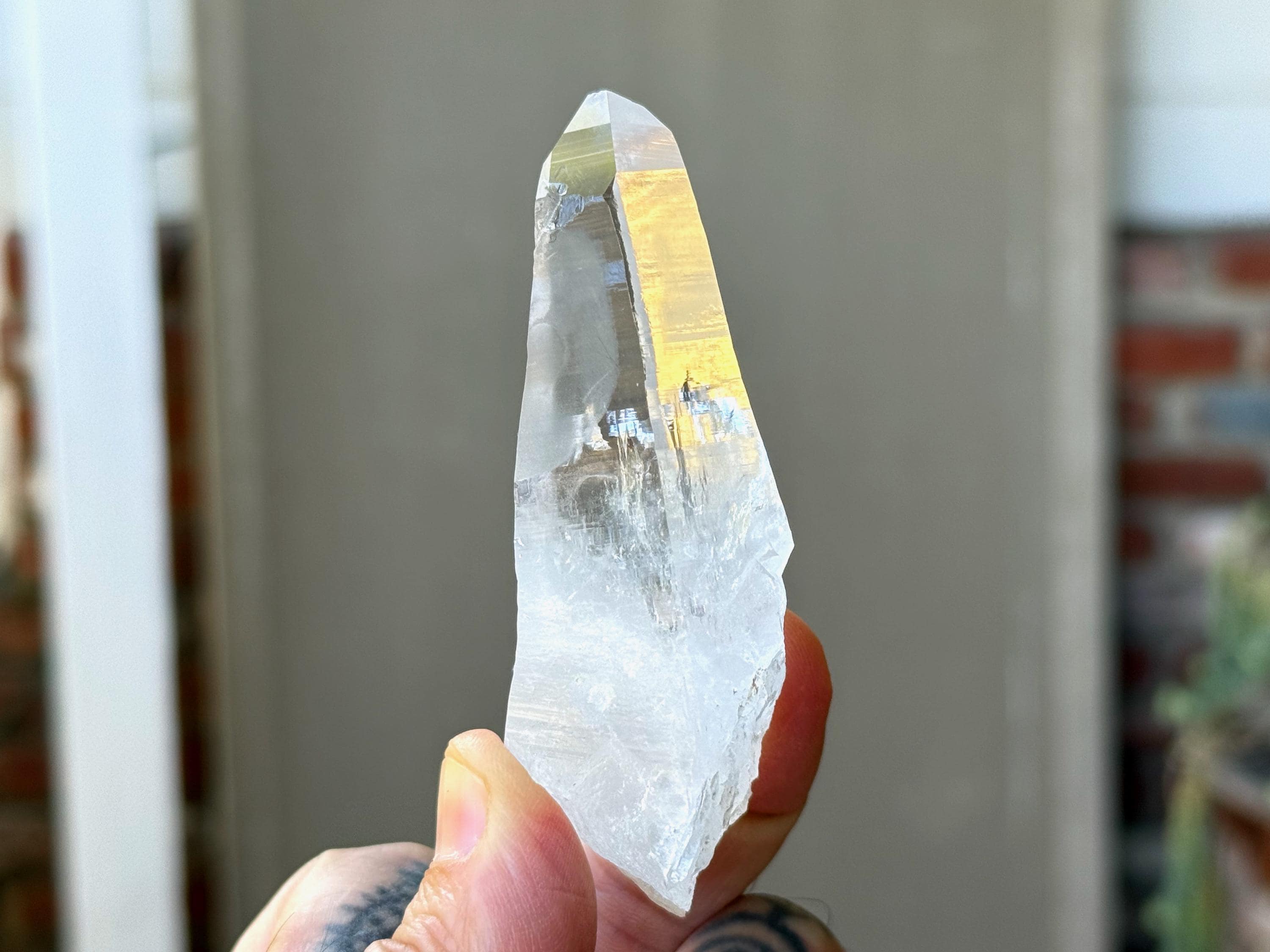*Please note this crystal is clear and colorless. Any yellow hues in the photos are a result of the natural sunlight reflecting off the crystal.