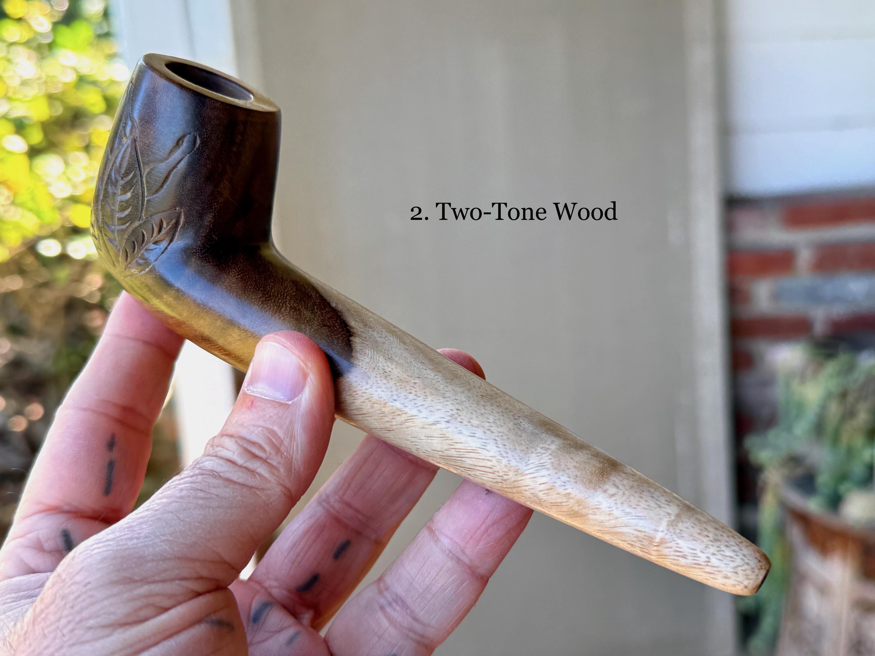 These traditional Tobacco Pipes with leaf designs were hand-carved from natural tropical hardwoods. These elegant pipes for tobacco/mapacho are intended for — but not limited to — shamanic or ceremonial use.