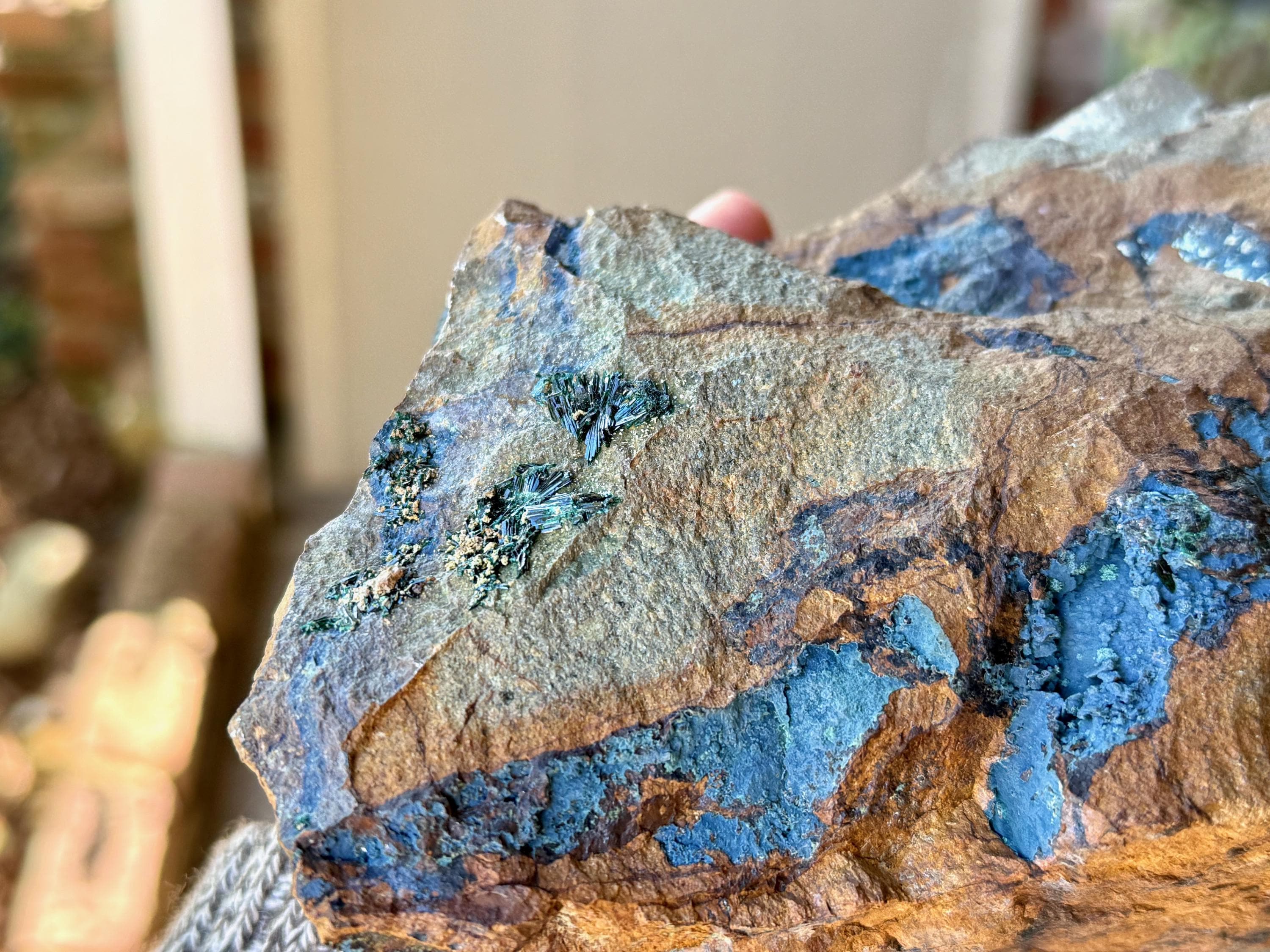 The top of this stone features a frosting of blue Azurite that covers nearly every inch of the surface. Atop this, we see hints of green Malachite around the edges, and multiple small "sprays" of what appear to be fibrous Malachite. These crystalline "sprays" are lustrous with a dark green color.
