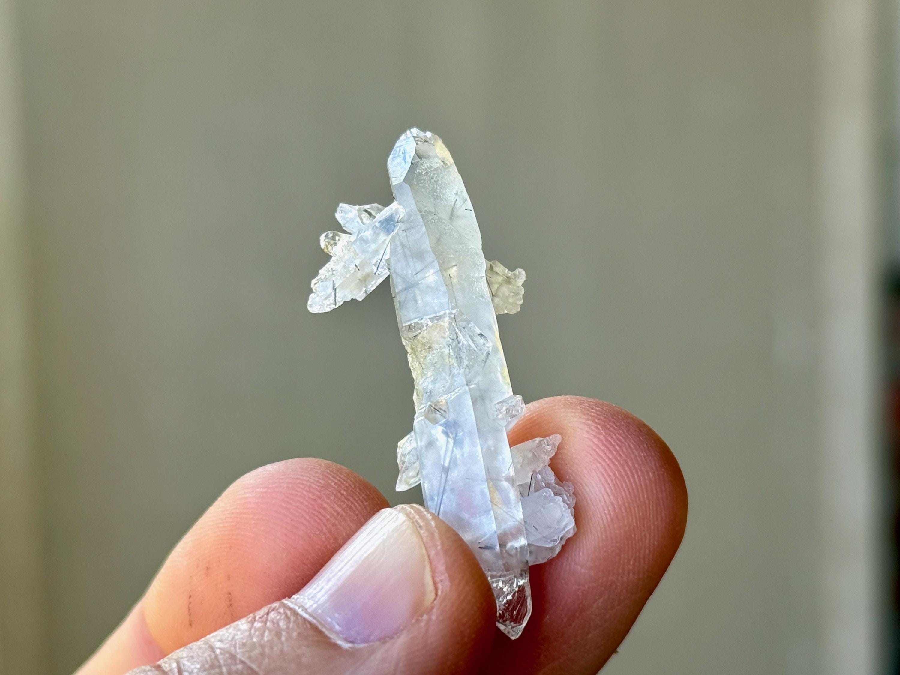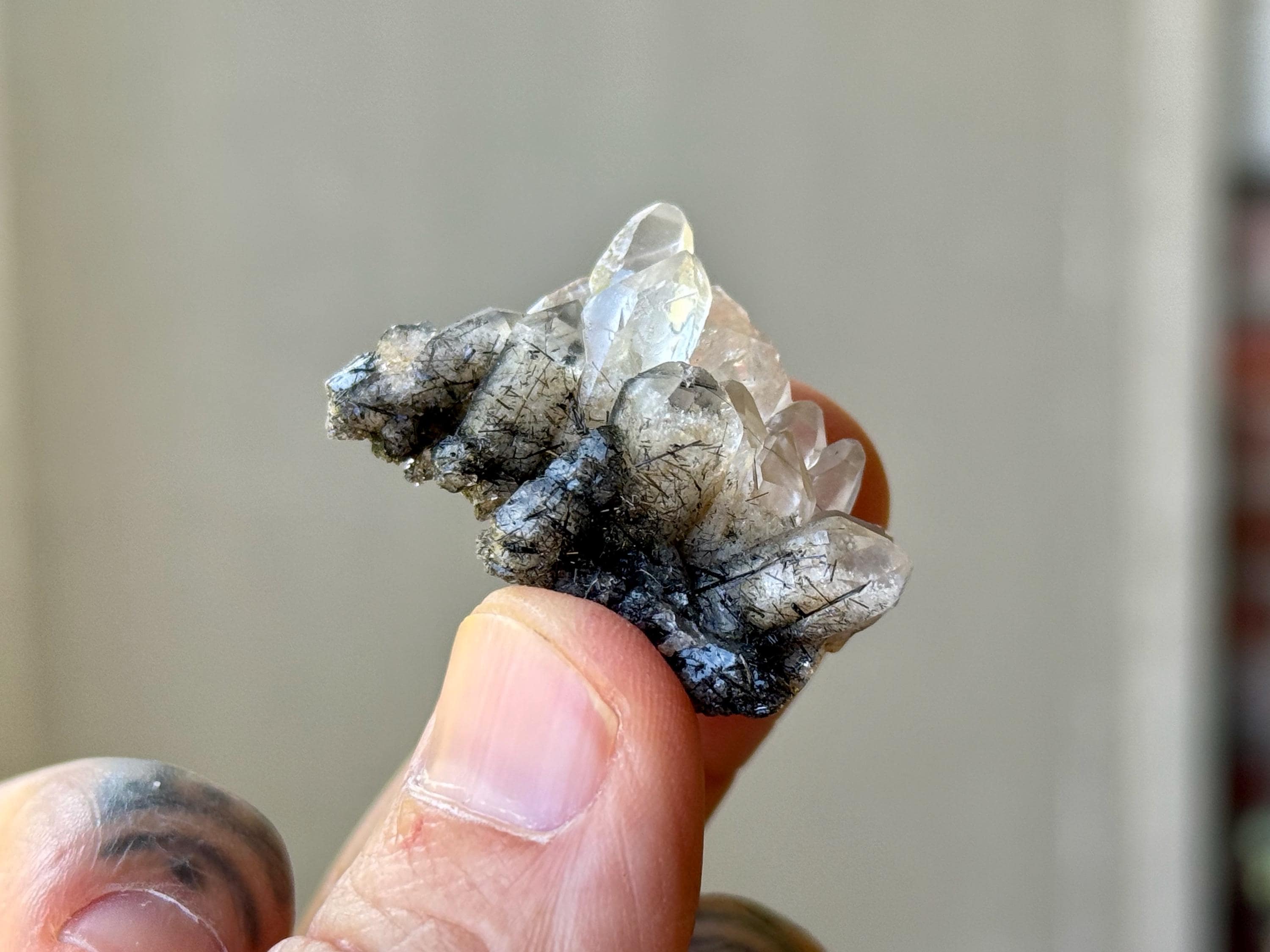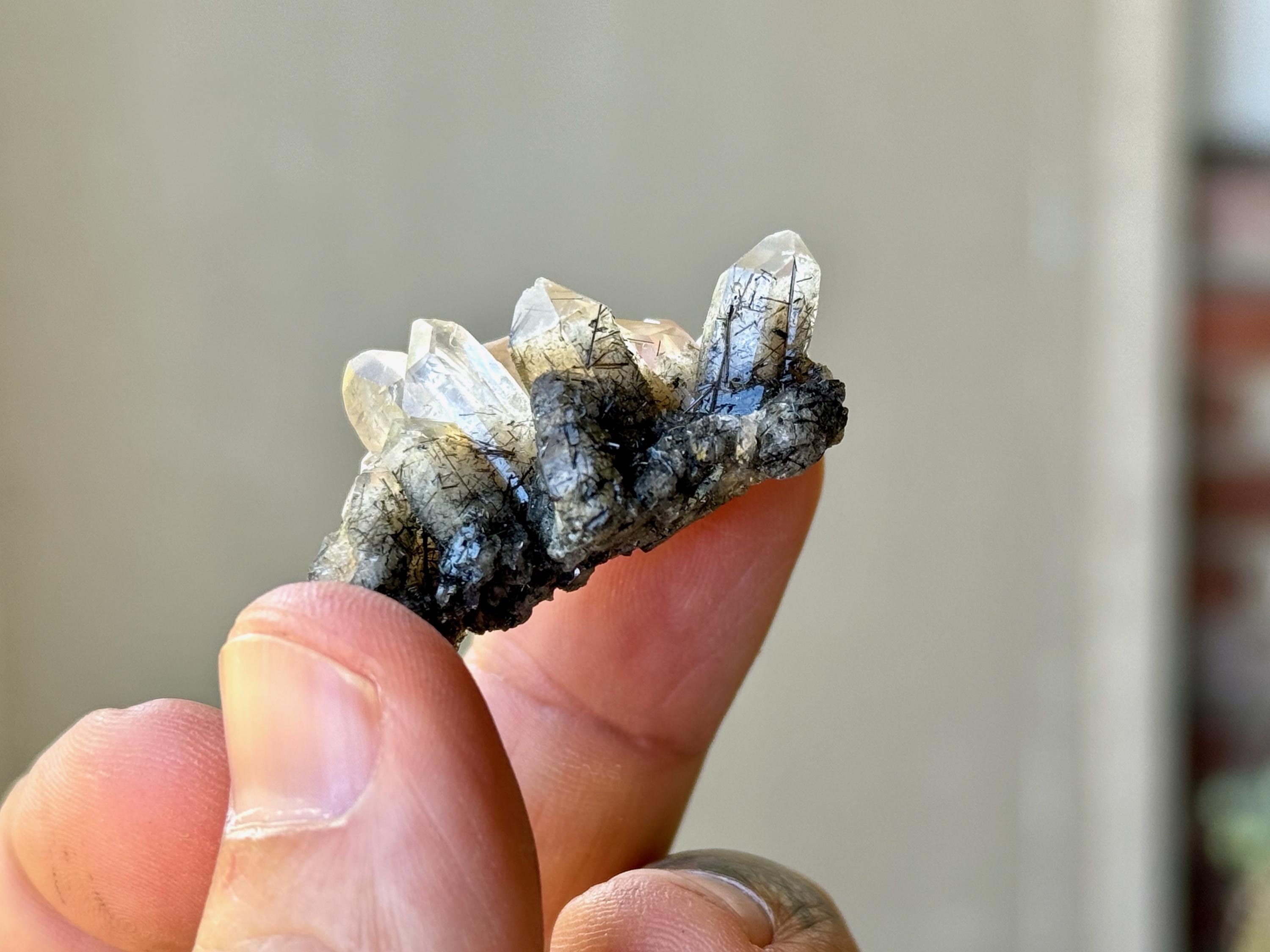 A beautiful collection of these unique Black Tourmaline Quartz crystals in a variety of formations. Each of these crystals has inclusions of Black Tourmaline "needles" within, with some being very densely included, and others being more clear with just sparse inclusions. All terminations are intact and very nice.