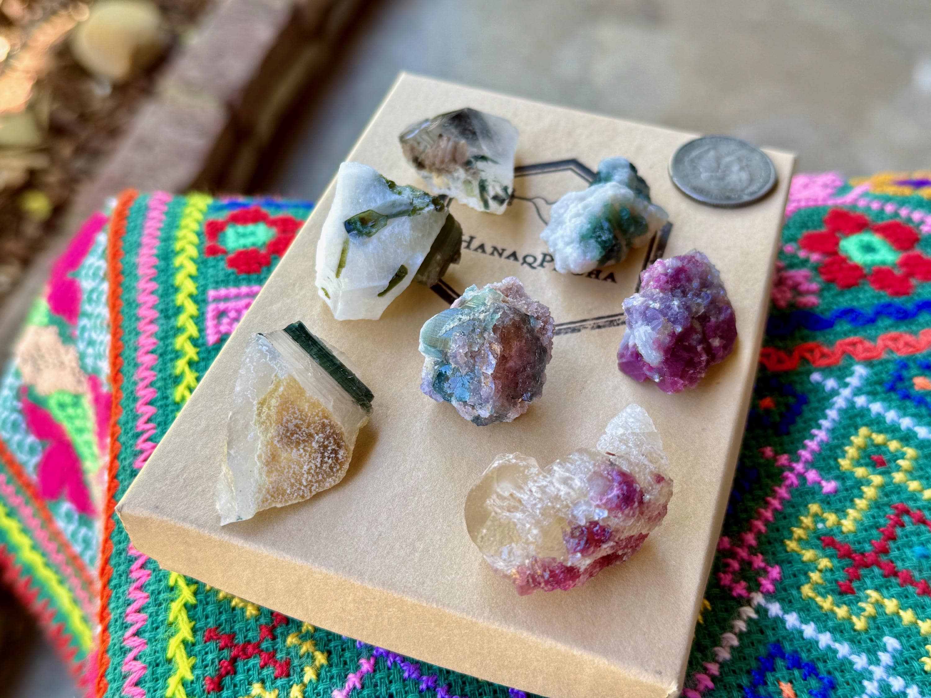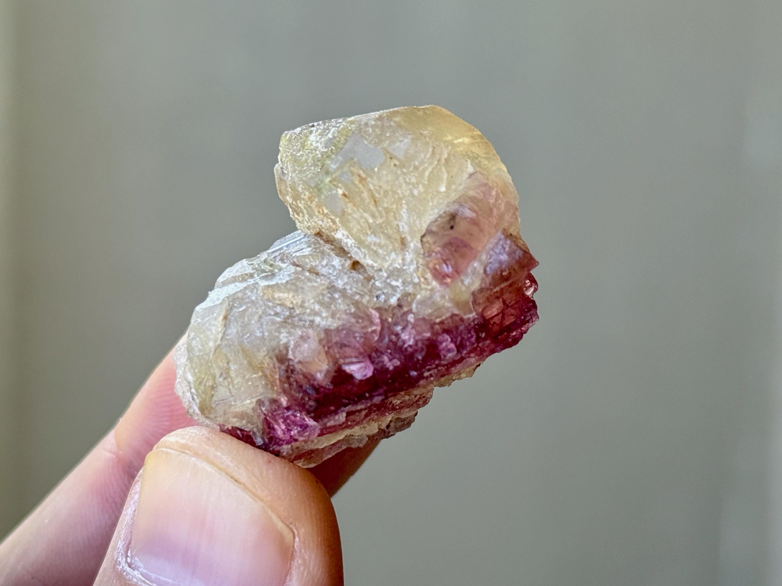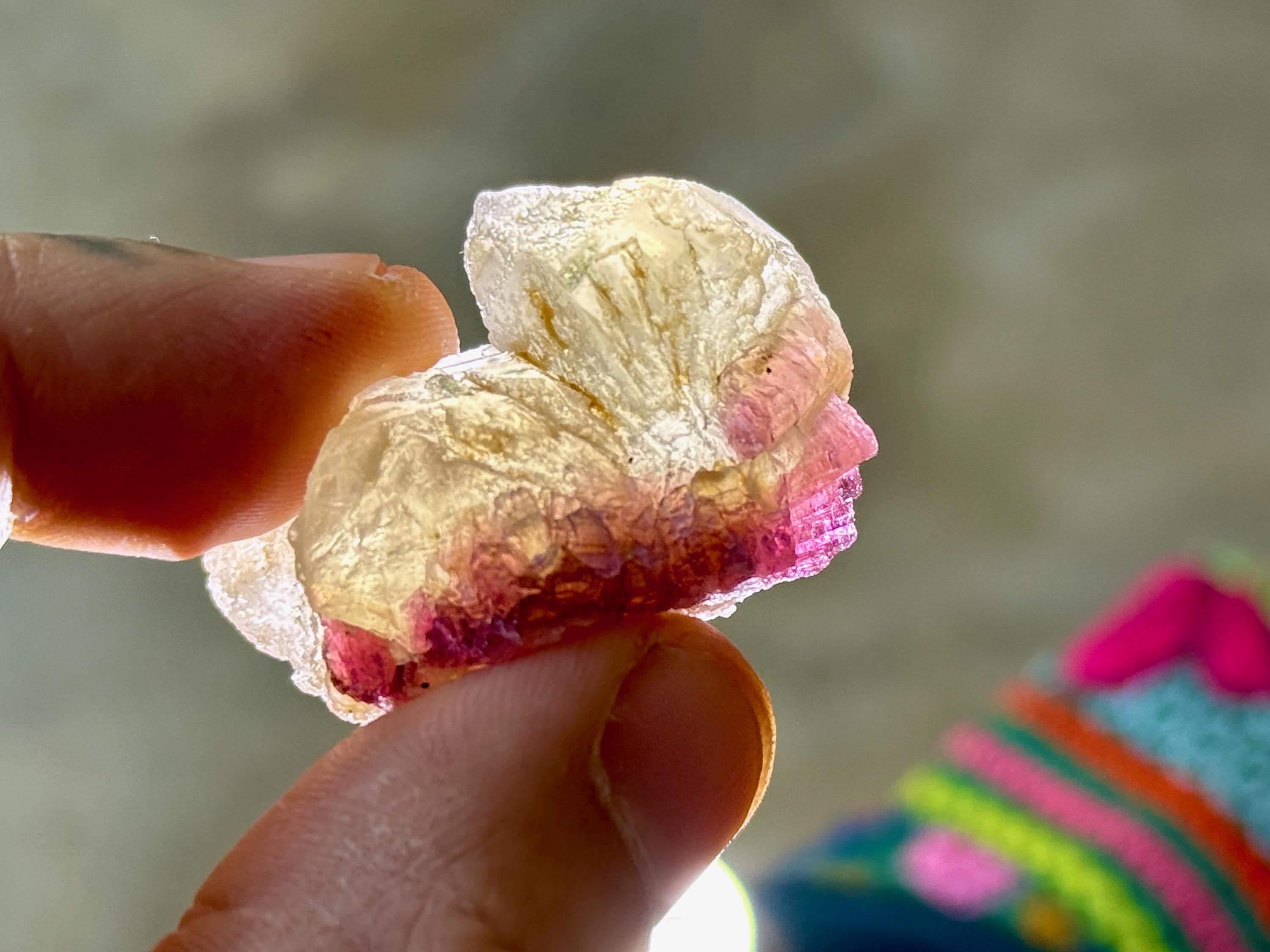 The crystals from this find include unique combinations of Quartz, Lepidolite, Citrine, Cleavelandite, Albite and Feldspar, with vividly colored Tourmalines in lovely hues of green, pink, purple and blue. Crystals with combinations of these minerals are sometimes referred to as "Unicorn Stones."