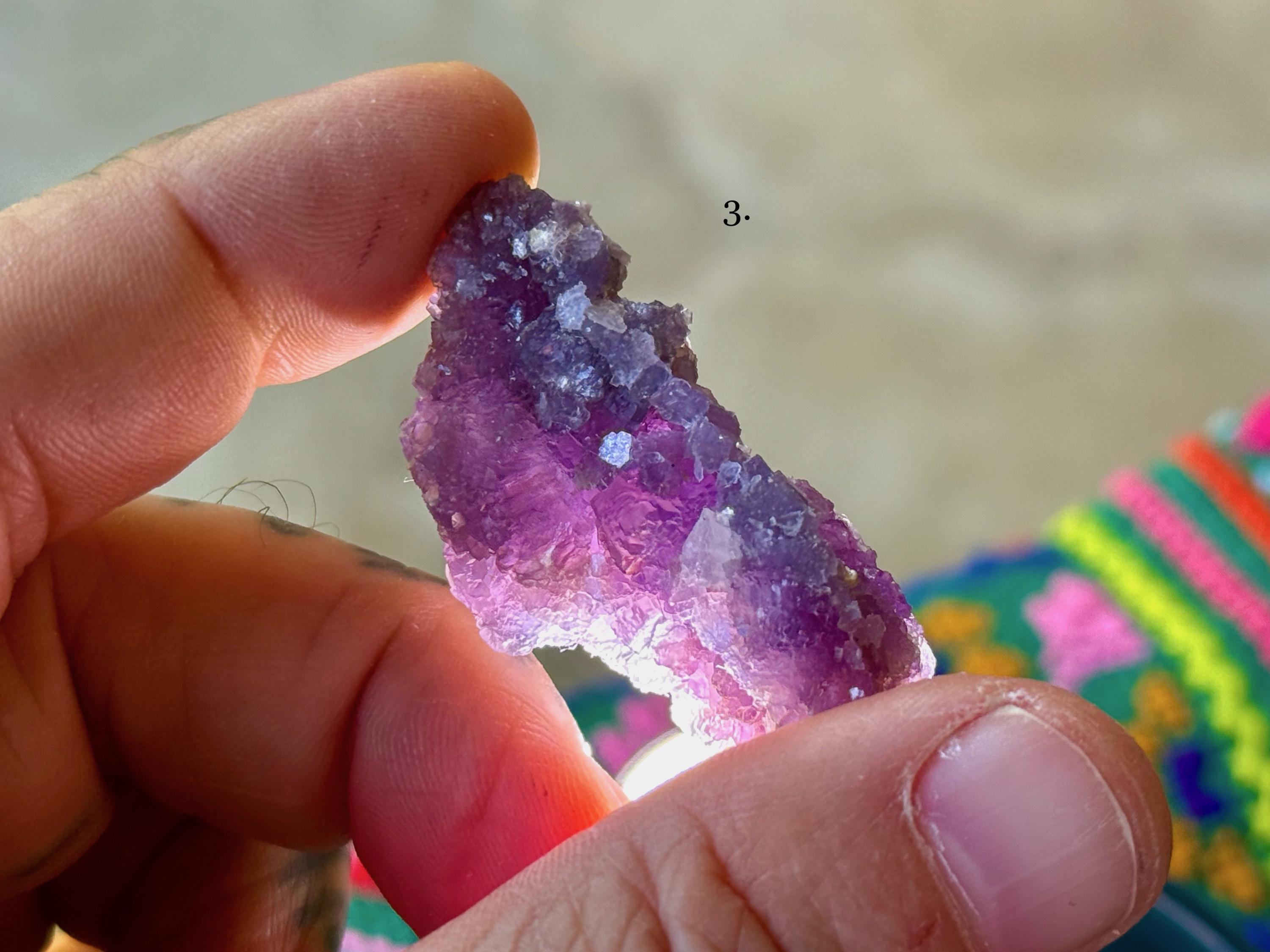 Gorgeous purple hues and crystalline formations to these beautiful Lepidolites. We've included photos in natural light, as well as backlit, to show off their translucency.