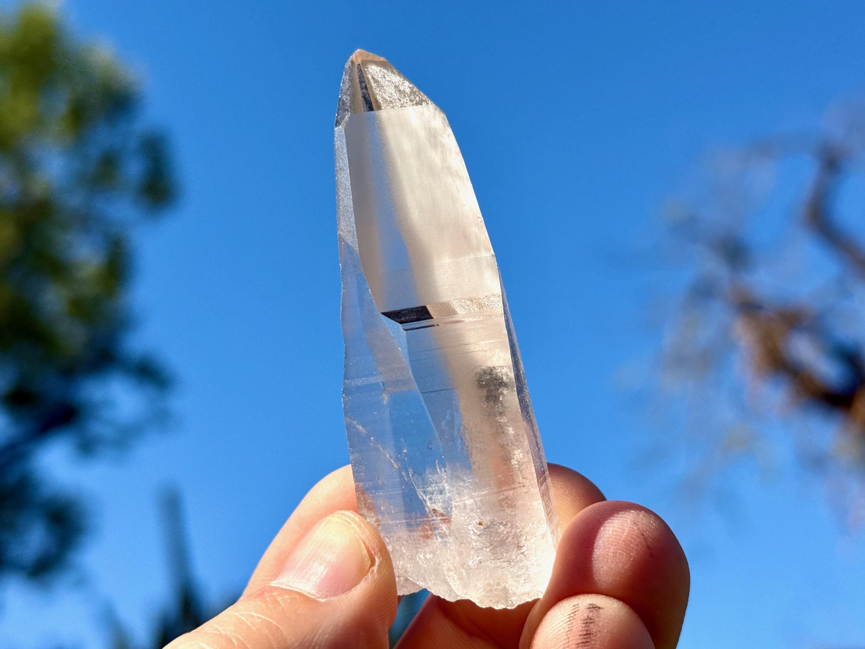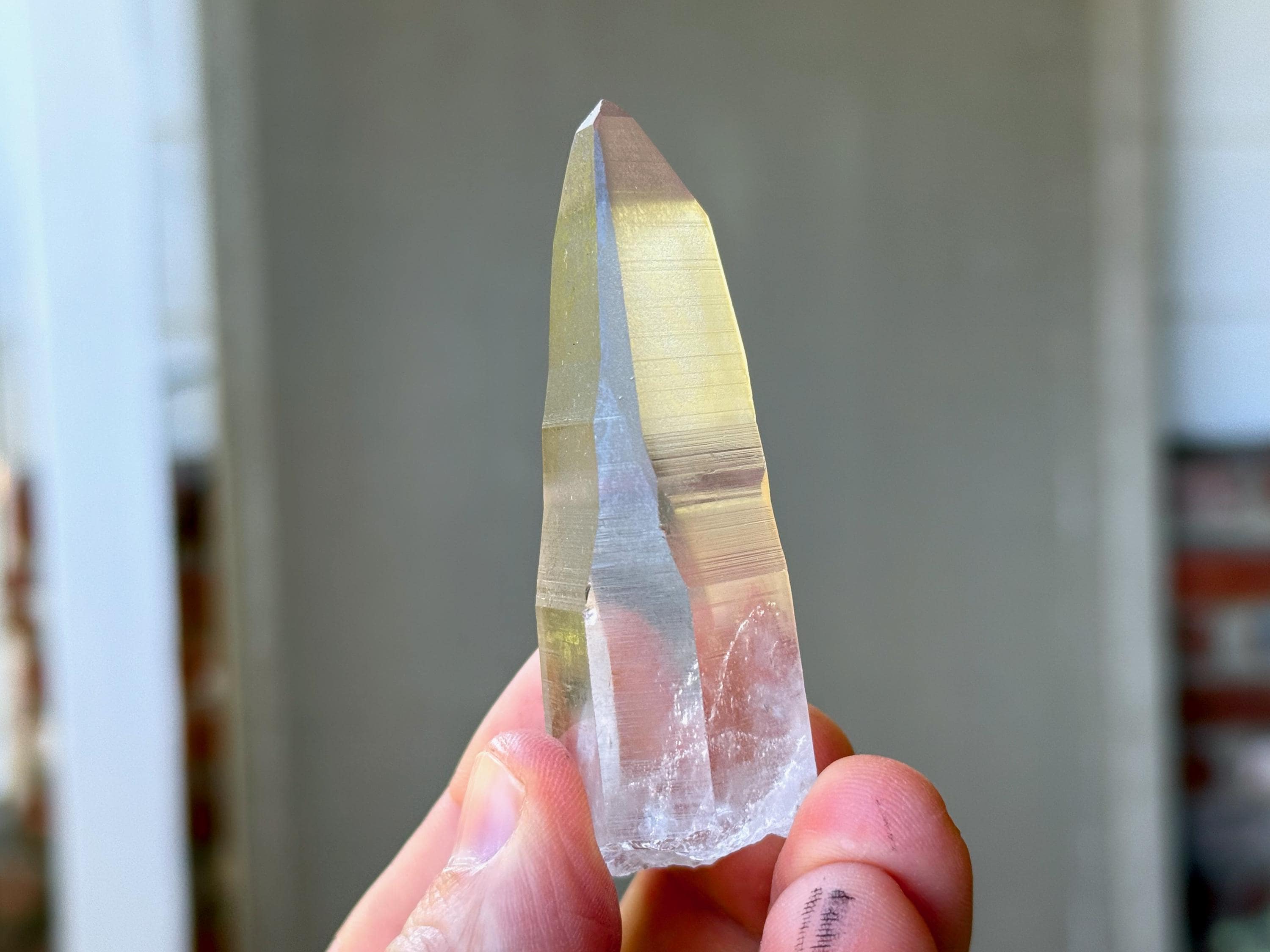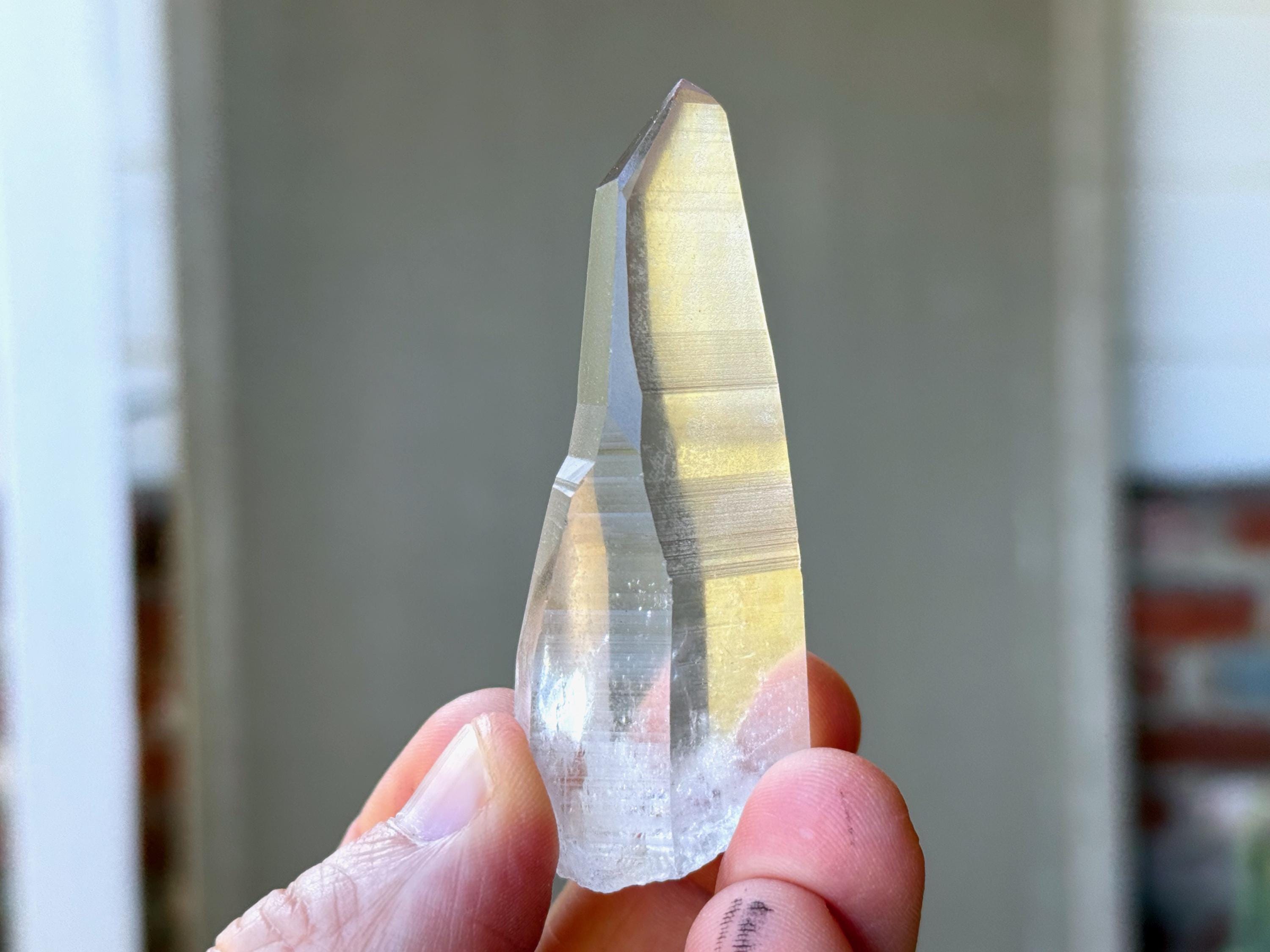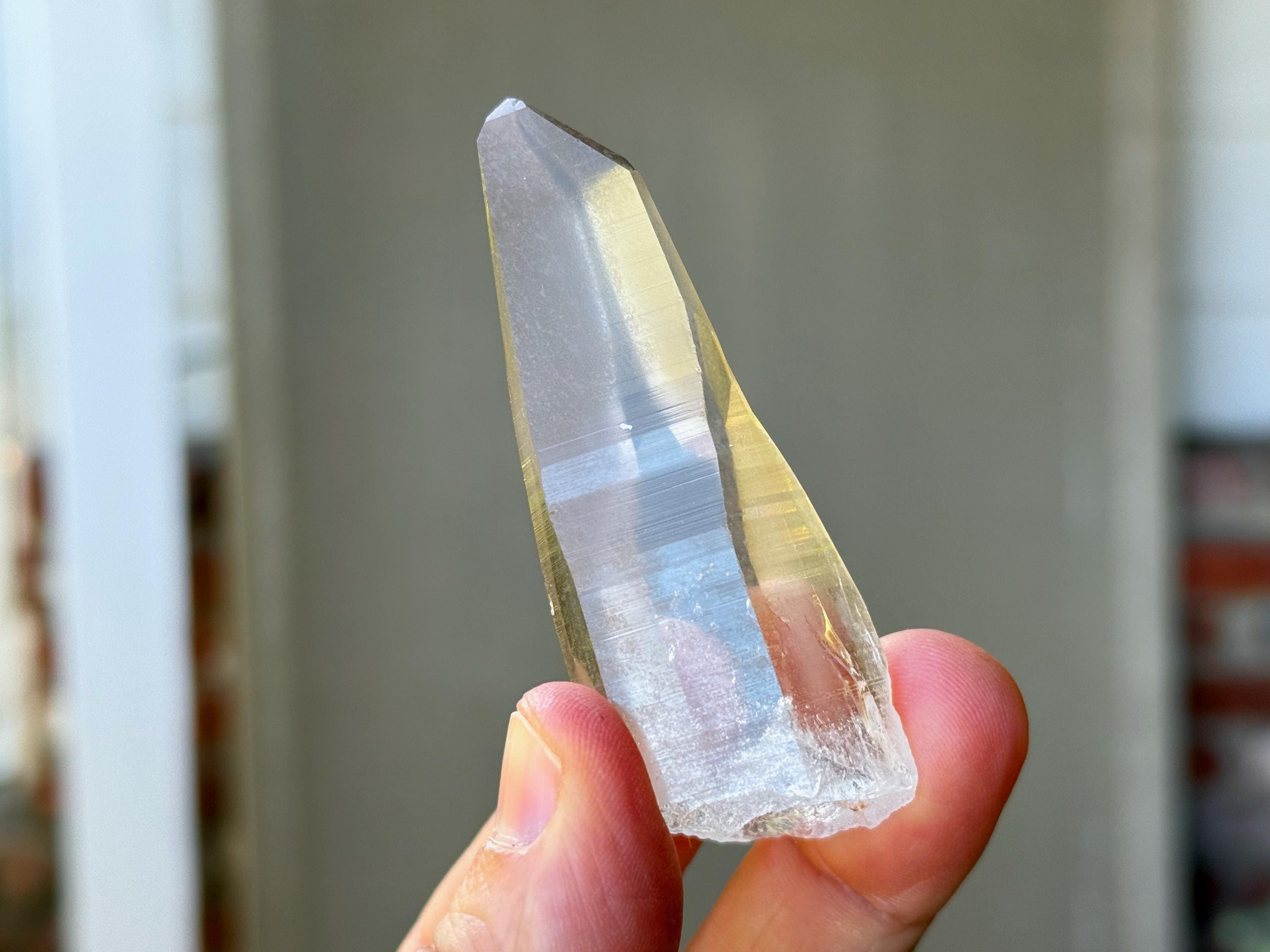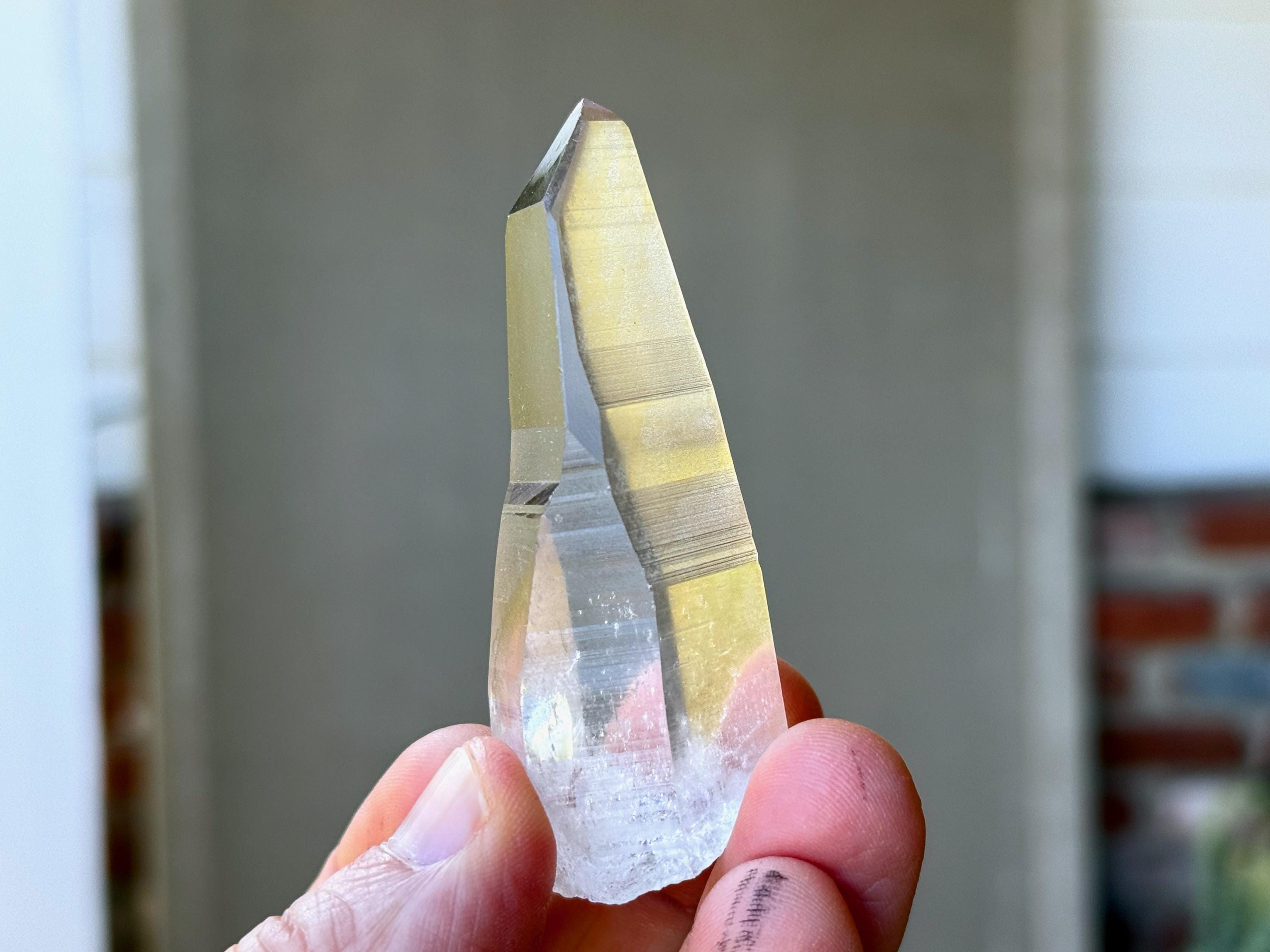 *Please note this crystal is clear and colorless with a very slight tinge of pink. Any yellow hues in the photos are a result of the natural sunlight reflecting off the crystal.