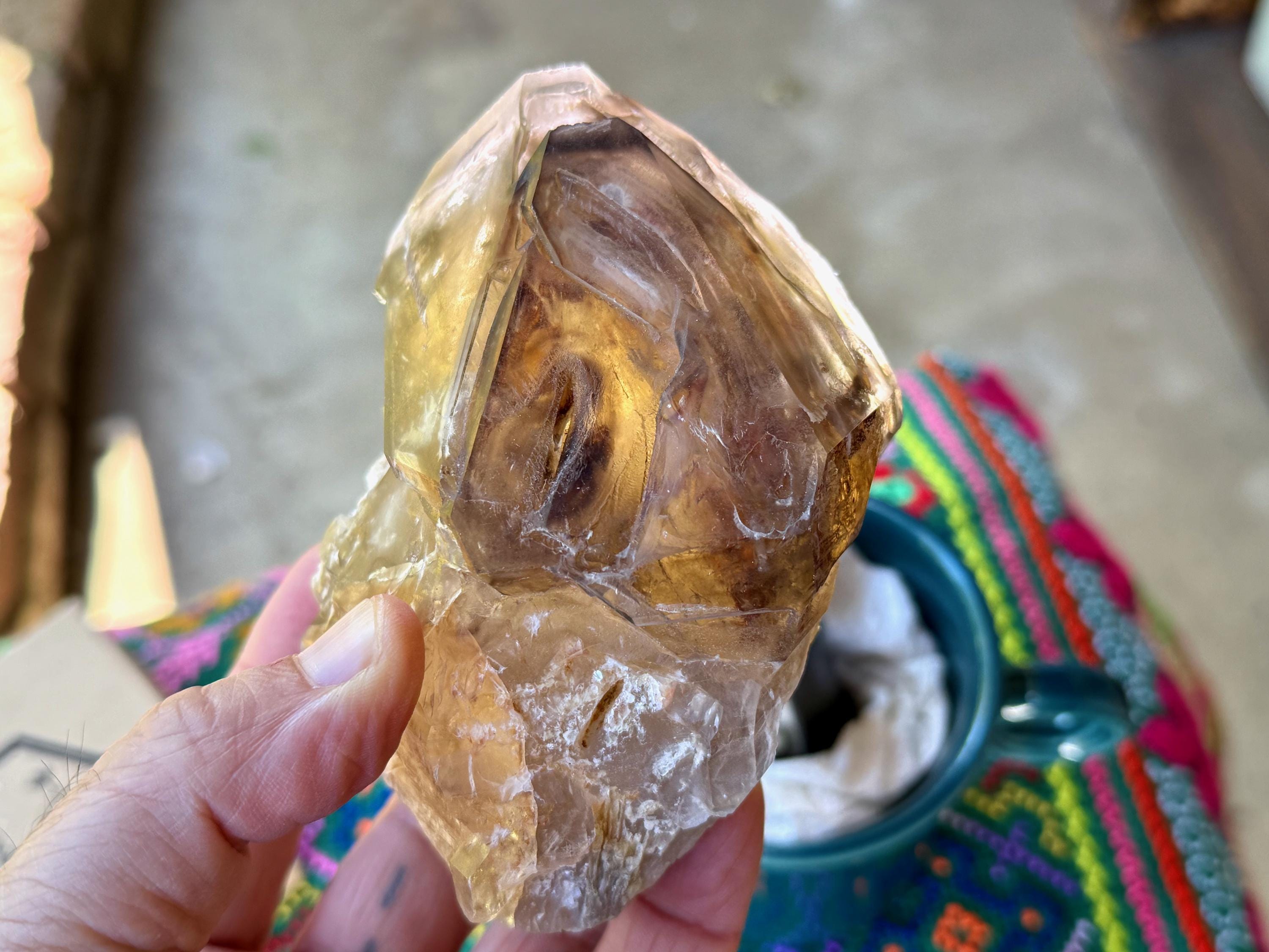 We are immediately struck by the large "crown" on this crystal, deeply smoky in hue with a variety of etchings, encompassing its main facet and secondary facets. The complexion is mildly hazy but we can still see inside this area and observe some mild orange Hematite inclusions along with a clearer Quartz growth within (as opposed to smoky). When backlit, as in Photos 3-4, it passes light beautifully.