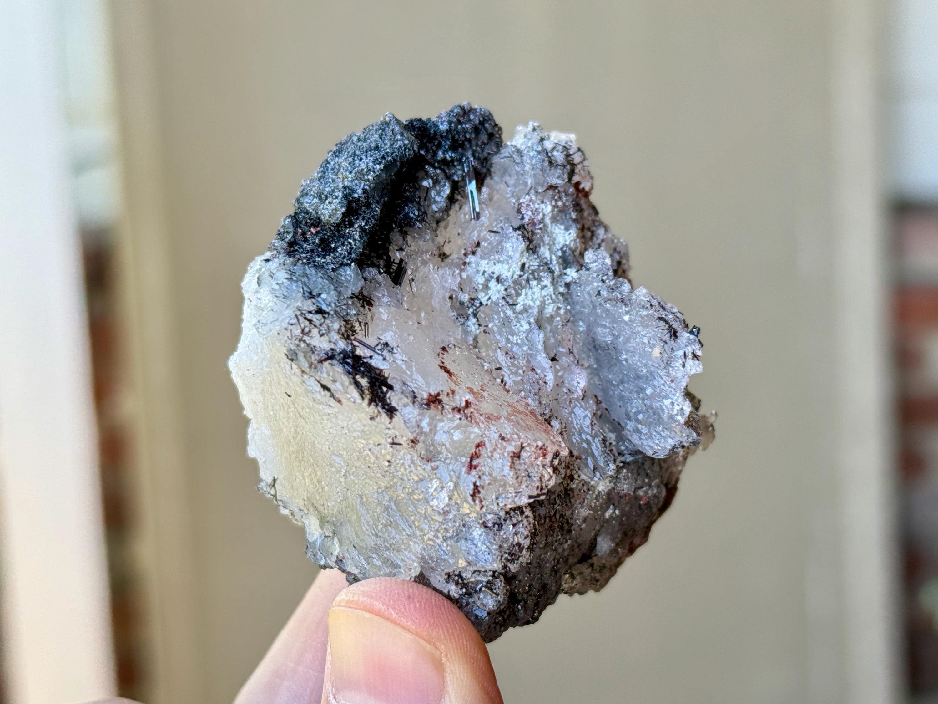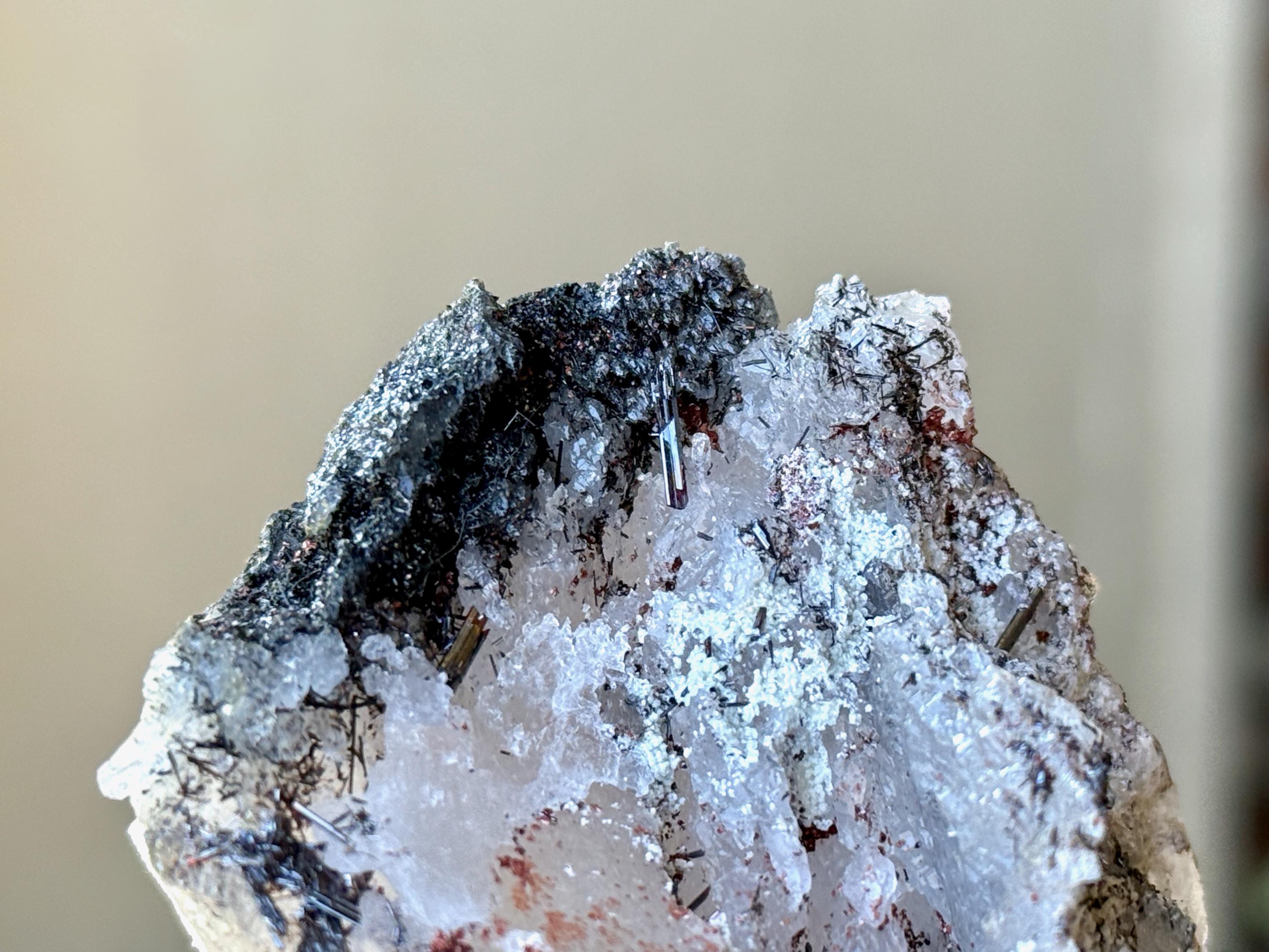 Superb luster and Elestial formation to this unusual Samadhi Quartz crystal with ample inclusions of Black Tourmaline. We can see a scattering of these Black Tourmaline needles on the broad side of this piece, along with some white "frost." Then at both the base and top of the piece, we can see a very dense inclusion of these same Black Tourmaline needles. In some areas, it appears the Black Tourmaline has taken on the red color from Hematite.