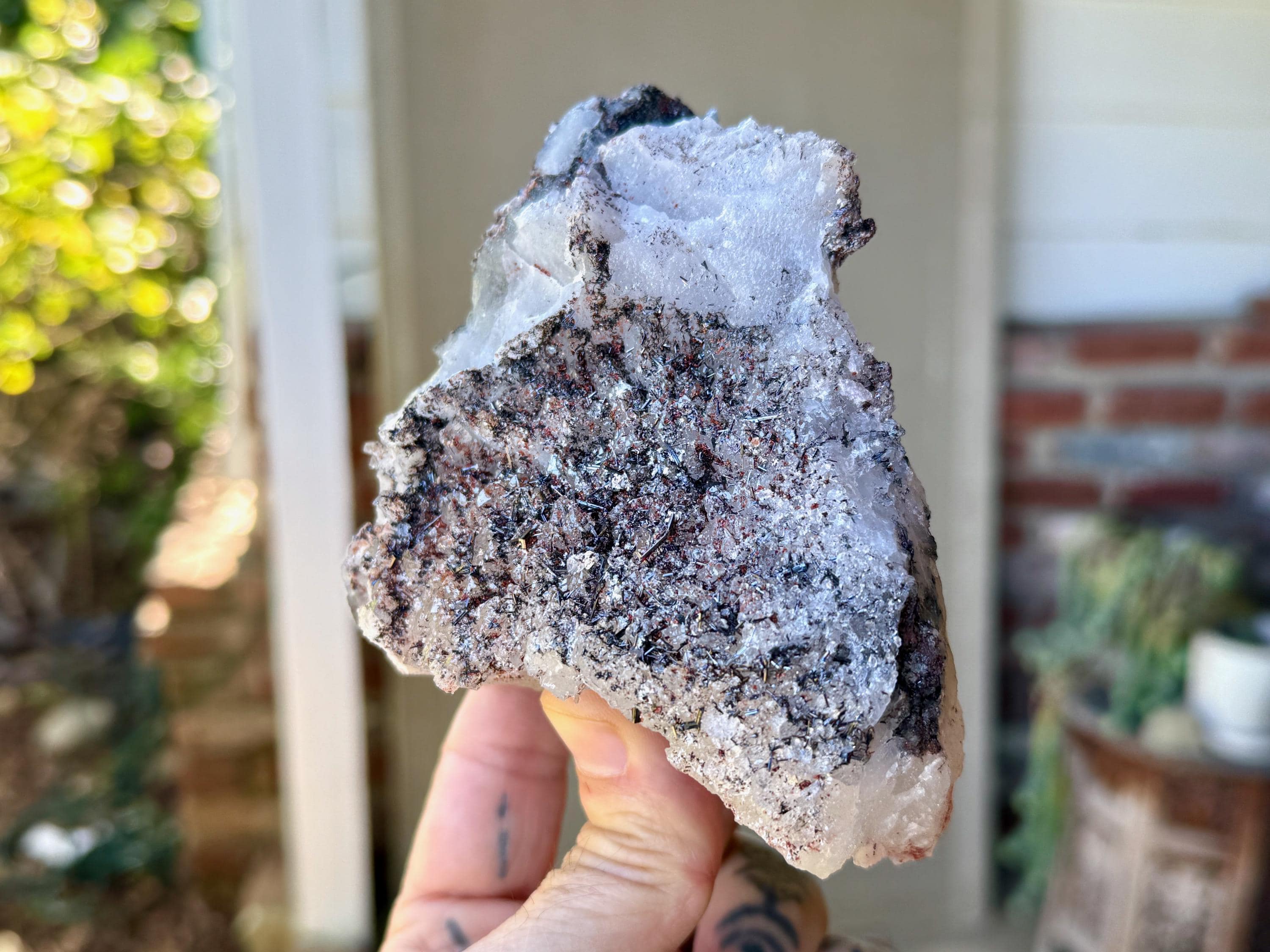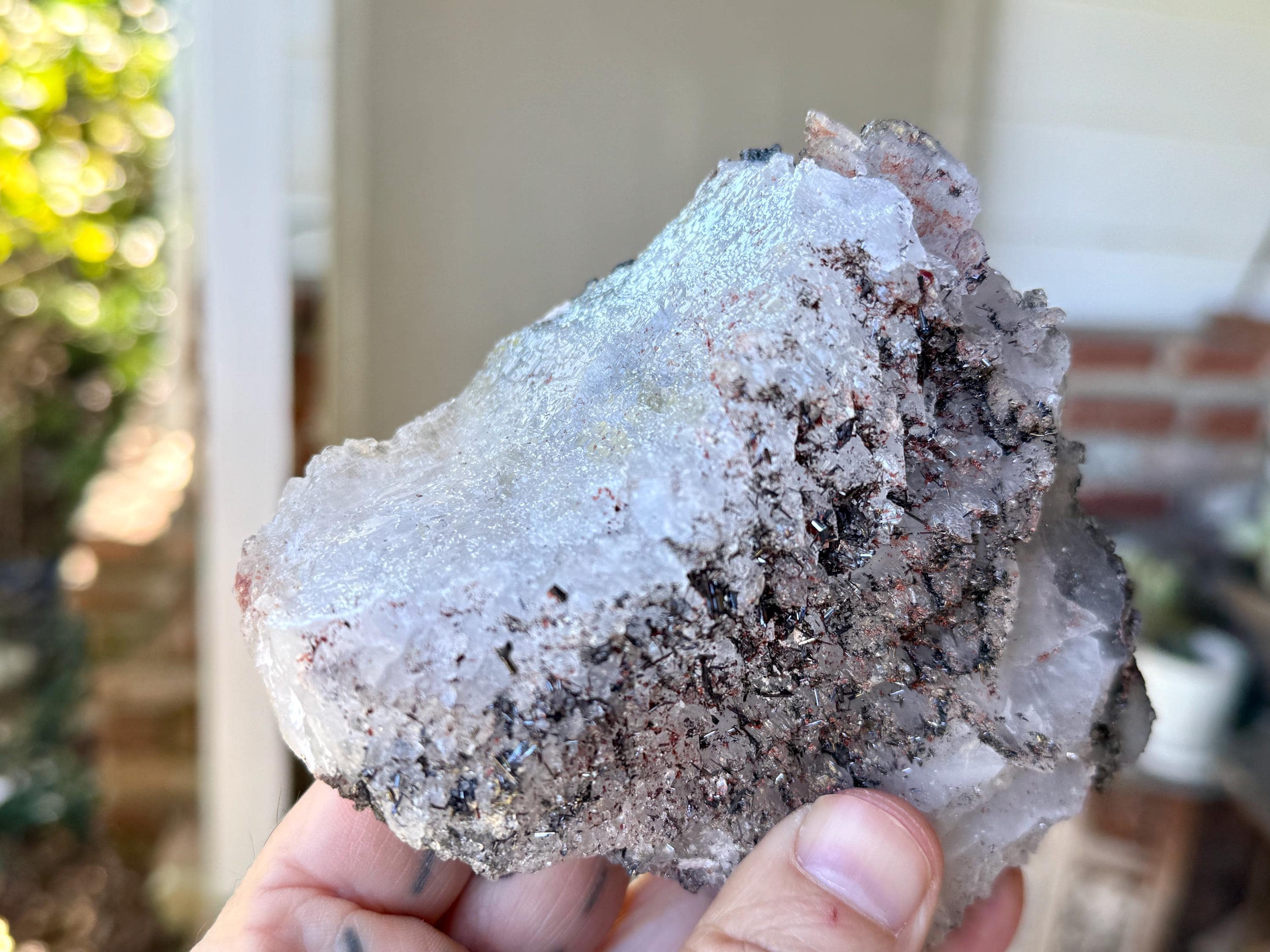 Each side of this piece shows a different presentation of the Black Tourmaline inclusions. On the broad "top" portion, we see a dense coating of Black Tourmaline needles, while to the right side we see a more Elestial formation to the Quartz crystal with a sparse inclusion on top of these same Black Tourmaline needles. Each side is self-healed and terminated, and there is a naturally flat base that allows this piece to sit nicely for display (Photos 1-2).