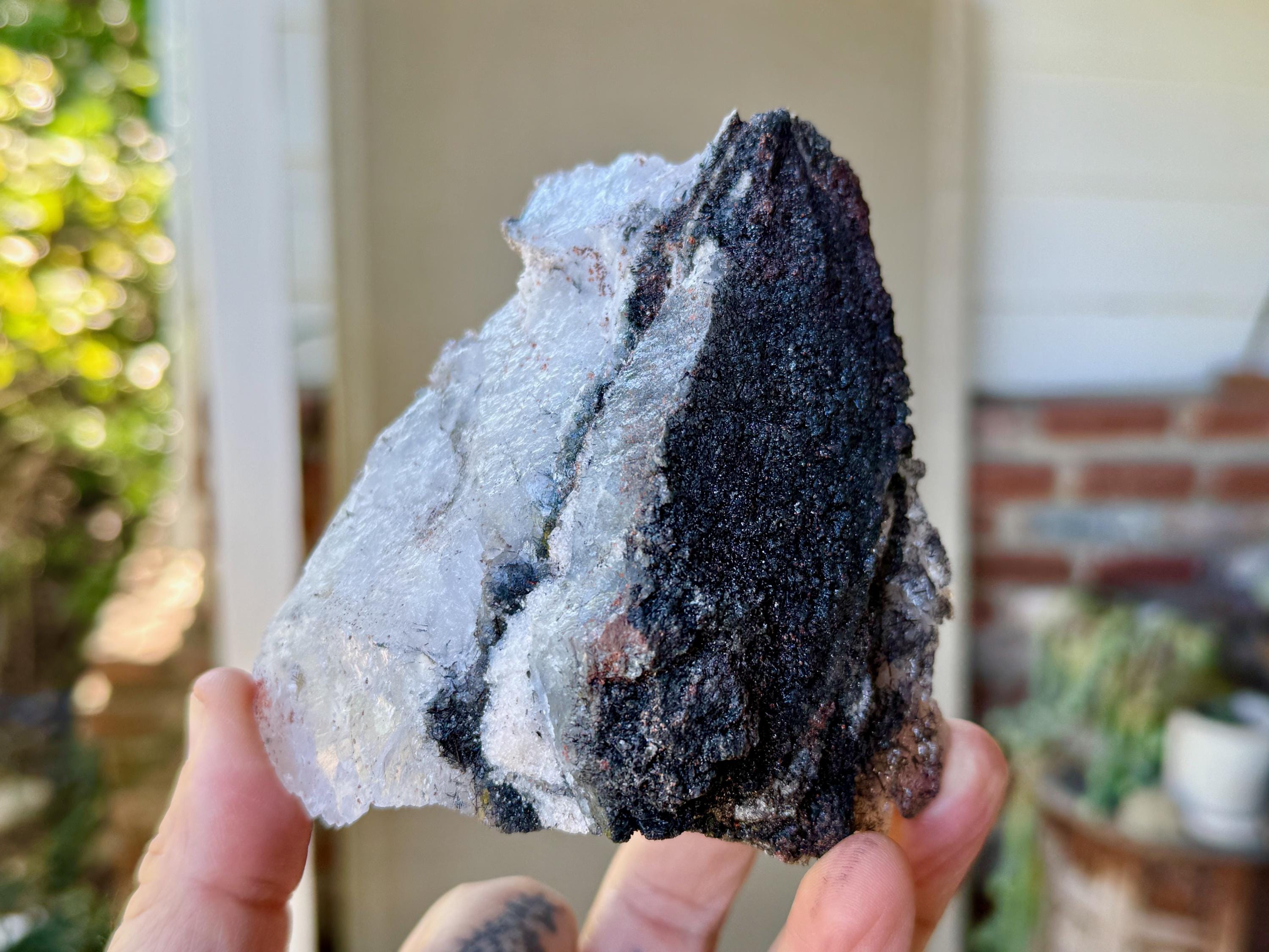One of the largest and most unique crystals from this collection, this is a beautiful "layer cake" of a Samhadi Quartz! We say that because it's a "wedge" formation with alternating layers of white Quartz and Black Tourmaline, that really resembles a slice of cake!
