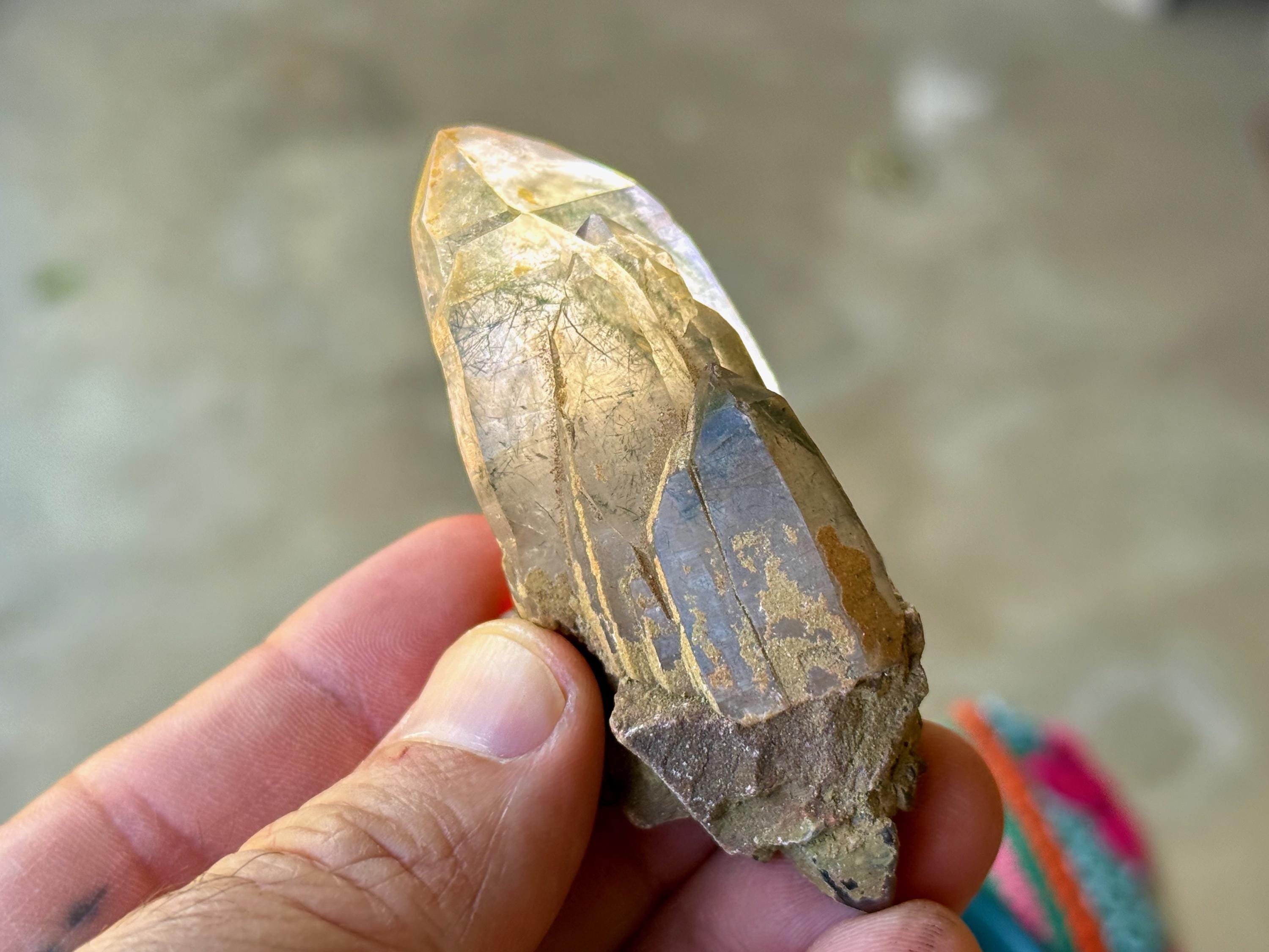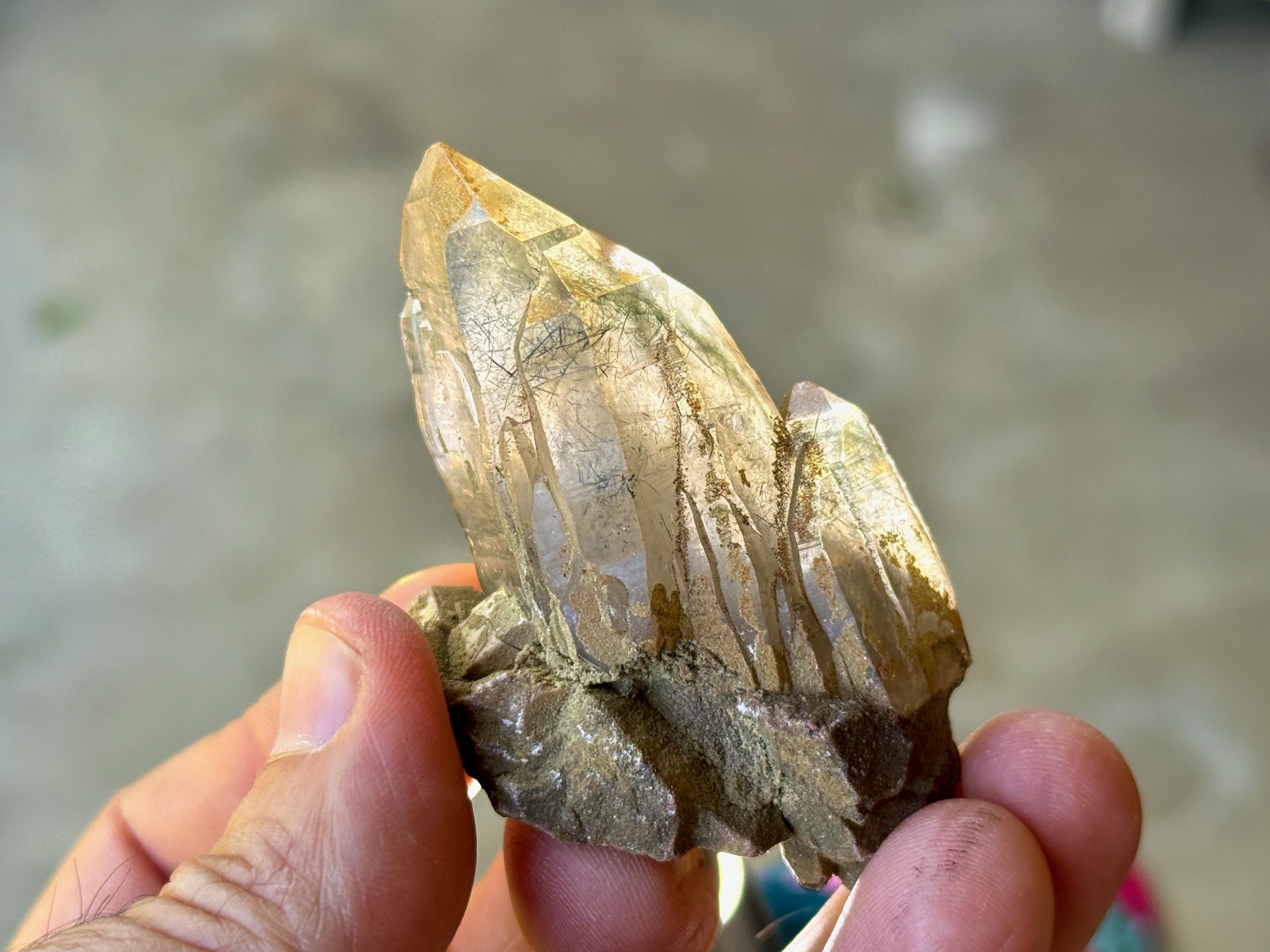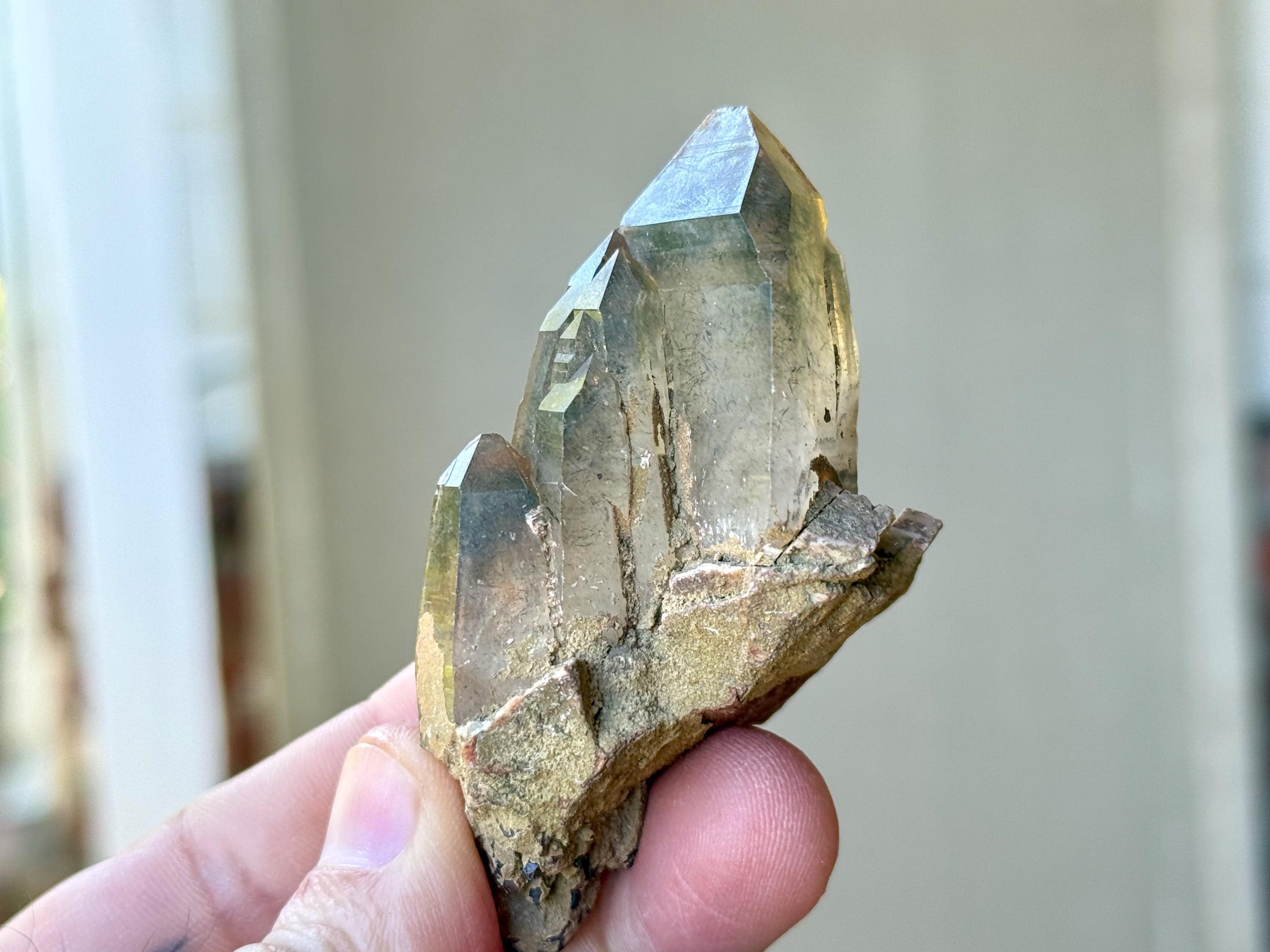 This crystal has a bit of matrix on the bottom that provides a base for it to sit nicely (at an angle). Excellent terminations.