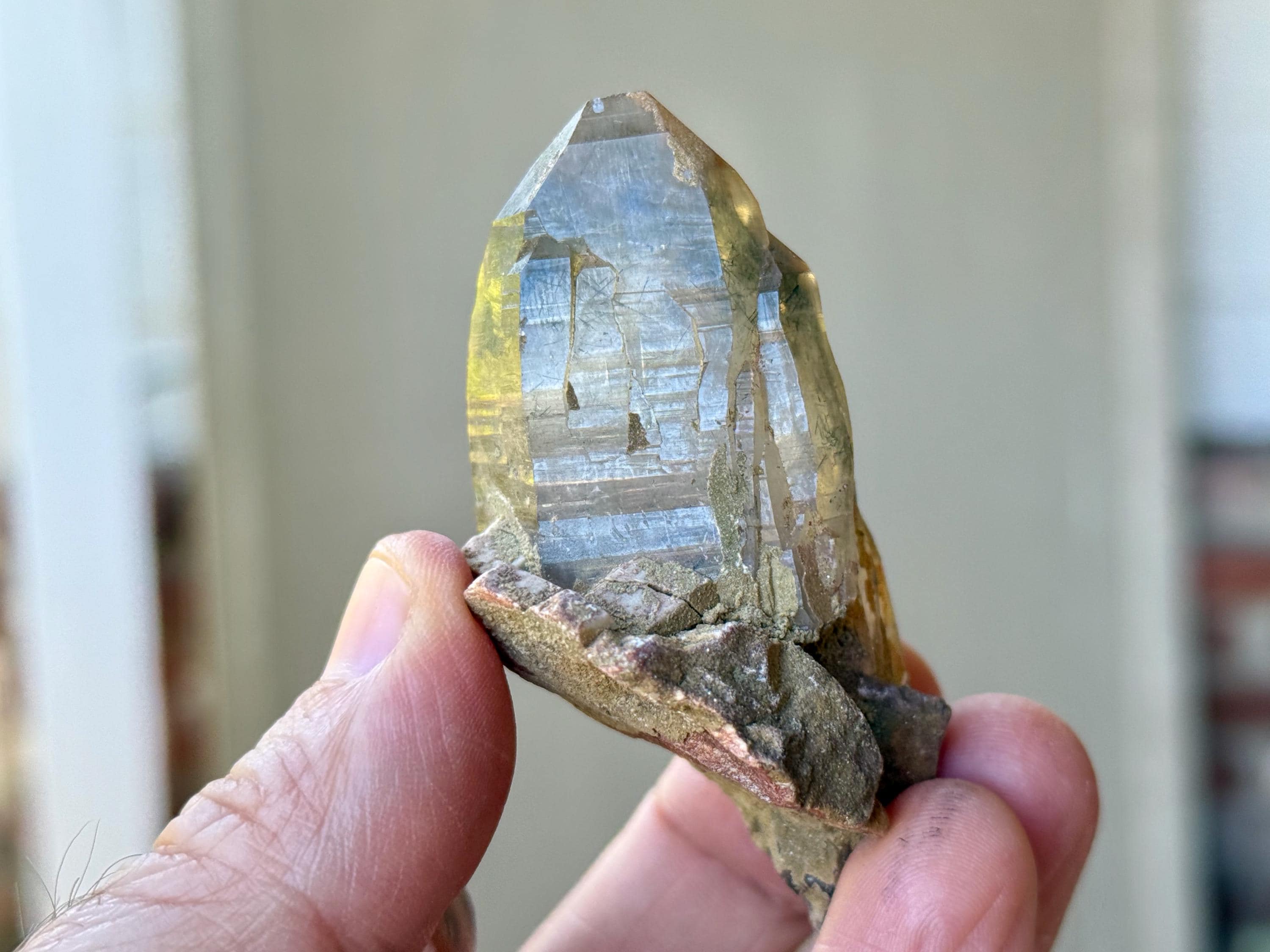 Marvelous luster and gradient smoky hues to this superb Cathedral Quartz crystal. The clarity is excellent, and when we peer within we can see needle-like inclusions of what we believe to be Aegirine. When backlit, as in Photos 3-4, these inclusions really become apparent.
