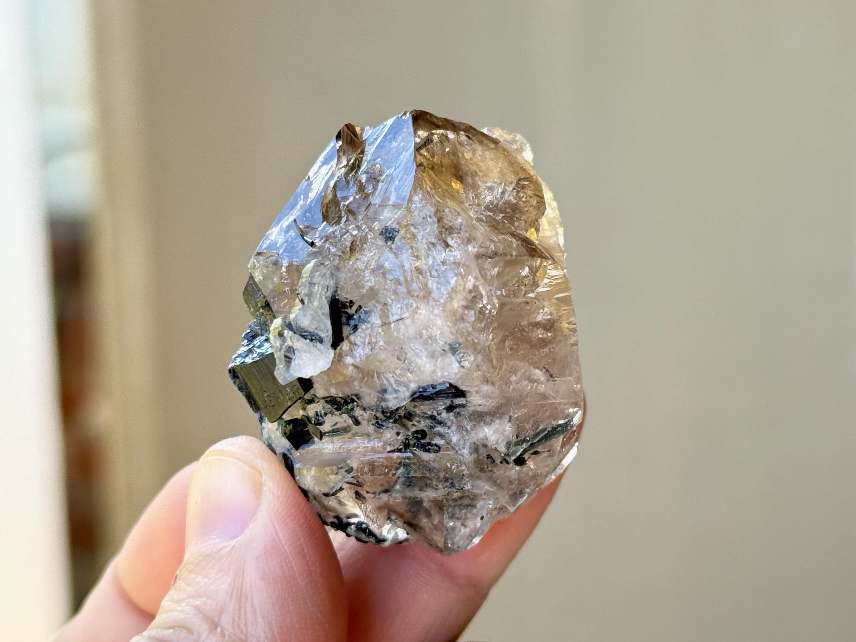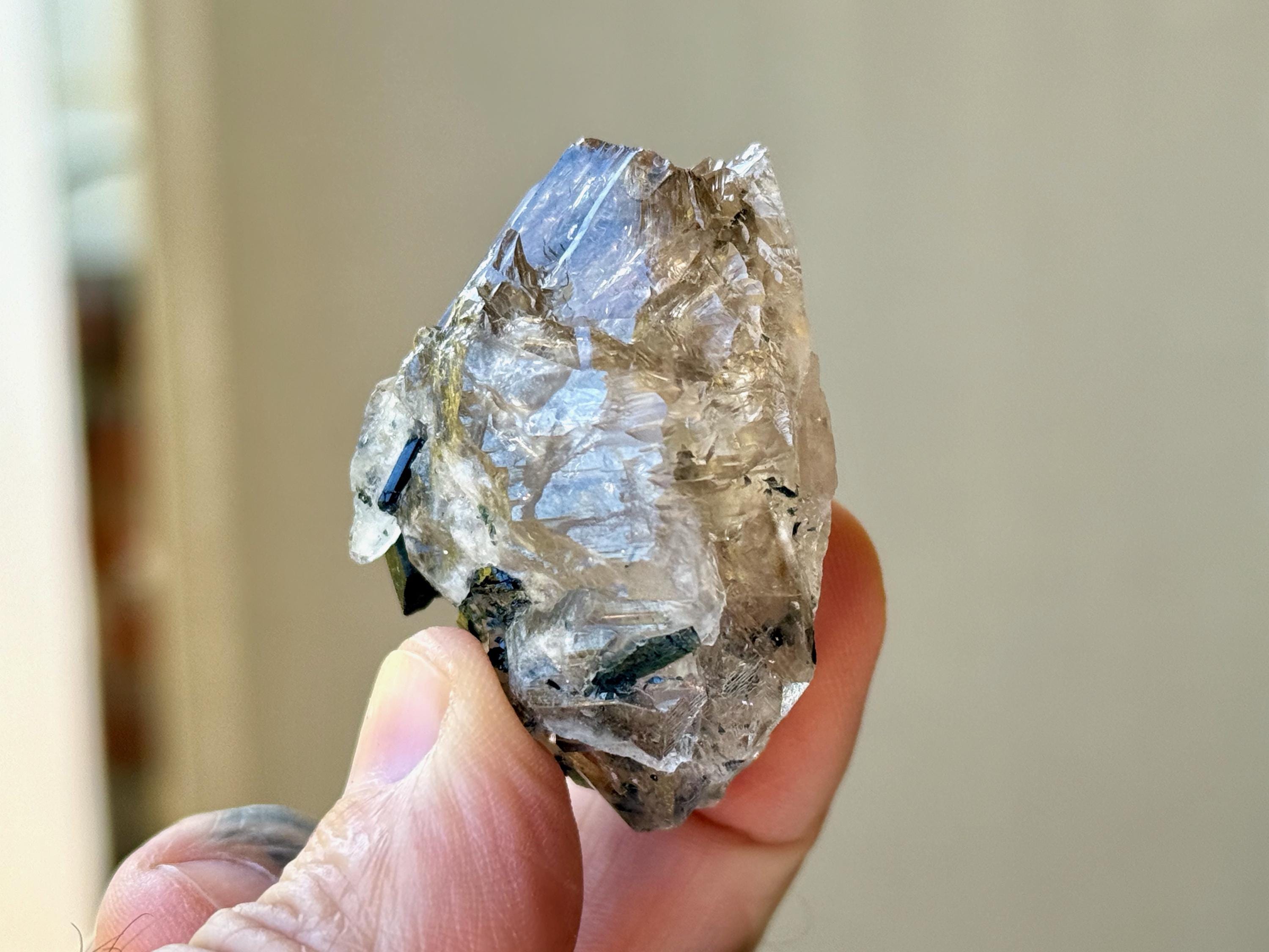 Tremendous luster to this superb Smoky Quartz crystal with pretty inclusions of Green, Blue and even Purple Tourmaline!