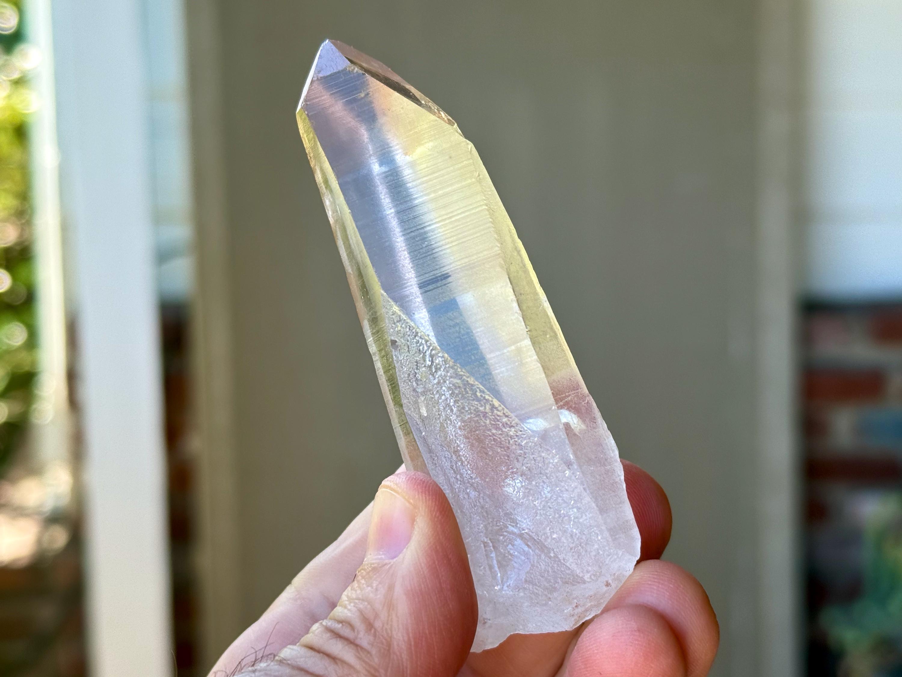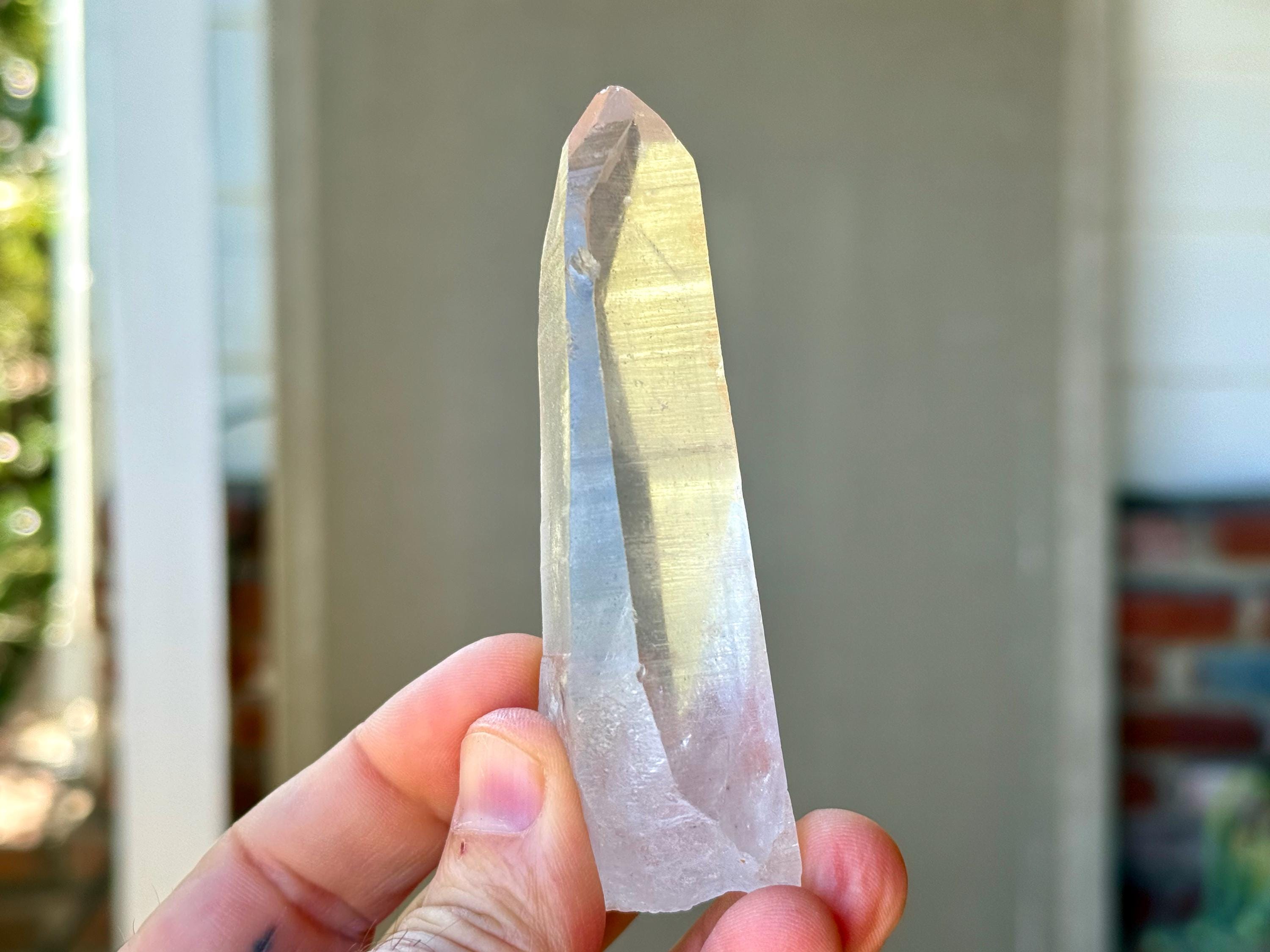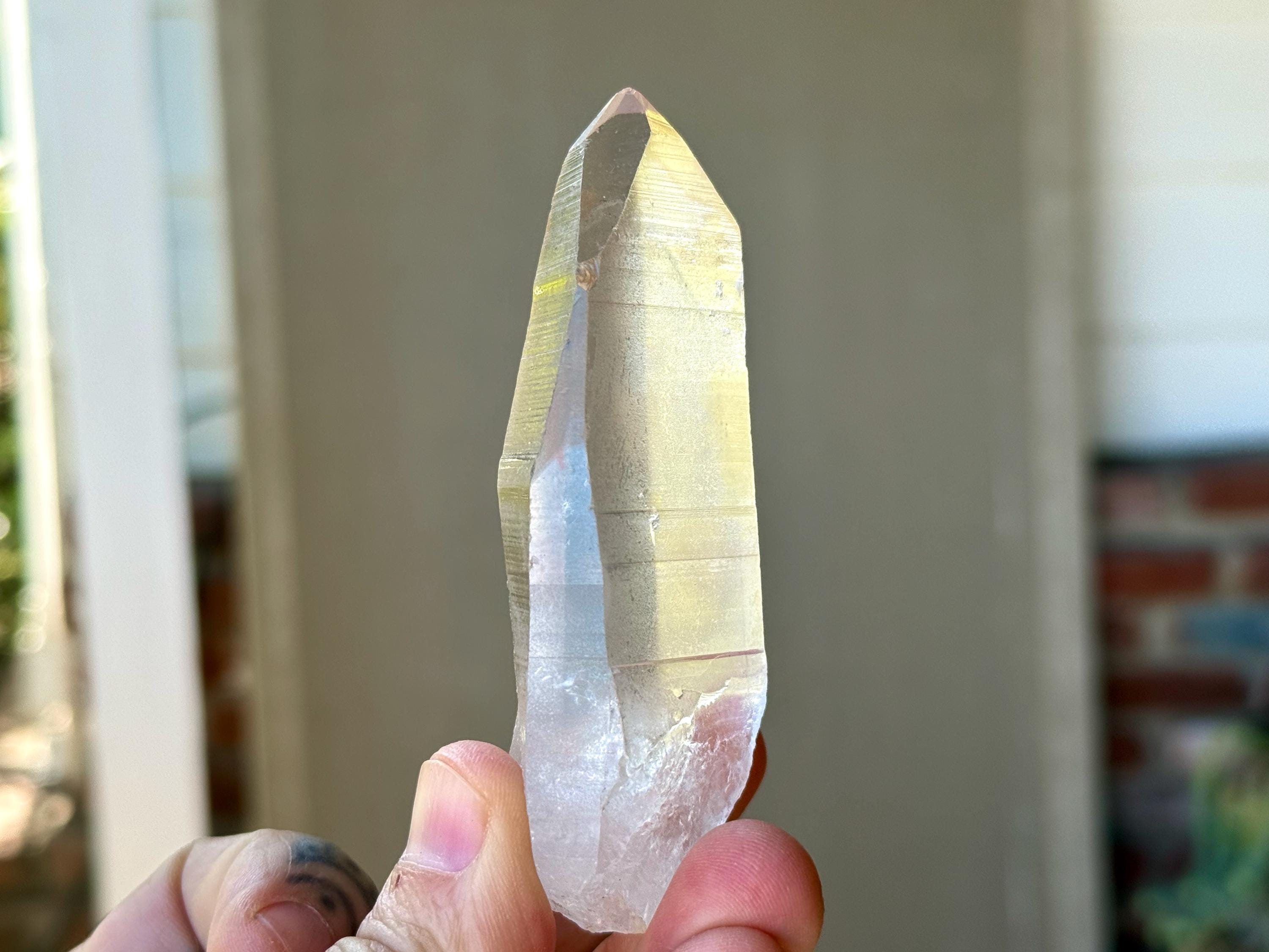 *Please note this crystal is clear and colorless with a *very* slight tinge of pink. Any yellow hues in the photos are a result of the natural sunlight reflecting off the crystal.